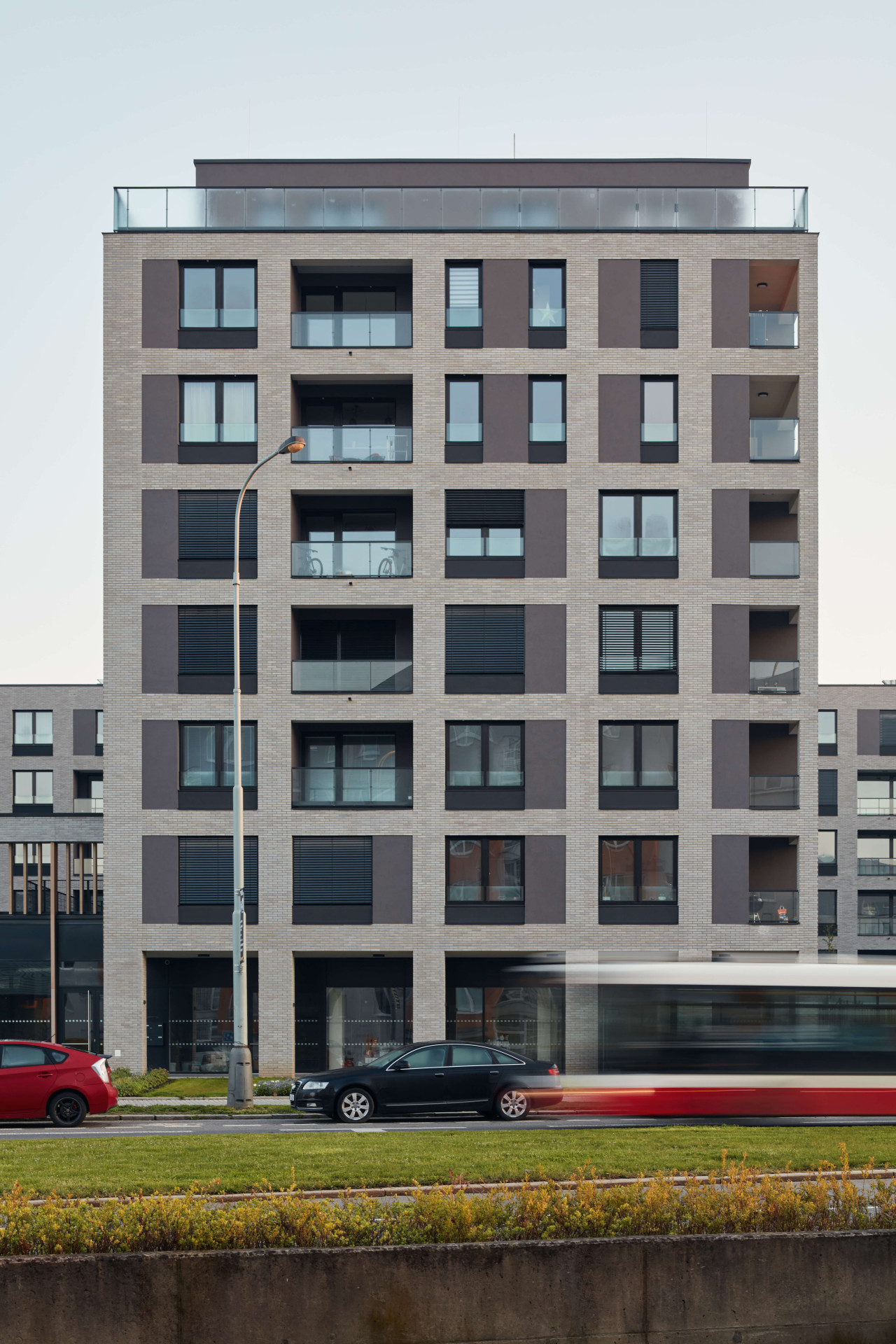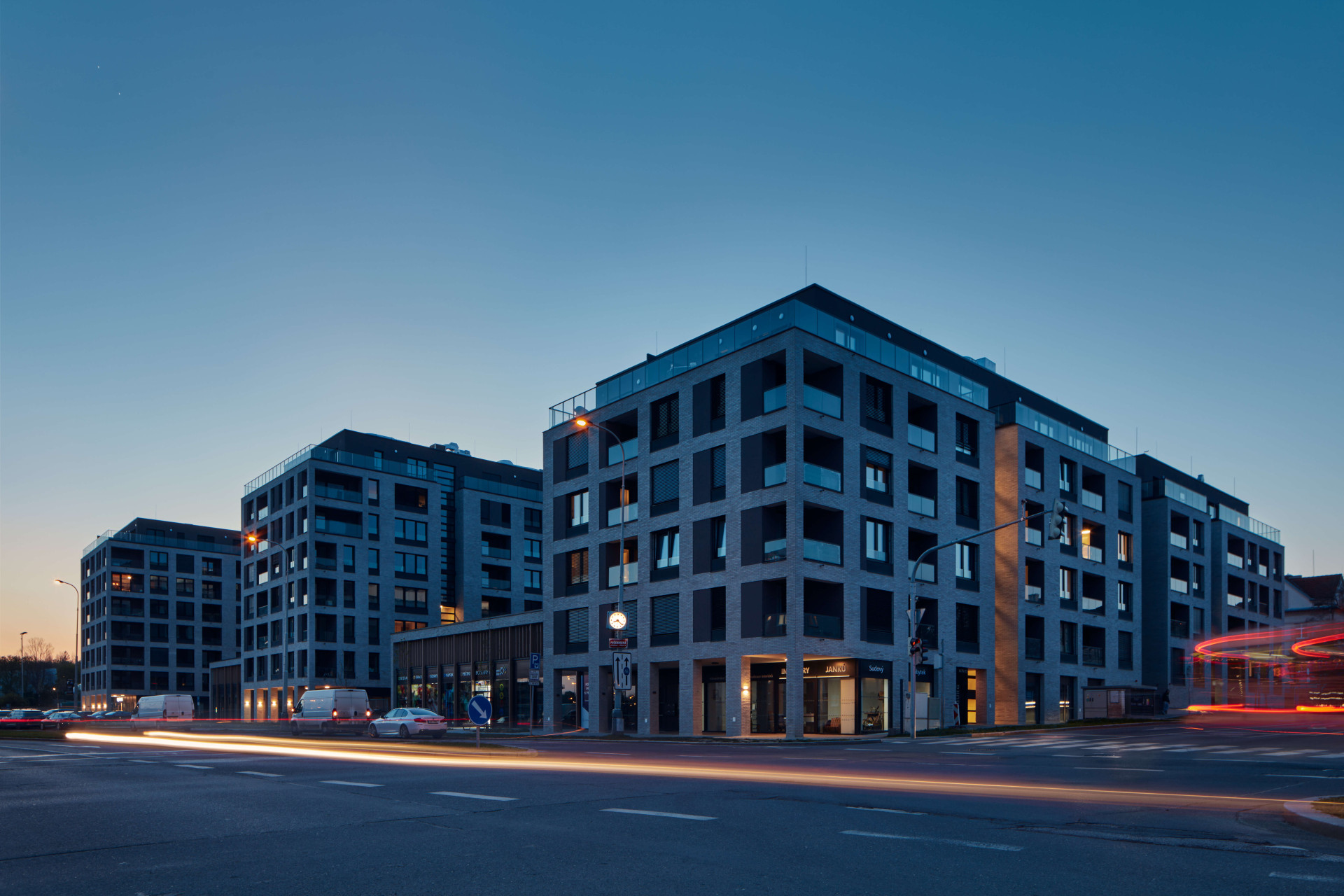 Na jedné straně dvou až třípodlažní vily, na druhé vysoké bytové domy. To je urbanistický kontext lokality pražských Strašnic, kde v posledních letech vyrostly nové rezidenční projekty developerské společnosti JRD Real Estate podle návrhu architektonického studia Podlipný Sladký architekti. „Obytný soubor je navržen ve formě polouzavřeného bloku s veřejně přístupným parterem, který je tvořen jednotlivými vzájemně navazujícími hmotami bytových domů a obchodních prostor,“ popisují základní schéma projektu architekti.