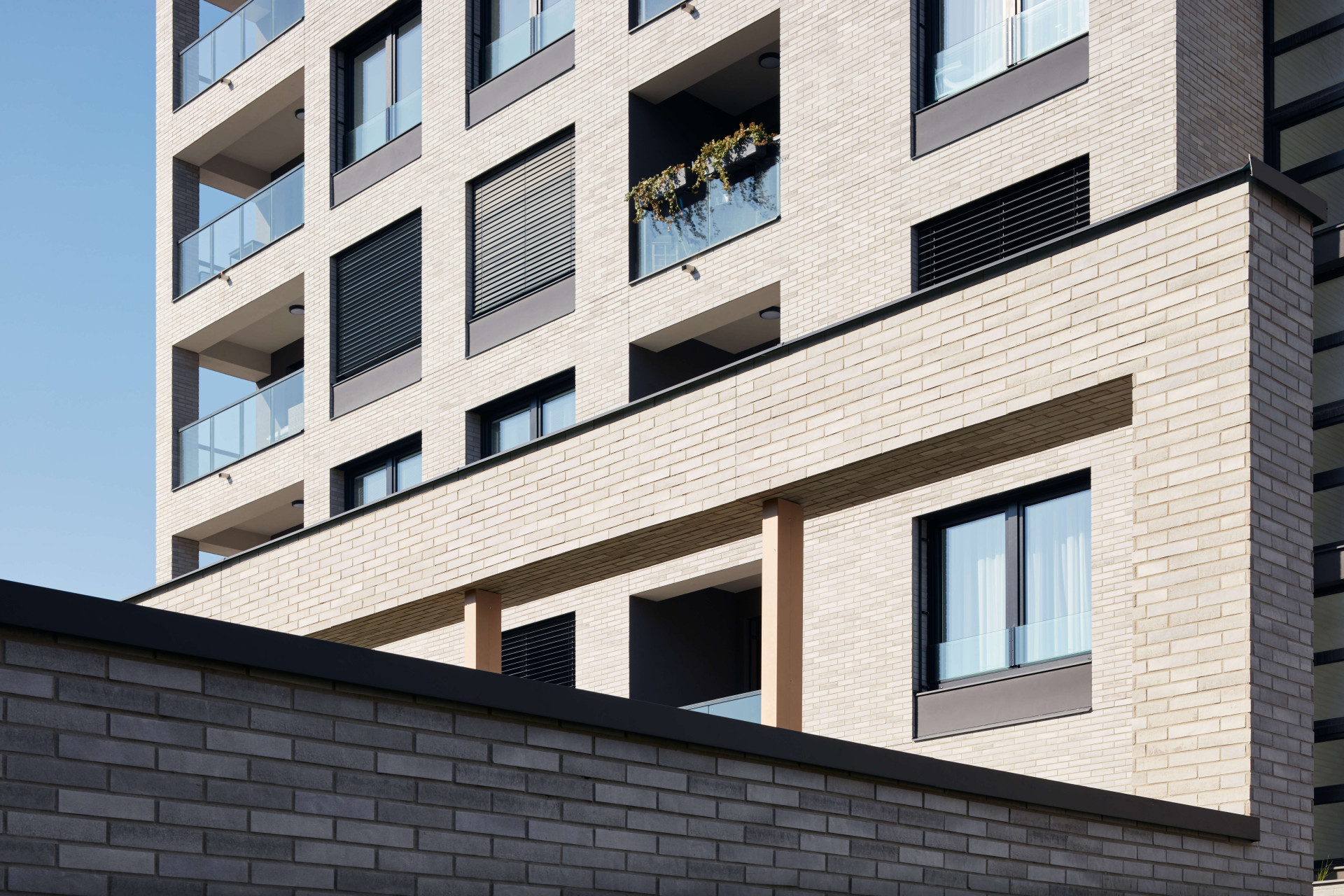 Všechny domy pracují se stejnými architektonickými prvky. Jedná se o jednoduché kubické hmoty s obvykle jedním ustupujícím podlažím, které mají pravidelný rastr fasád s okny a nikami lodžií. Exteriér budov pracuje především se dvěma materiály tvořícími barevný kontrast. Fasády jsou obloženy světlými cihelnými pásky se strukturovaným povrchem Stiltreu DF 4074 silber grau used look od společnosti Klinker Centrum, ve kterých vynikají lodžie s hladkou tmavou omítkou.