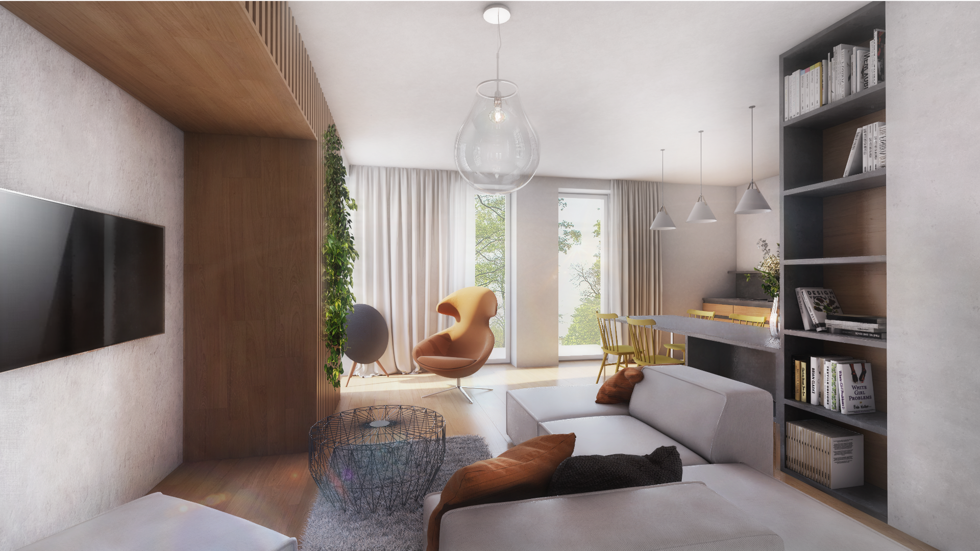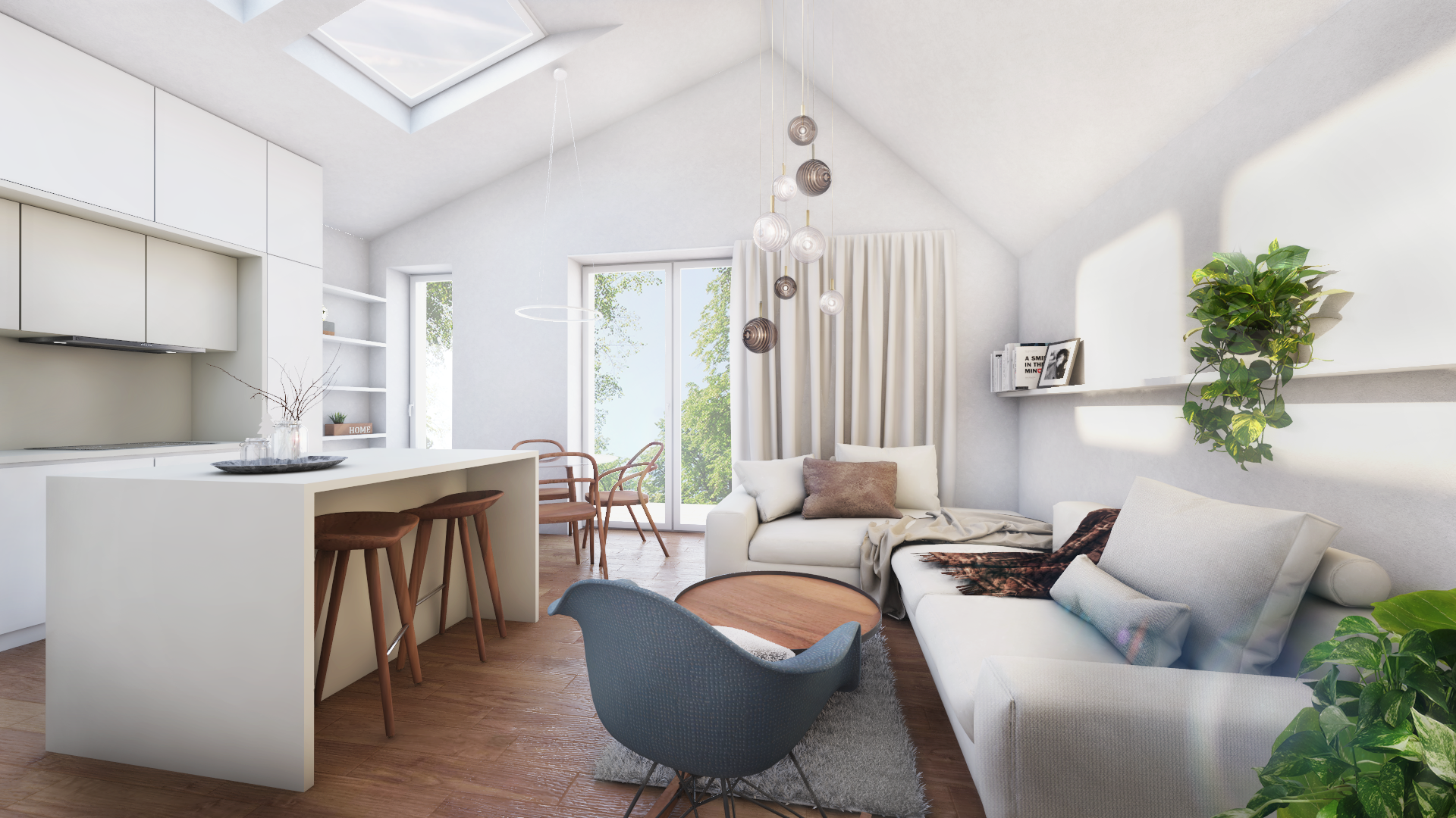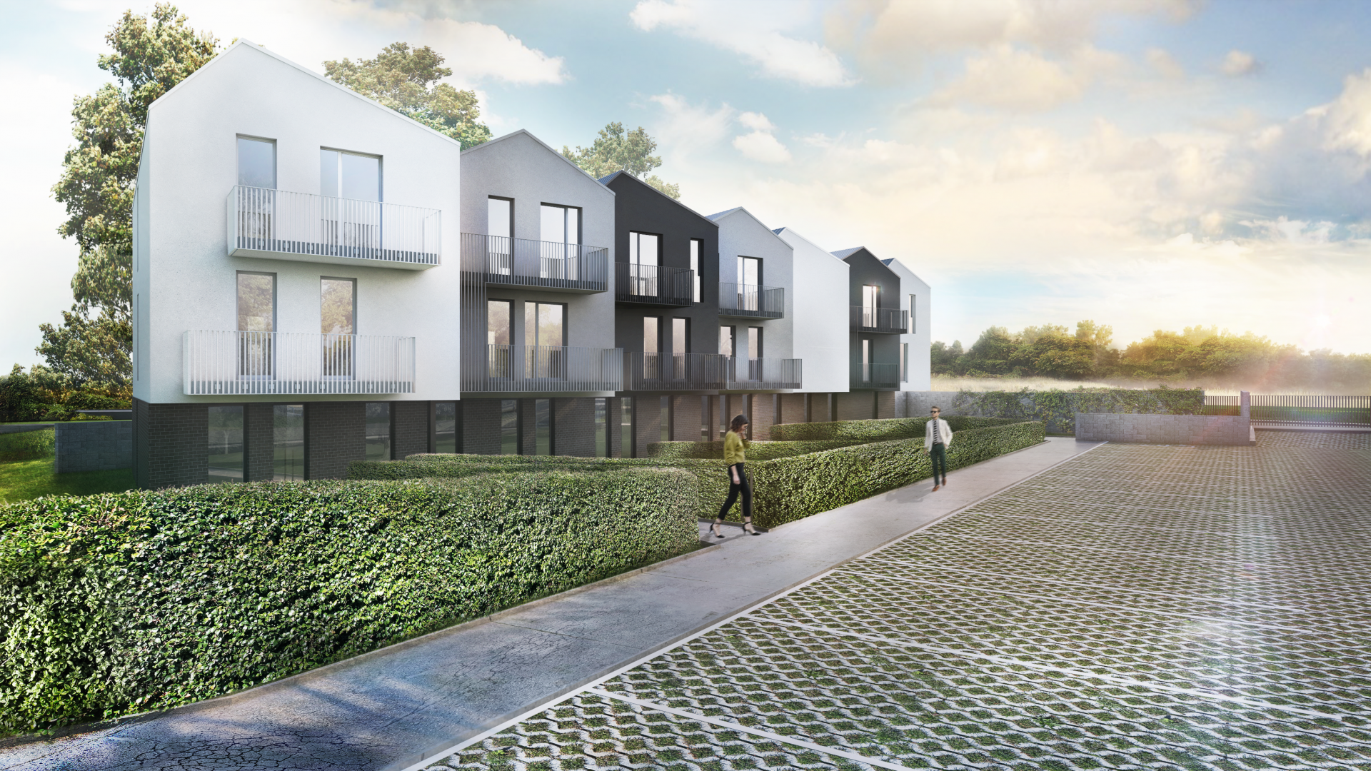 Domečky jsou řešeny v rámci své hmoty monochromaticky – barva fasády, rámů okenních výplní, klempířských i zámečnických prvků včetně zábradlí balkonů jsou sladěny do jednoho odstínu. Jen okenní rámy v podnoži jsou černé.