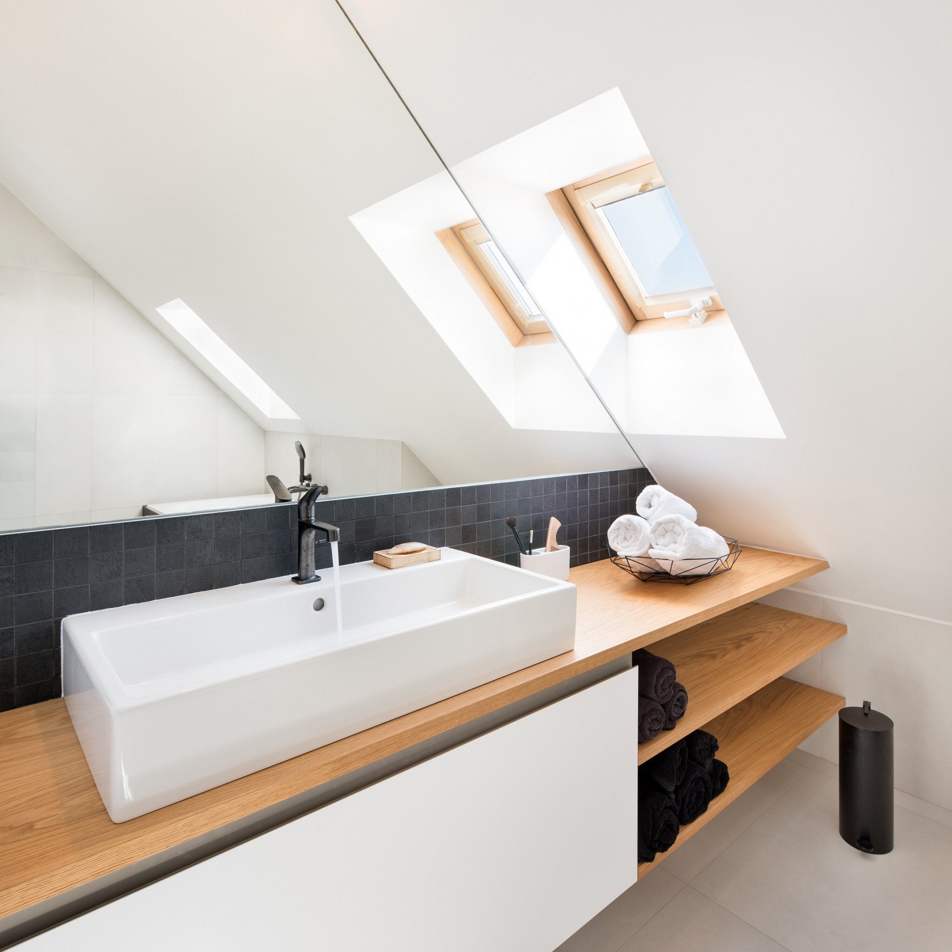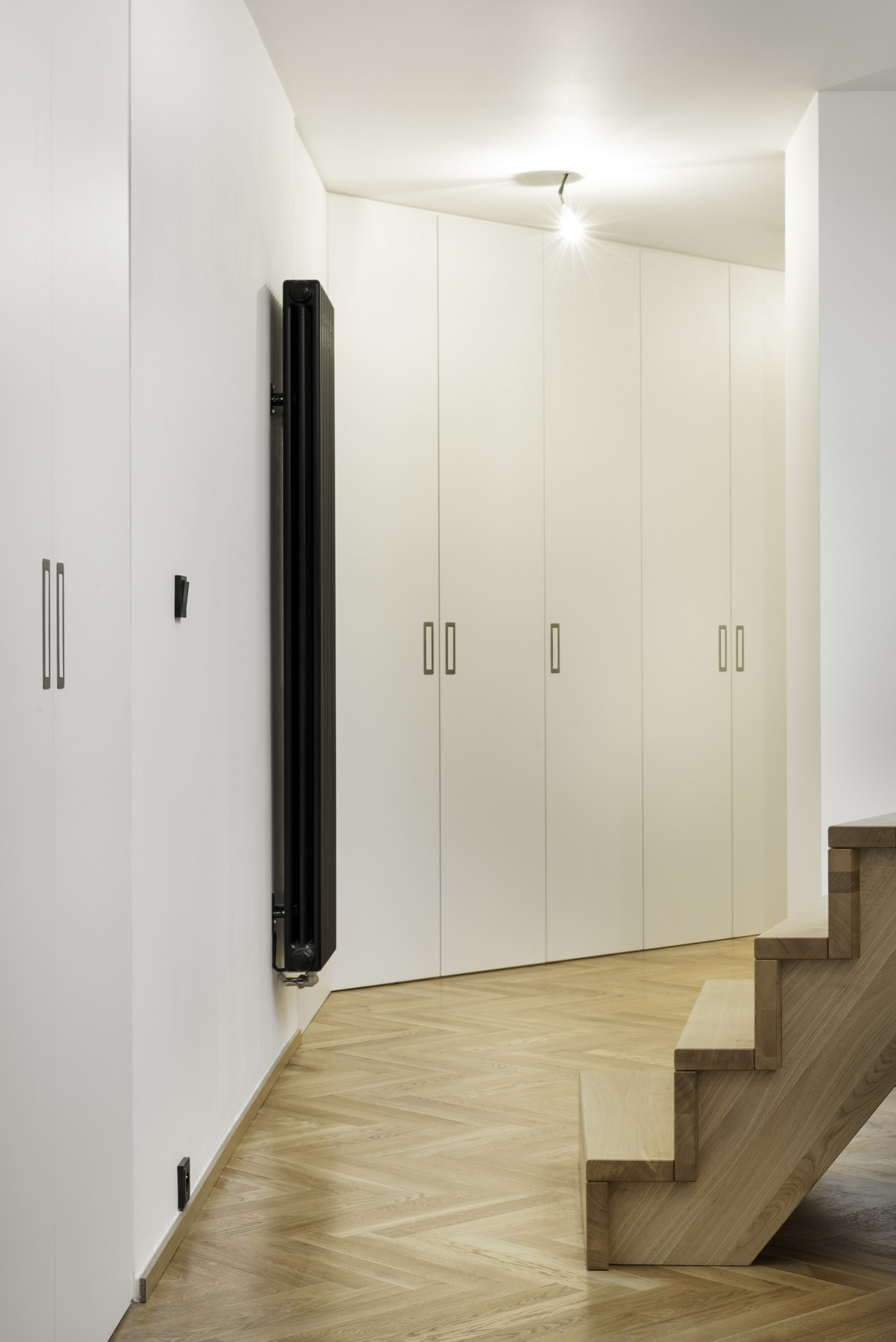 Černobílou kombinaci pak pohledově zjemňují a zútulňují dřevěné prvky v dubovém provedení, jako například podlaha, schodiště s dubovými nášlapy či masivní dubový nábytek na míru z dílny českých výrobců Stylishrooms. Puristickou barevnost bytu se podařilo zachovat i po jeho obydlení.