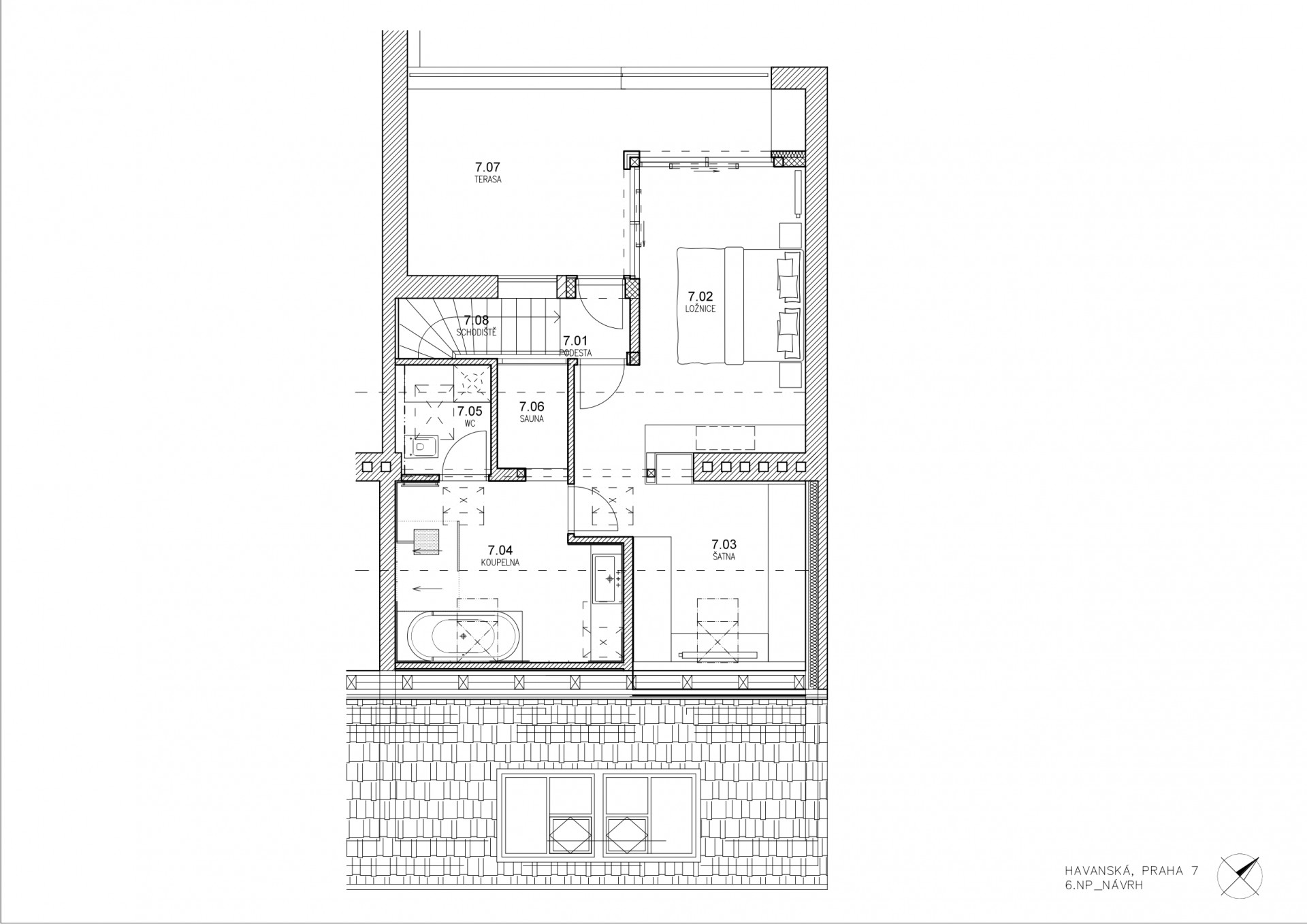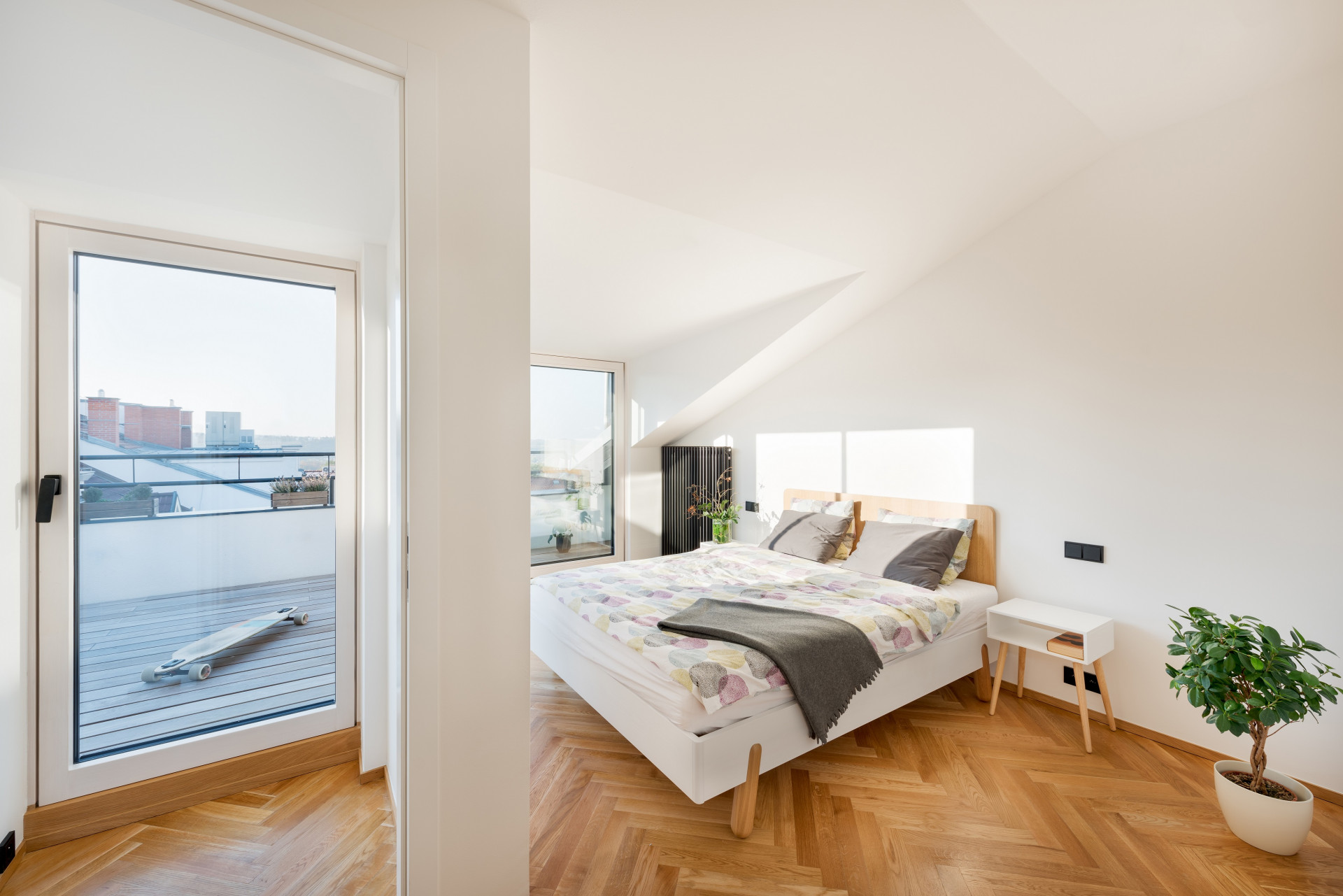 „Abychom mohli terasu co nejlépe propojit s interiérem, navrhli jsme zásah do střechy podkroví a vytvořili velkoplošné rohové zasklení ložnice. Jelikož se však činžovní dům nachází v památkové zóně, tento návrh jsme museli konzultovat s orgány památkové péče, u nichž musel projít schvalovacím procesem. Komplikací bylo i to, že horní patro mezonetového bytu bylo navíc součástí půdy, s jejíž krokvovou konstrukcí nebylo možné jakkoli hýbat,“ vysvětluje architektka.