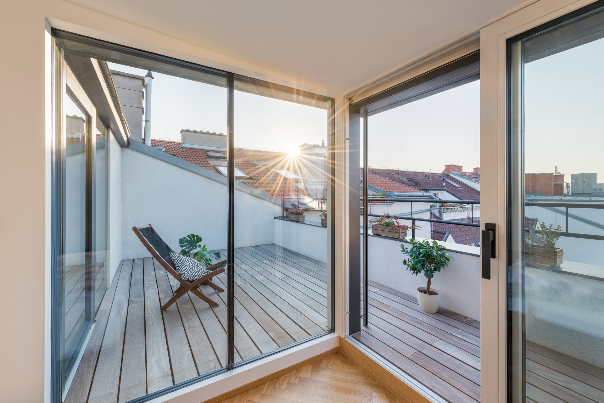 Prostor terasy se tak téměř zdvojnásobil, ovšem úprava střešní roviny, vytvoření vikýře a velkého prosklení byla v rámci průběhu rekonstrukce tou největší výzvou. „Problém nastal při otázce, jak budou tak velké prosklené plochy přepraveny do šestého nadzemního podlaží bez použití výtahu, který byl pro tyto účely příliš malý. Nové zasklení terasy, které pro tuto realizaci vyrobila firma Janošík, bylo tedy nakonec vyneseno ručně po schodech. Tomu se upravovaly i rozměry některých skel, aby je bylo na místo vůbec reálné dostat a aby s nimi byla snazší manipulace.“