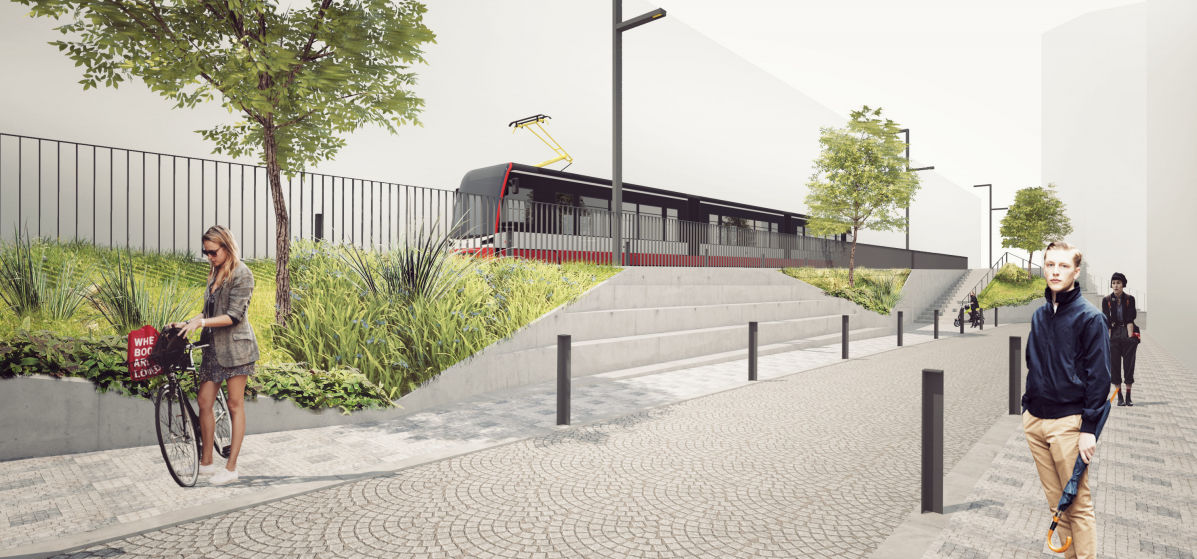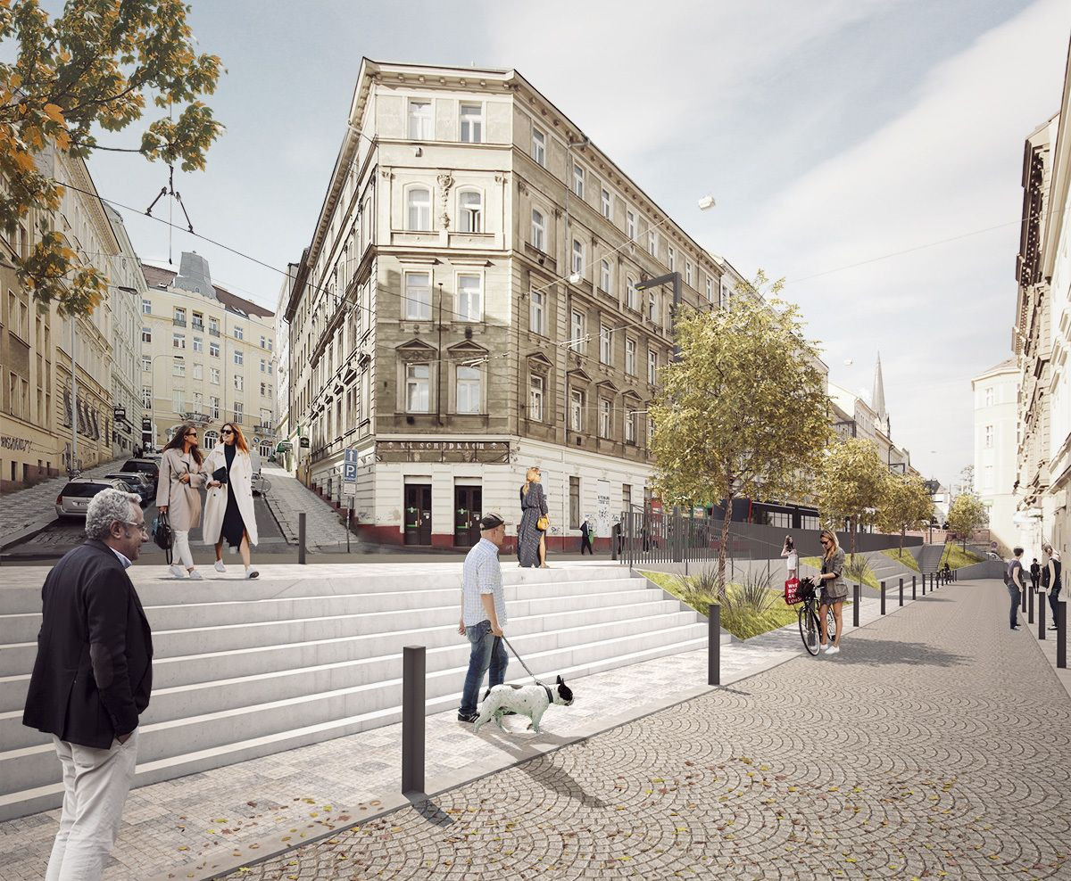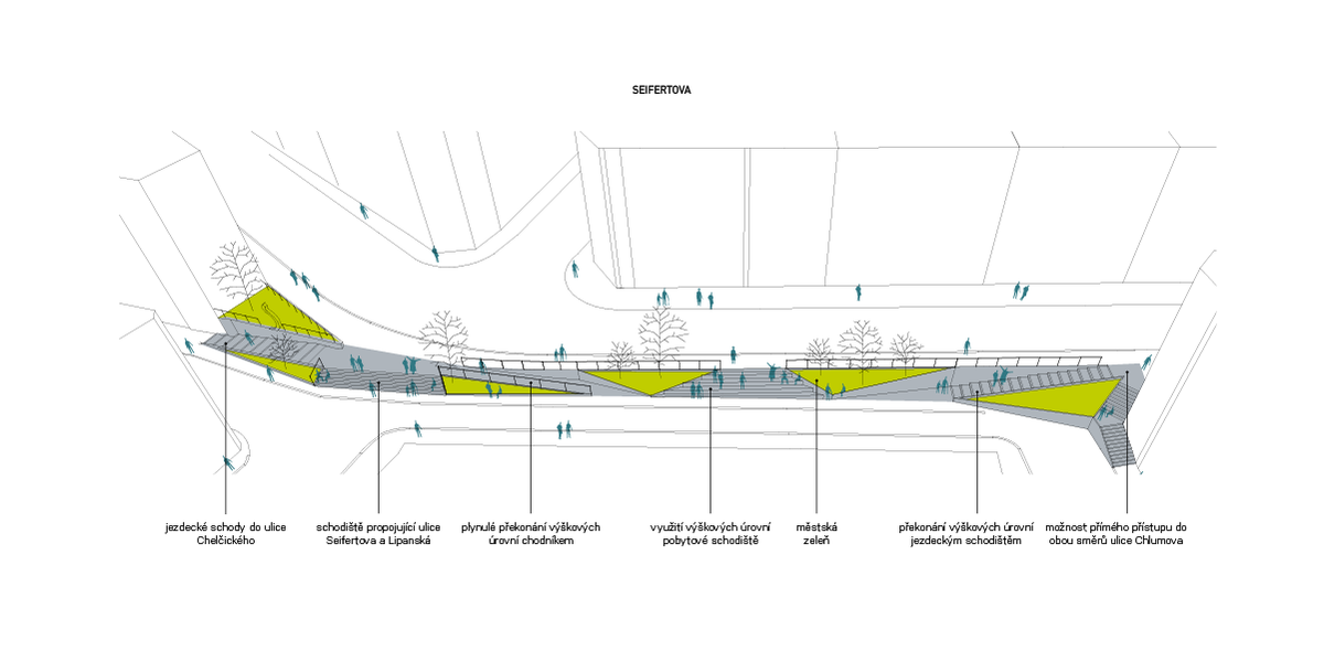 Návrh pomocí trojúhelníkových objektů osazených městskou zelení definuje pěší koridory překonávající výrazné výškové rozdíly. Geometrie trojůhelníku cituje existující zakončení žižkovského “Flatiron” u tramvajové zastávky, kde je umístěn památník Jaroslava Seiferta. Schodiště u pomníku bude významně rozšířeno a bude změněn jeho směr, aby došlo k přímému propojení.Zároveň jsou doplněny dvoje jezdecké schody a chodník pro bezbariérový přístup.Trojúhelníkové plochy slouží jako uvození pěších tras. Jsou to betonové prefabrikované prvky ve kterých je umístěna zeleň.