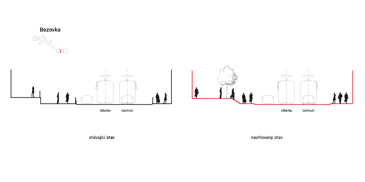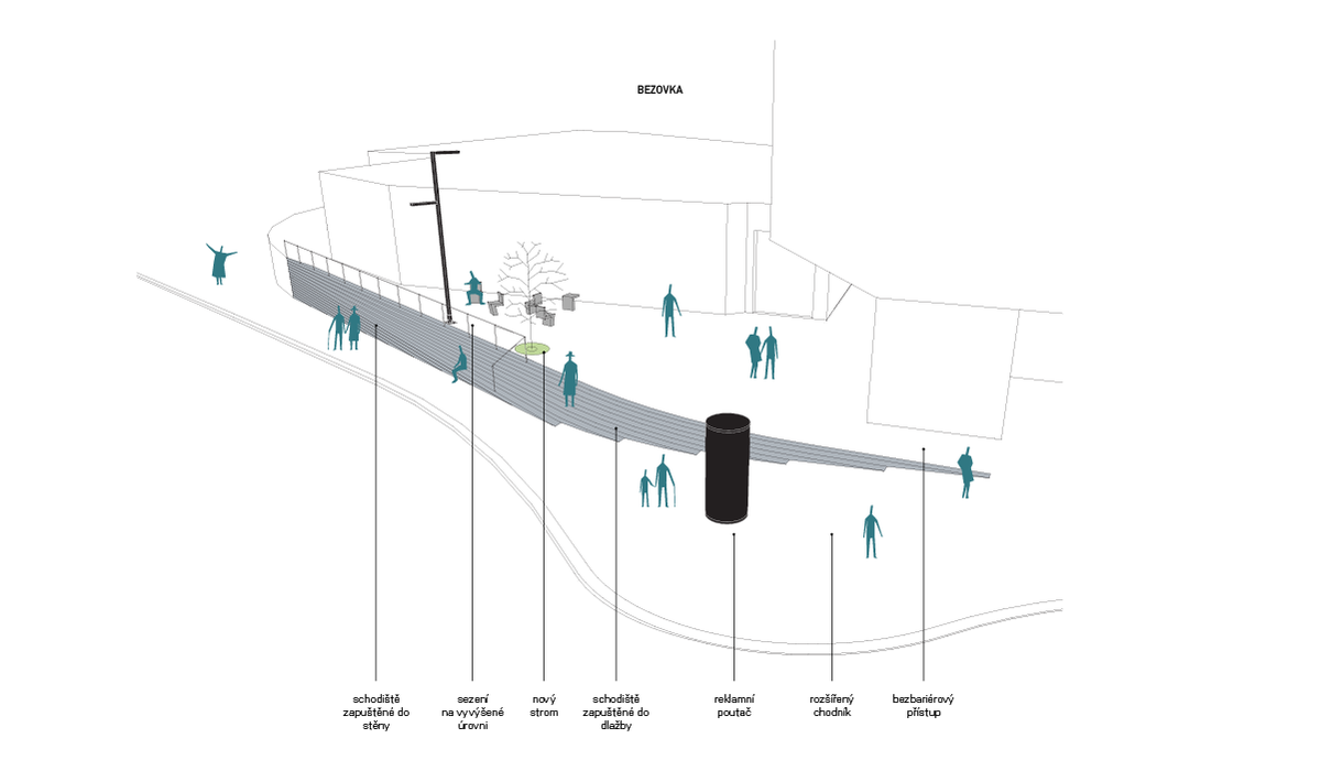 Diody bude možné ovládat a nastavovat různé svítící obrazce (buď v určitém časovém intervalu nebo po delší časový úsek). Podobně jako v prostoru Seifertovy je i u Bezovky výšková bariéra v podobě zdi podzemních garáží. Proto je v návrhu prostor chodníku a předprostor Bezovky propojen pomocí nového schodiště, které se pozvolna zapouští do terénu. Zároveň přístup k Bezovce zůstává bezbariérový i v případě vyplnění parteru obytného domu komerční jednotkou - chodník je předsunut před nosný pilíř budovy.Prostor je doplněn o prvky drobné architektury pro zvýšení obytnosti ulice: lavičky, nový strom, mobiliář v podobě reklamního nosiče, zábradlí, dopravních sloupků.