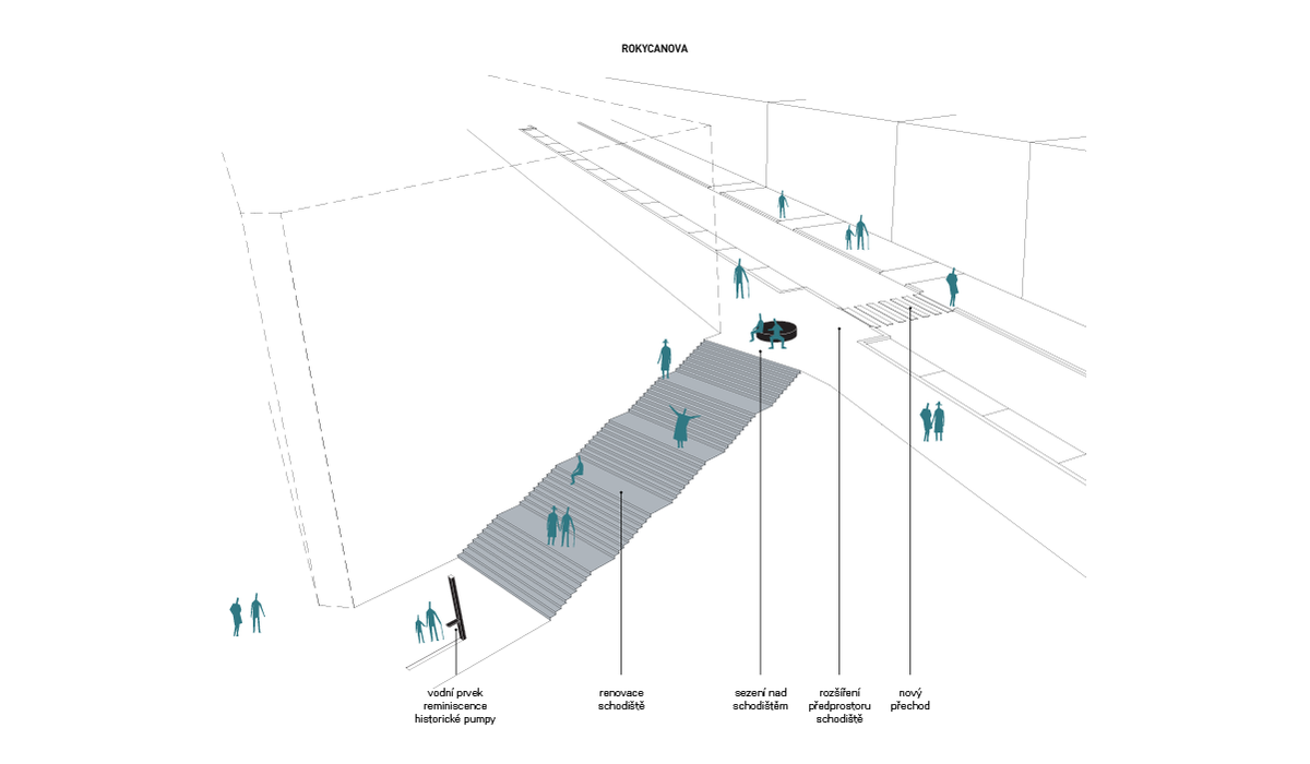 Historické schodiště ponecháváme ve své stávající formě. Navrhujeme jeho obnovu v původním tvaru a doplnění o prvky drobné architektury - sezení v horní části ve tvaru “mísy” a vodní prvek v jeho spodní části jako reminiscence historické pumpy. Čela schodišťových stupňů jsou opatřena led diodami, které schodišti ve večerních hodinách dodají jinou atmosféru.