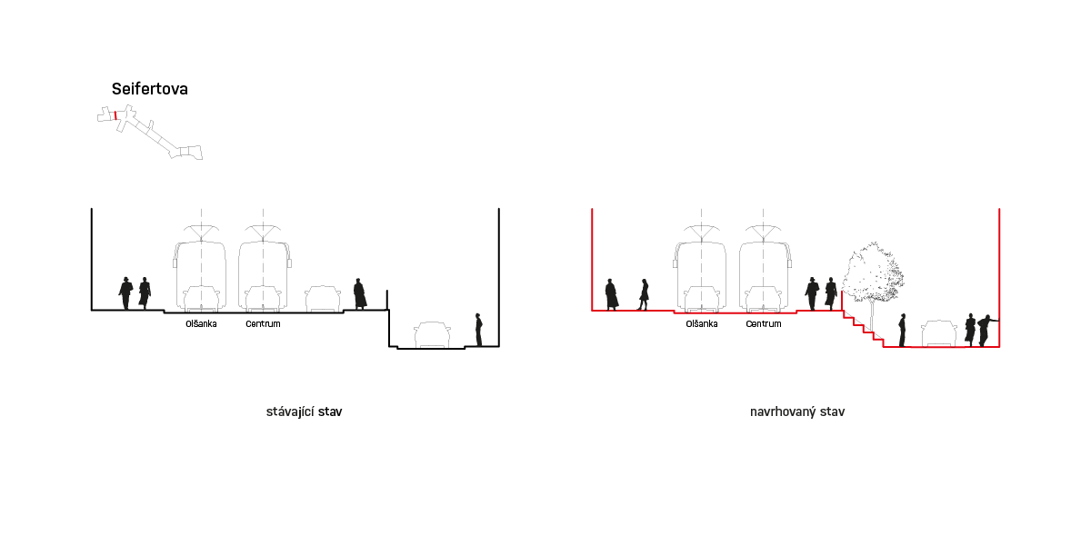 Předmětem soutěže bylo koncepční řešení veřejného prostoru při tramvajové zastávce Lipanská, s ohledem na navazující části Seifertovy a Táboritské ulice. Soutěž jsme vyhráli a v rámci fáze studie jsme soutěžní návrh doplnili o komplexní řešení všech navazujících veřejných prostor dle zadání IPR. Úprava Seifertovy spočívá ve větším propojení dvou výškových úrovní - ulice Seifertova a Chlumova, v plynulejší průchodnosti území pro chodce a ve zpomalení provozu automobilové dopravy. Prostor se vyznačuje výškovým rozdílem ulic Seifertova a Chlumova, hrana mezi těmito dvěma ulicemi tvoří bariéru.