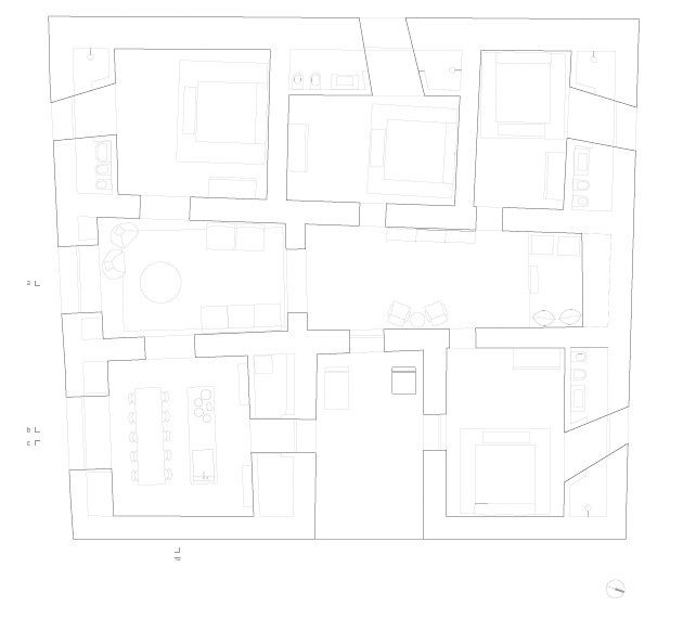 Vzdušný interiér prázdninového domu tvoří čtyři ložnice sloužící jako jednotlivé apartmány a mramorová kuchyň. V pokojích je umístěno jen pár základních kusů pečlivě vybraného nábytku a bytových doplňků. O to lépe designové předměty vyniknou na pozadí čistě bílých stěn.