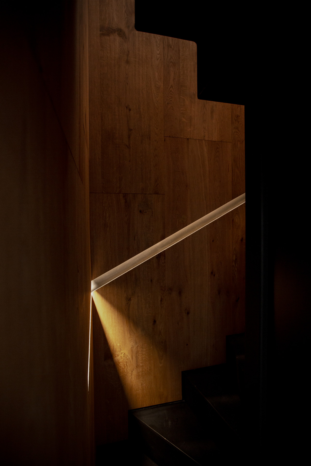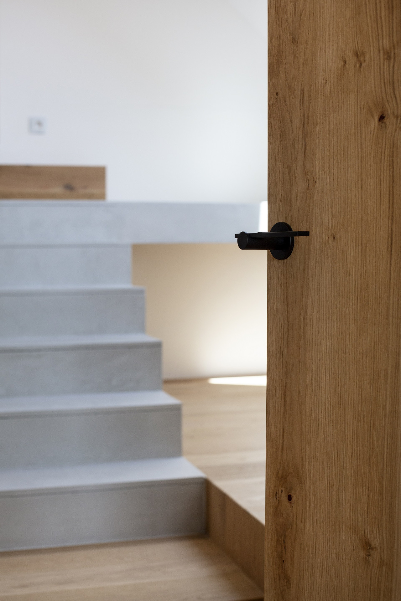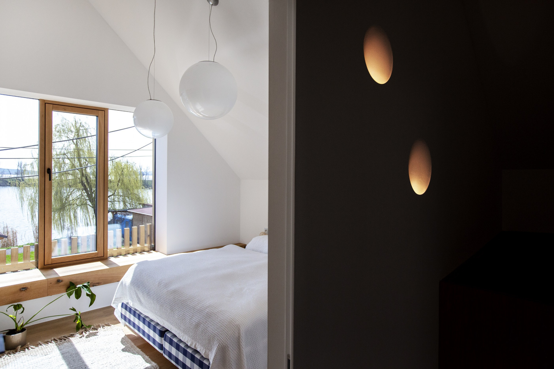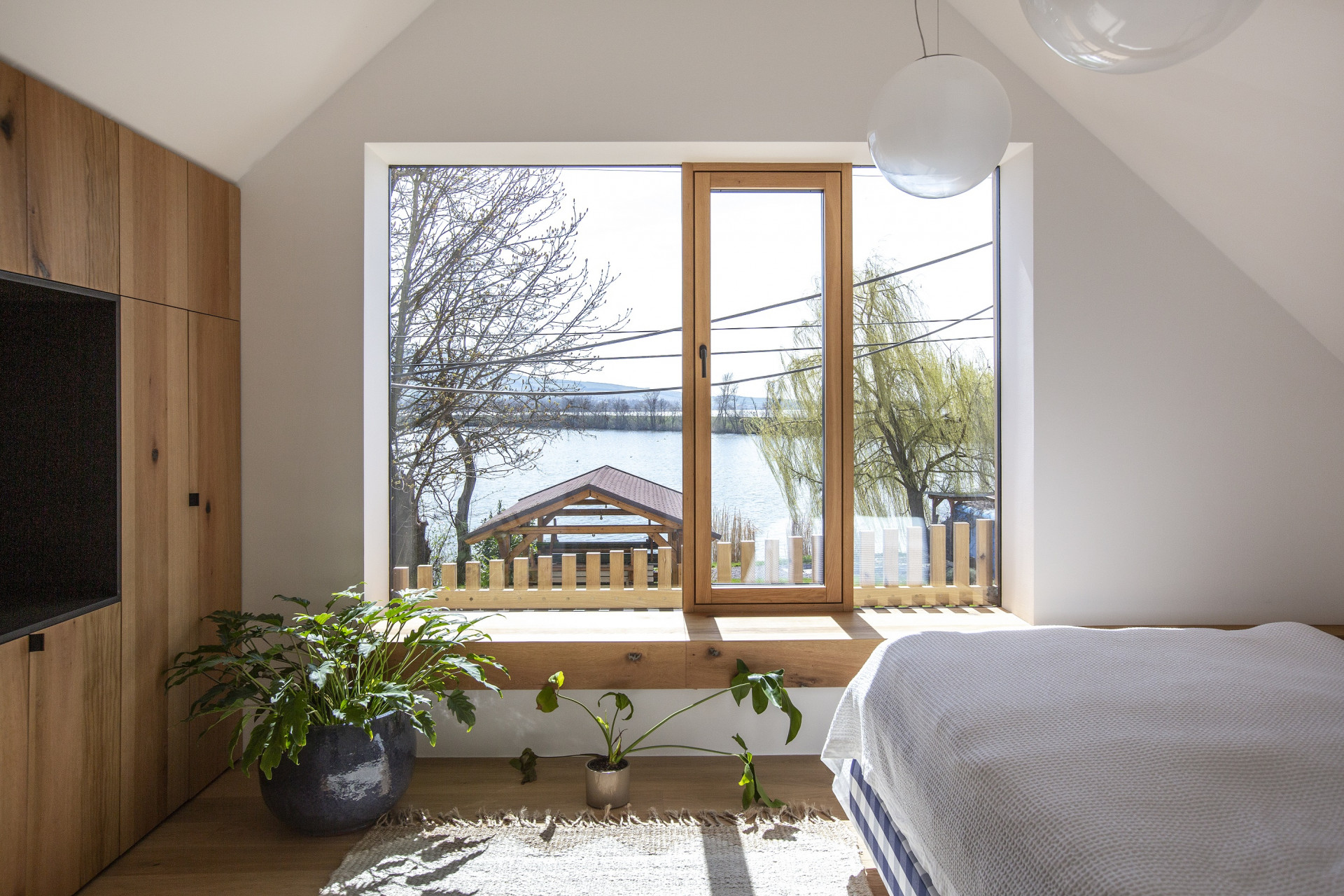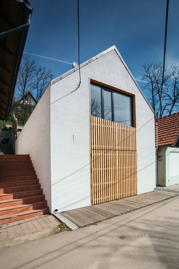 Zvenčí velká okna maskují dřevěné okenice a zábradlí, které napomáhá moderní dům zapojit do okolního architektonického kontextu. „Budova je navržena tak, aby splňovala veškeré nároky na moderní bydlení a rekreaci, avšak se zachováním lokálního tvarosloví s využitím tradičních konstrukcí: stěny jsou zděné cihelné, krov dřevěný a střecha z pálených tašek,“ dodává architekt.