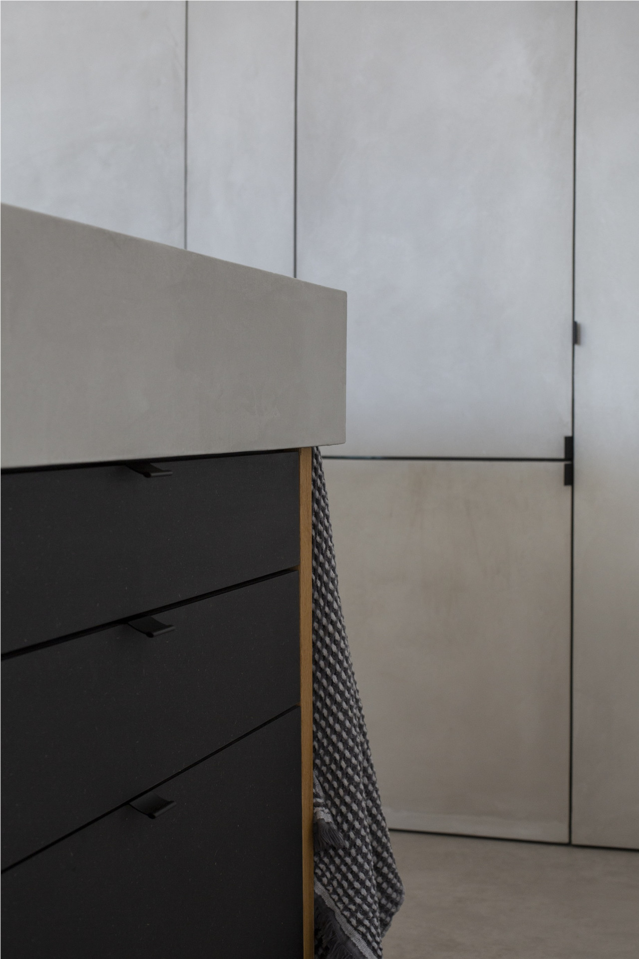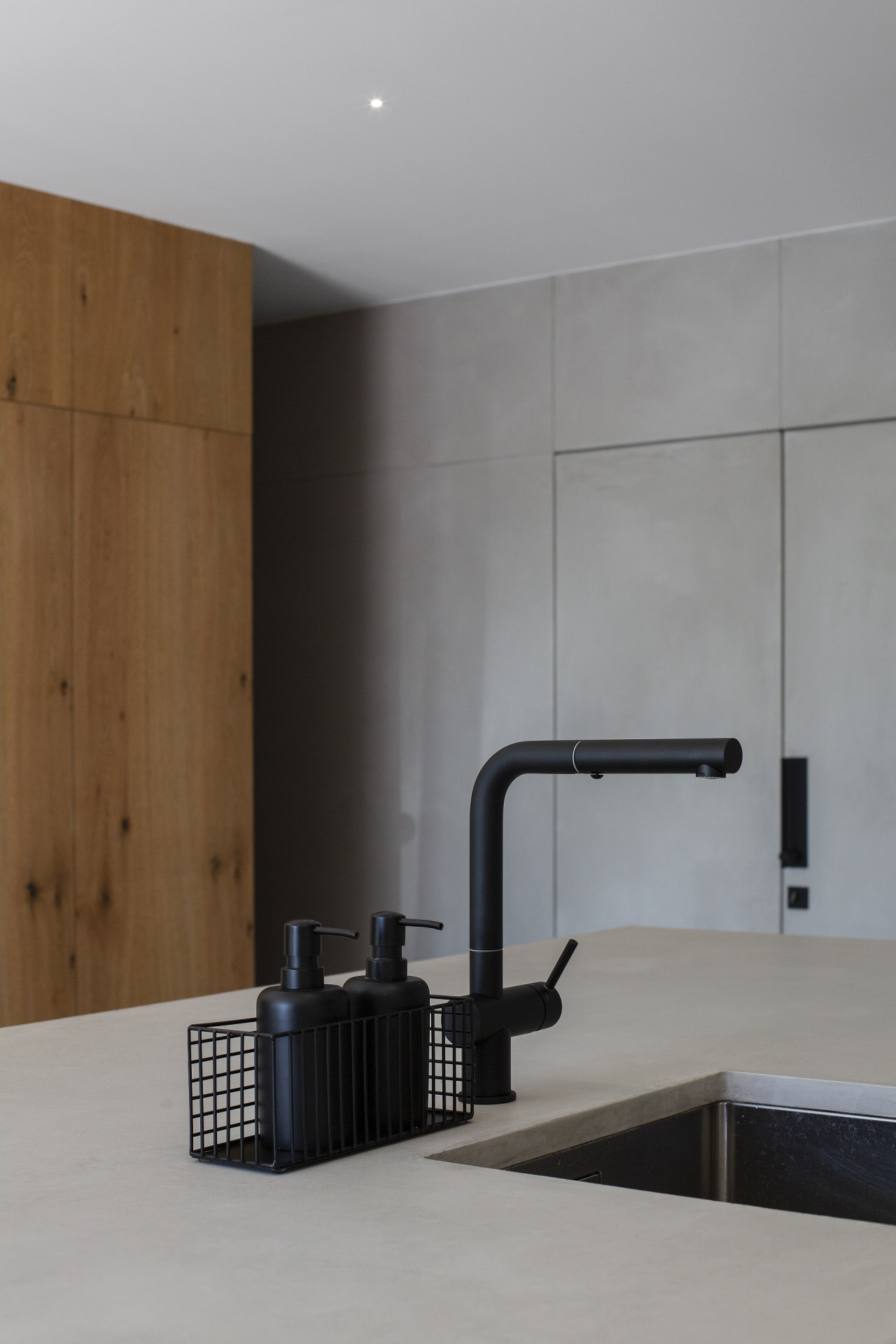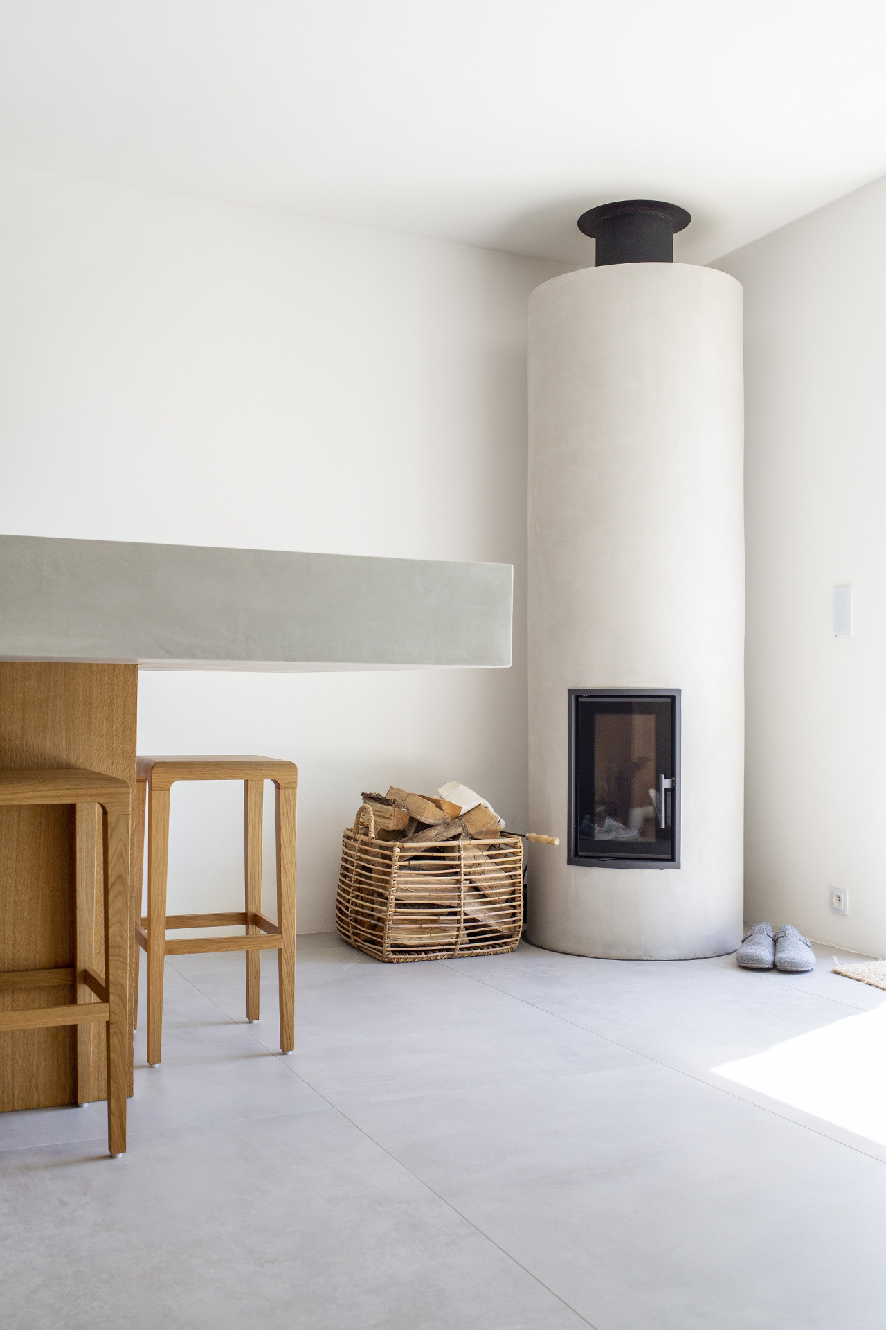 Vzhledem ke komplikovaným vnitřním rozměrům sáhl František Brychta k vybavení na míru, které překvapí svým multifunkčním charakterem. Za materiálovým řešením stojí česká firma Qualibau, která se zabývá úpravou vnějších i vnitřních povrchů a snaží se přinášet ta nejlepší a nejmodernější řešení. Interiér domu ve Strachotíně je laděný do přírodních barev – s teplými odstíny dřeva kontrastují studené betonové stěrky. Drobné prvky jako dveřní kování nebo kuchyňská baterie mají povrchovou úpravu v černém matu. Srdcem domu se stal krb, který je díky svému neobvyklému válcovému tvaru skutečným výtvarným prvkem interiéru.