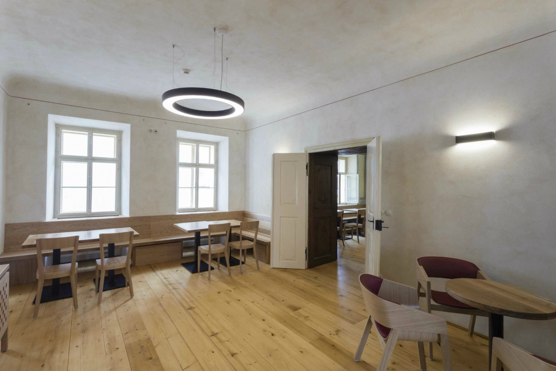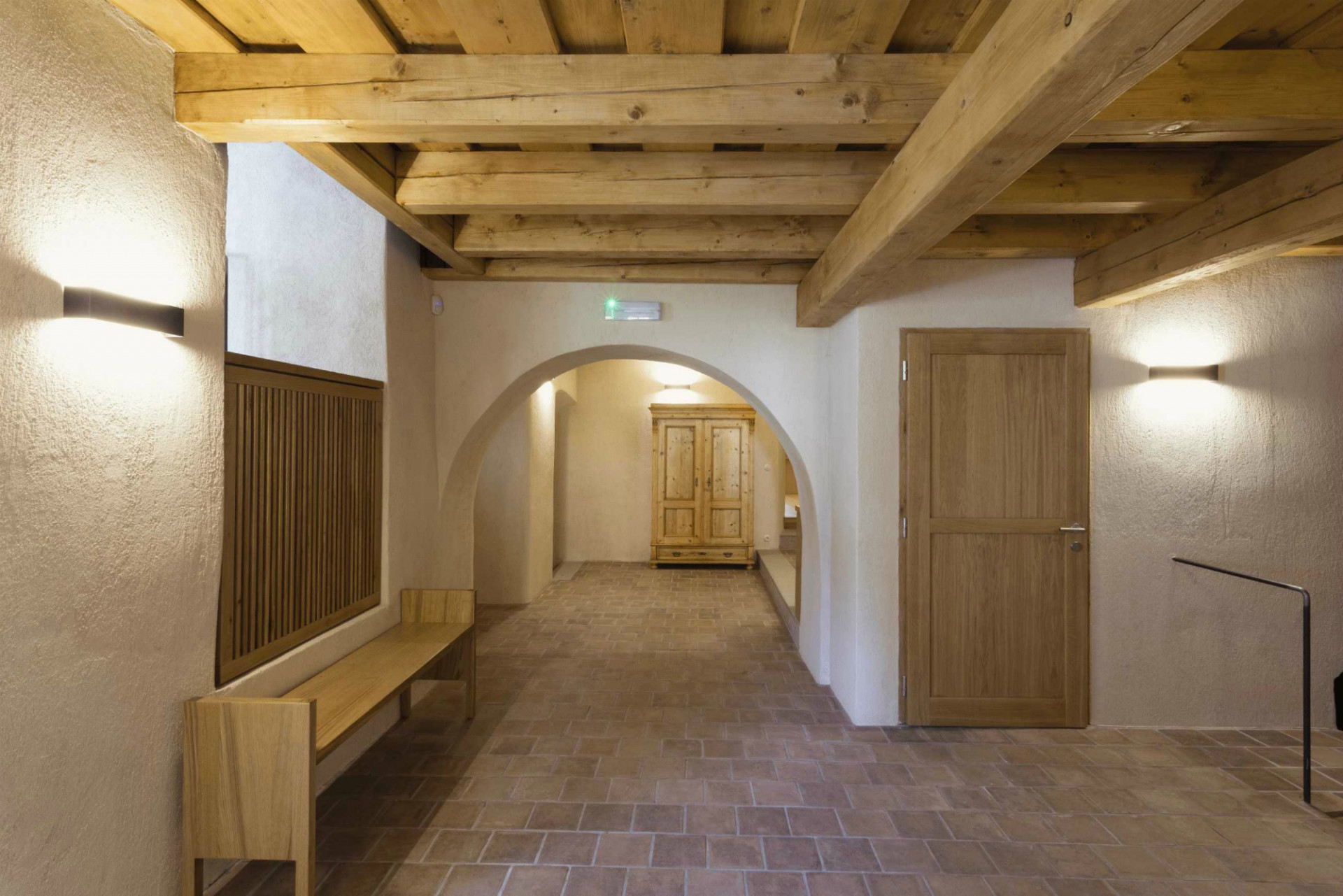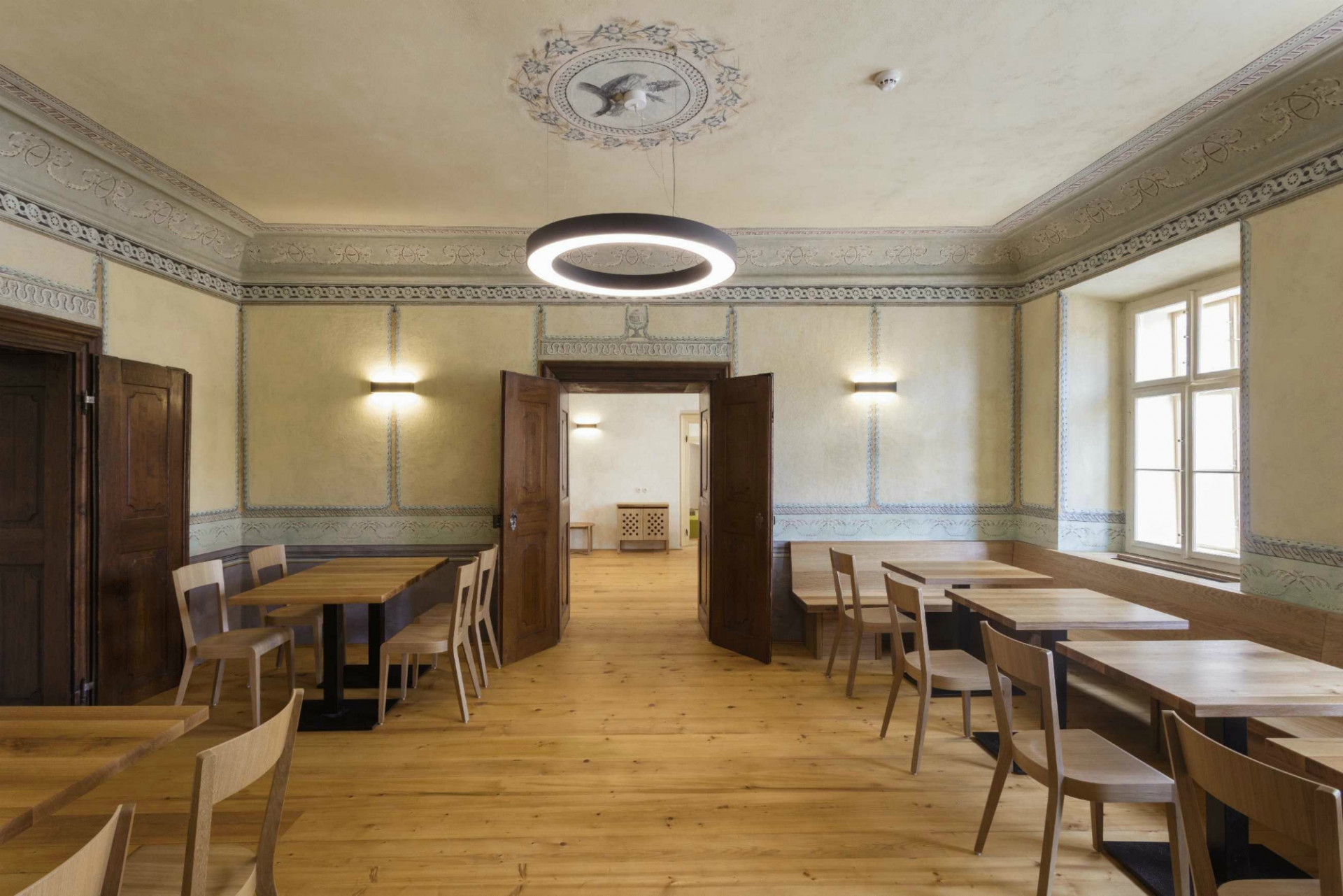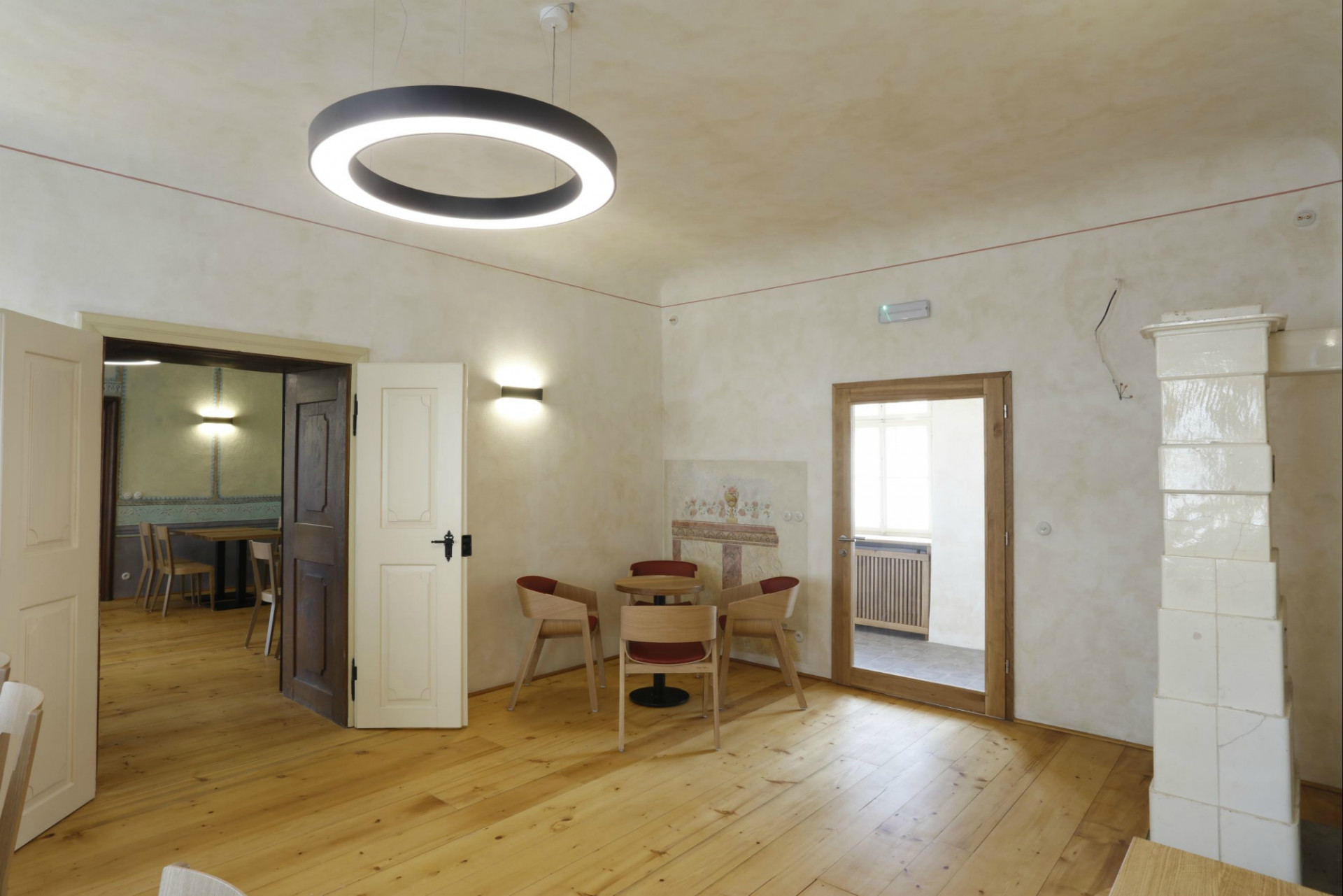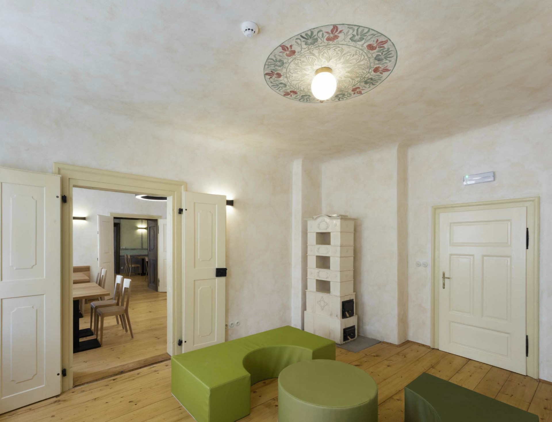 Architekti dbali na pečlivou obnovu interiéru do jeho původní podoby. Svůj autentický vzhled tak získala řada cenných historických prvků, detailů a výrobků. Historického ducha stavby umocňují původní valené klenby i dřevěné trámové stropy, řada kamenických i štukatérských detailů, repasovaná špaletová okna včetně kování, původní dveře a zárubně, ale i drobné detaily v podobě komínových dvířek, velká kachlová kamna a další. Obnovena byla i historická výmalba, jejíž původní podobu pomohly odhalit sondážní průzkumy historického zdiva. V maximální možné míře se podařilo zachovat i historické omítané podhledy včetně štuků či šablonové výmalby. Při obnově povrchů autoři důsledně dbali na dodržování historických postupů. Využívali tak například i starý vápenný štuk, jenž se míchal s novým odleželým štukem. Nové sádrokartonové podhledy se původním konstrukcím blíží díky ručnímu přeštukování.
