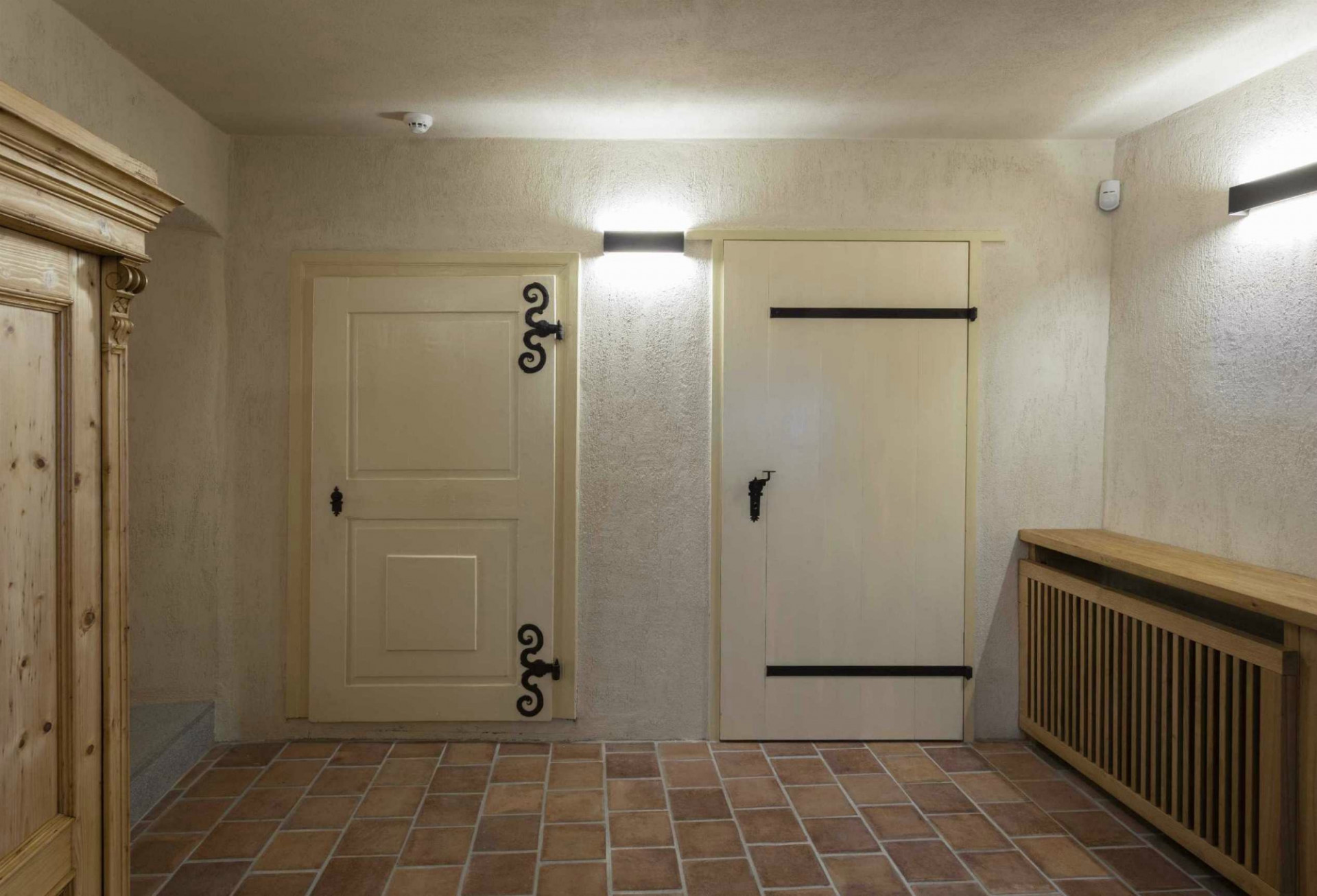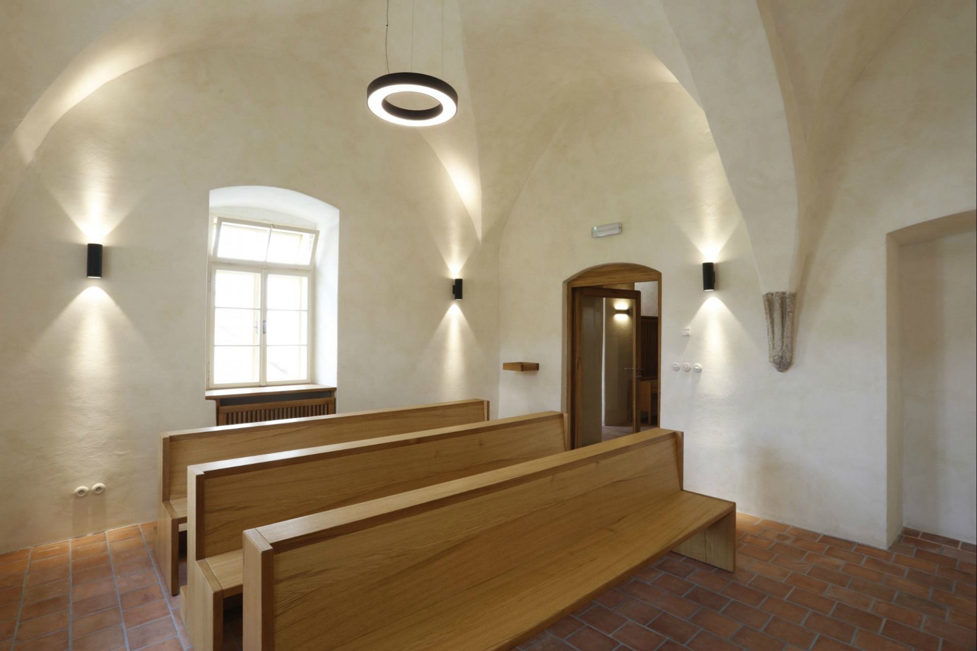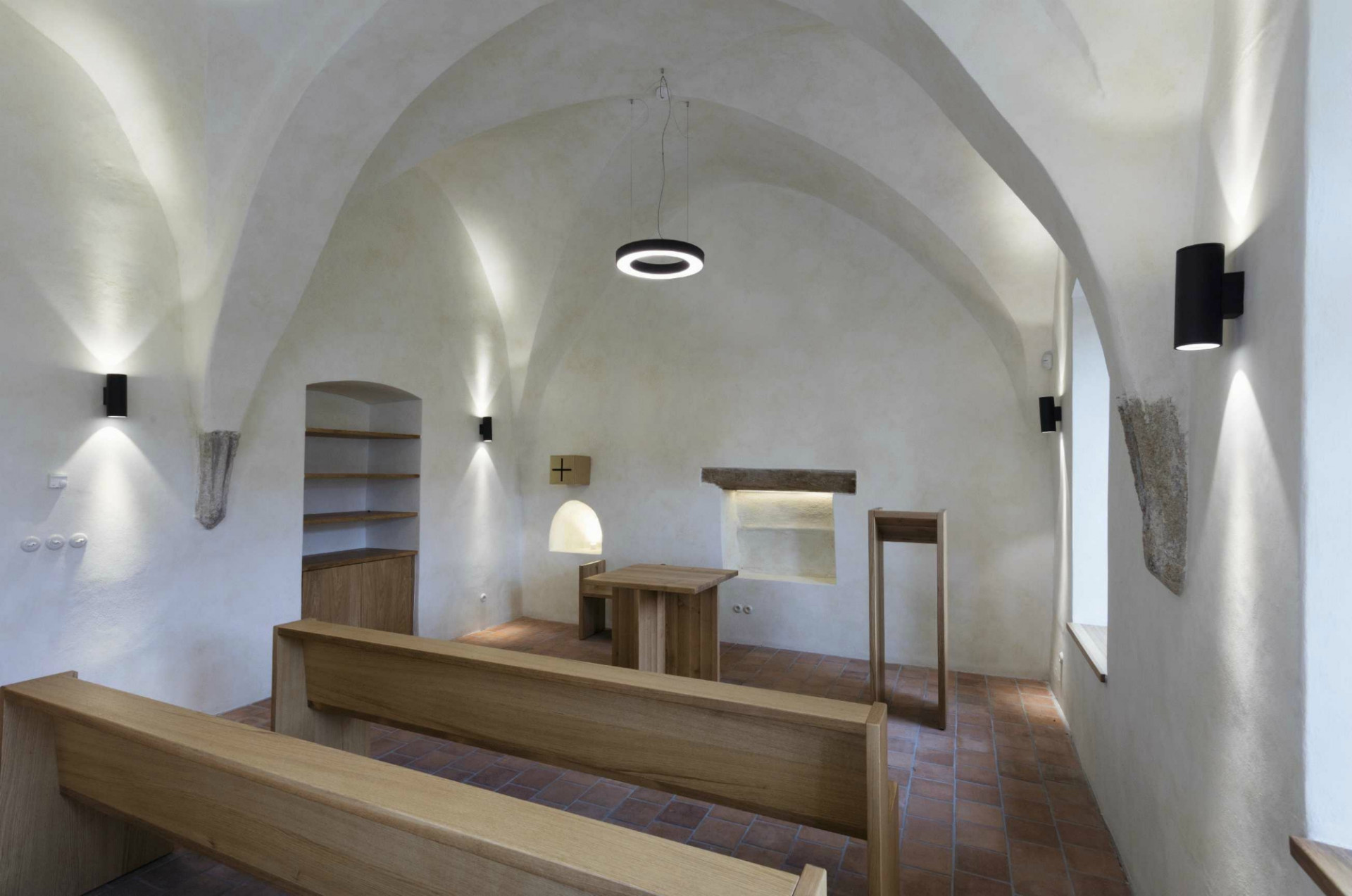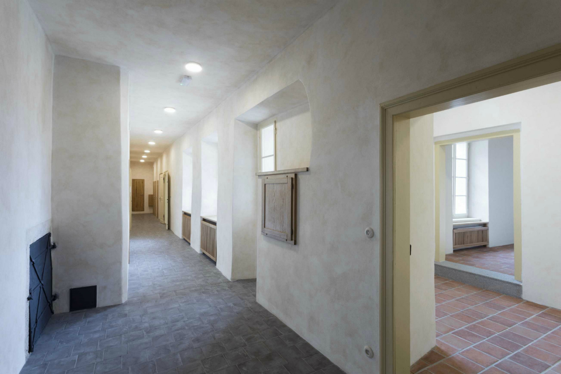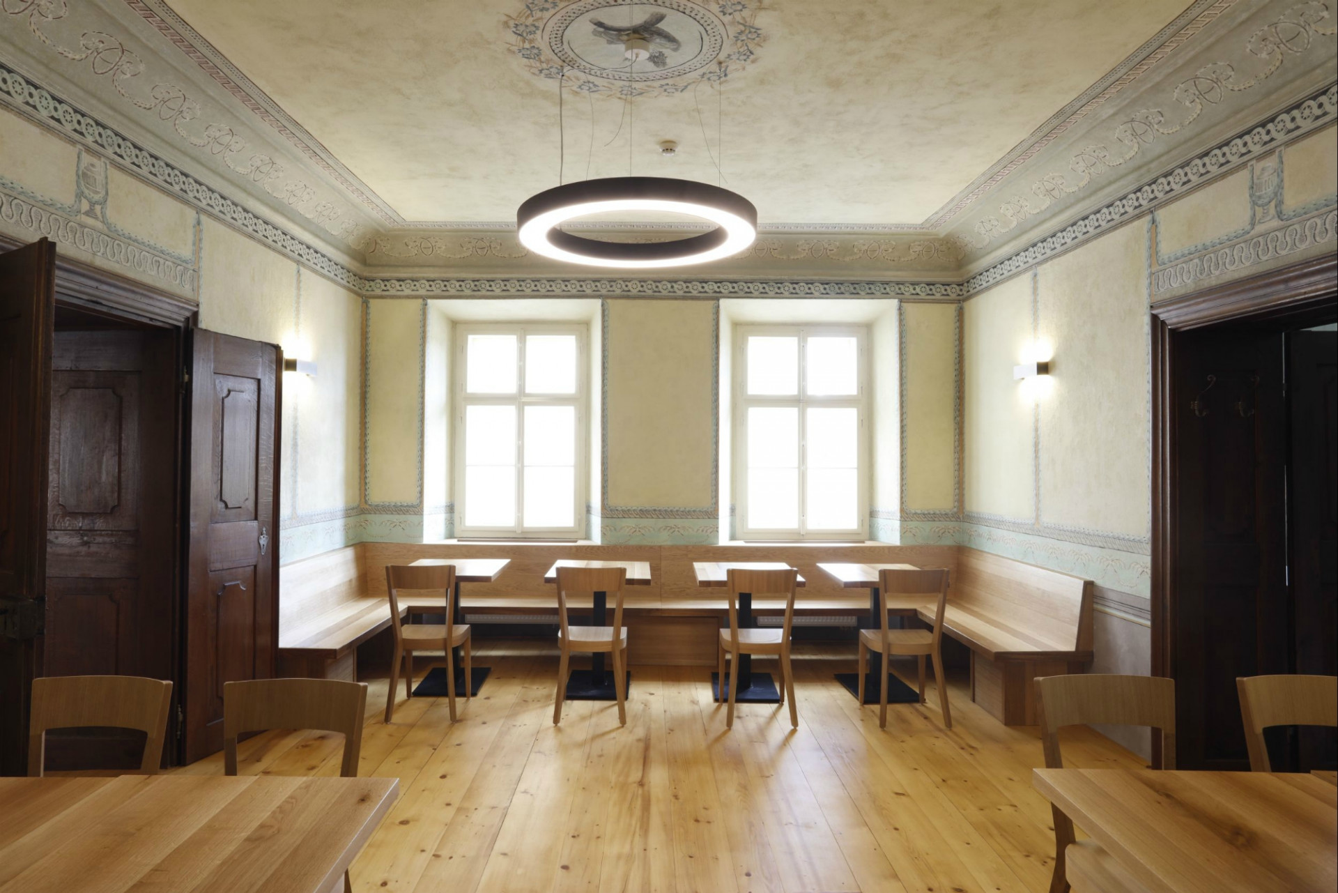 Architekti dbali na pečlivou obnovu interiéru do jeho původní podoby. Svůj autentický vzhled tak získala řada cenných historických prvků, detailů a výrobků. Historického ducha stavby umocňují původní valené klenby i dřevěné trámové stropy, řada kamenických i štukatérských detailů, repasovaná špaletová okna včetně kování, původní dveře a zárubně, ale i drobné detaily v podobě komínových dvířek, velká kachlová kamna a další. Obnovena byla i historická výmalba, jejíž původní podobu pomohly odhalit sondážní průzkumy historického zdiva. V maximální možné míře se podařilo zachovat i historické omítané podhledy včetně štuků či šablonové výmalby. Při obnově povrchů autoři důsledně dbali na dodržování historických postupů. Využívali tak například i starý vápenný štuk, jenž se míchal s novým odleželým štukem. Nové sádrokartonové podhledy se původním konstrukcím blíží díky ručnímu přeštukování.