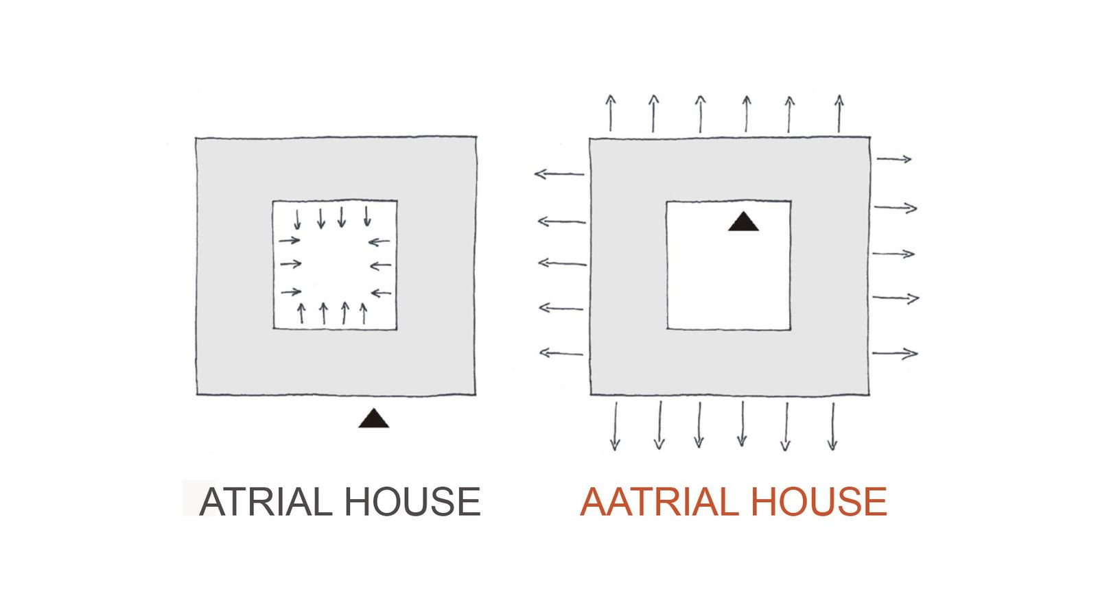 V důsledku se ovšem jedná o určitou negaci klasického prostoru atria, které už od antiky sloužilo jako centrální prostor společenského života uvnitř rezidenčních vil. Konieczného dům ale na tento prostor reaguje přesně opačně, odvrací se od něj a prostřednictvím svých teras a prosklených stěn se maximálně otevírá do svého okolí. Popření klasického modelu atriového domu vyjadřuje také samotný název projektu Aatrial House. Dům je tak ve výsledku uzavřen zevnitř a naopak otevřen do svého okolí.