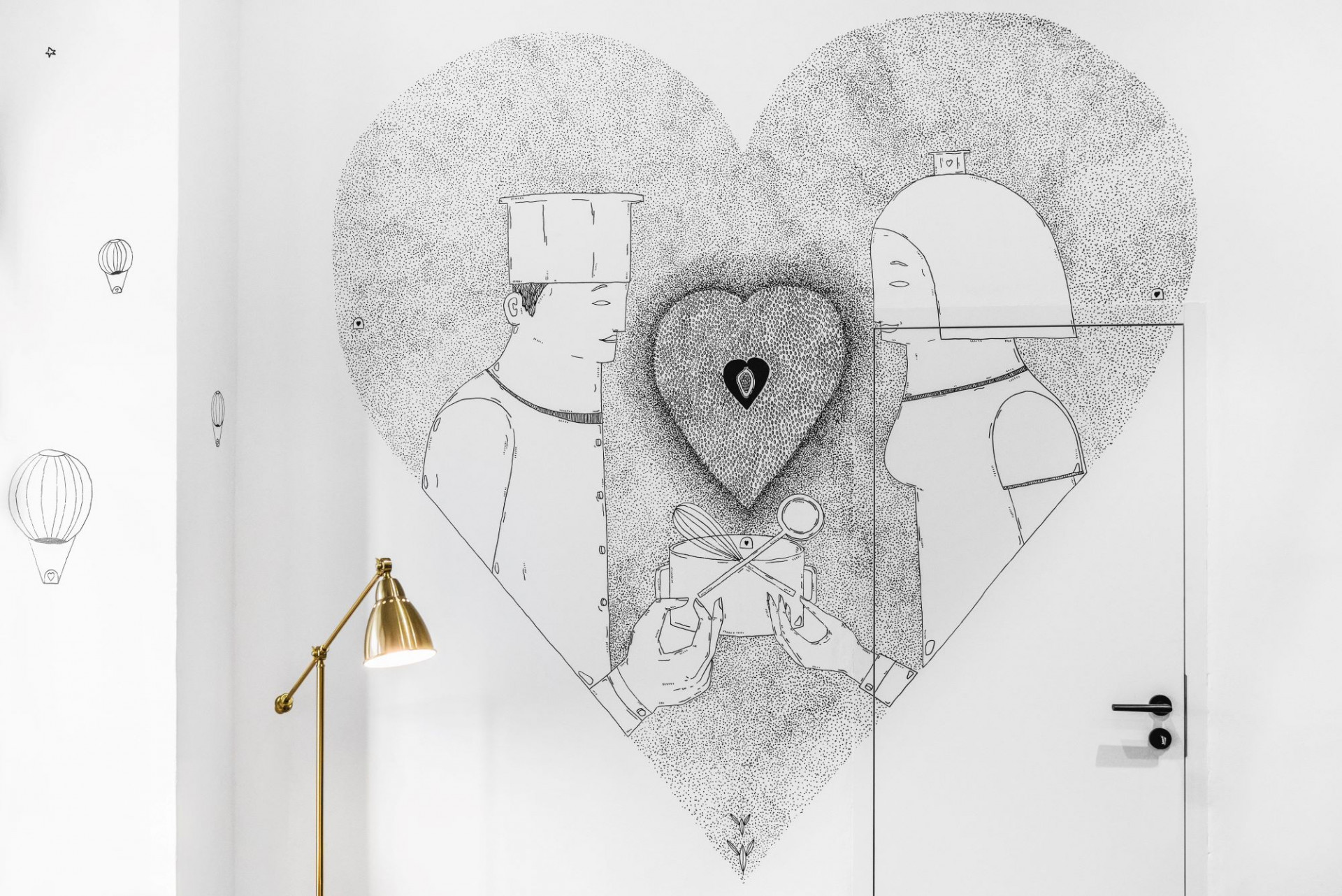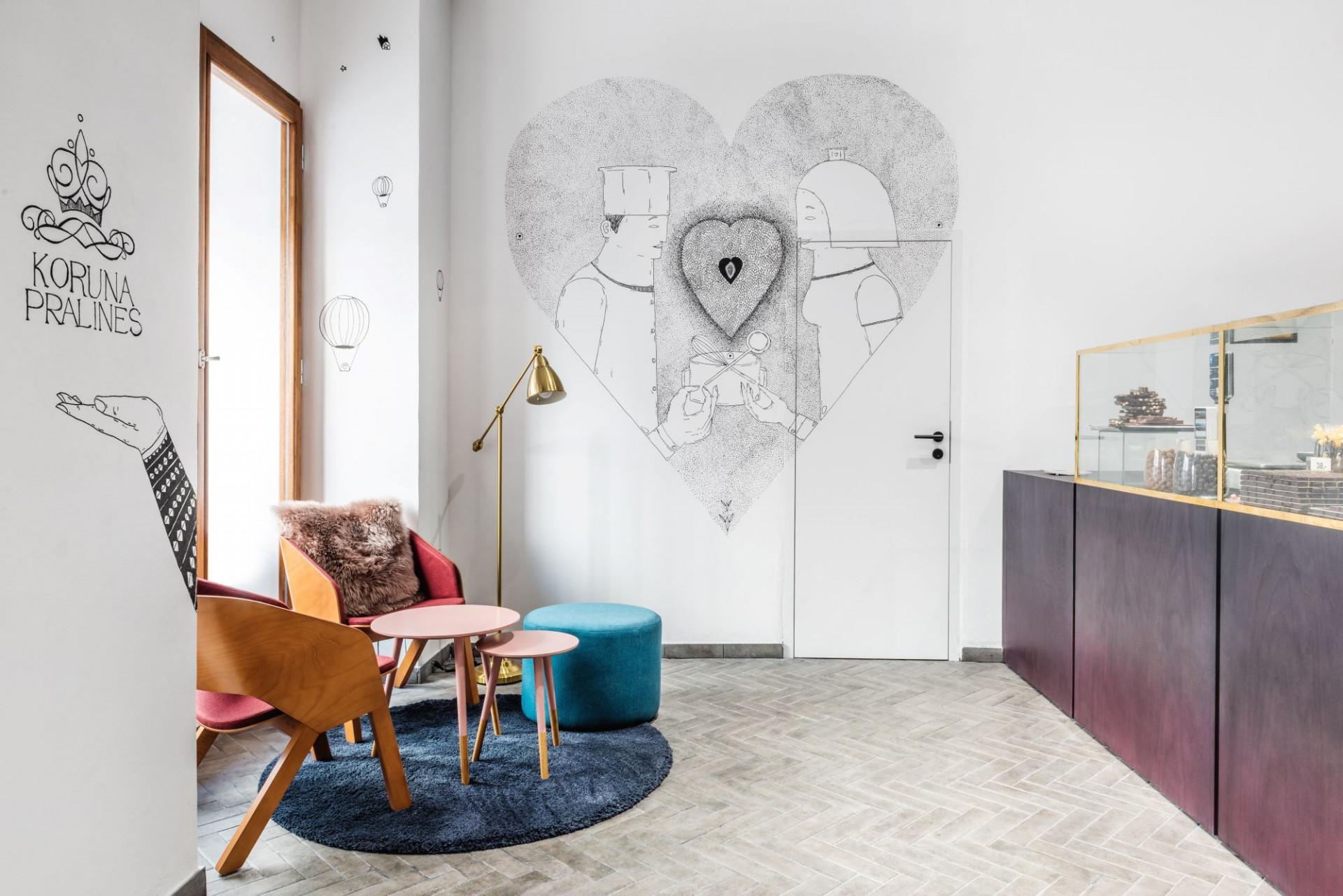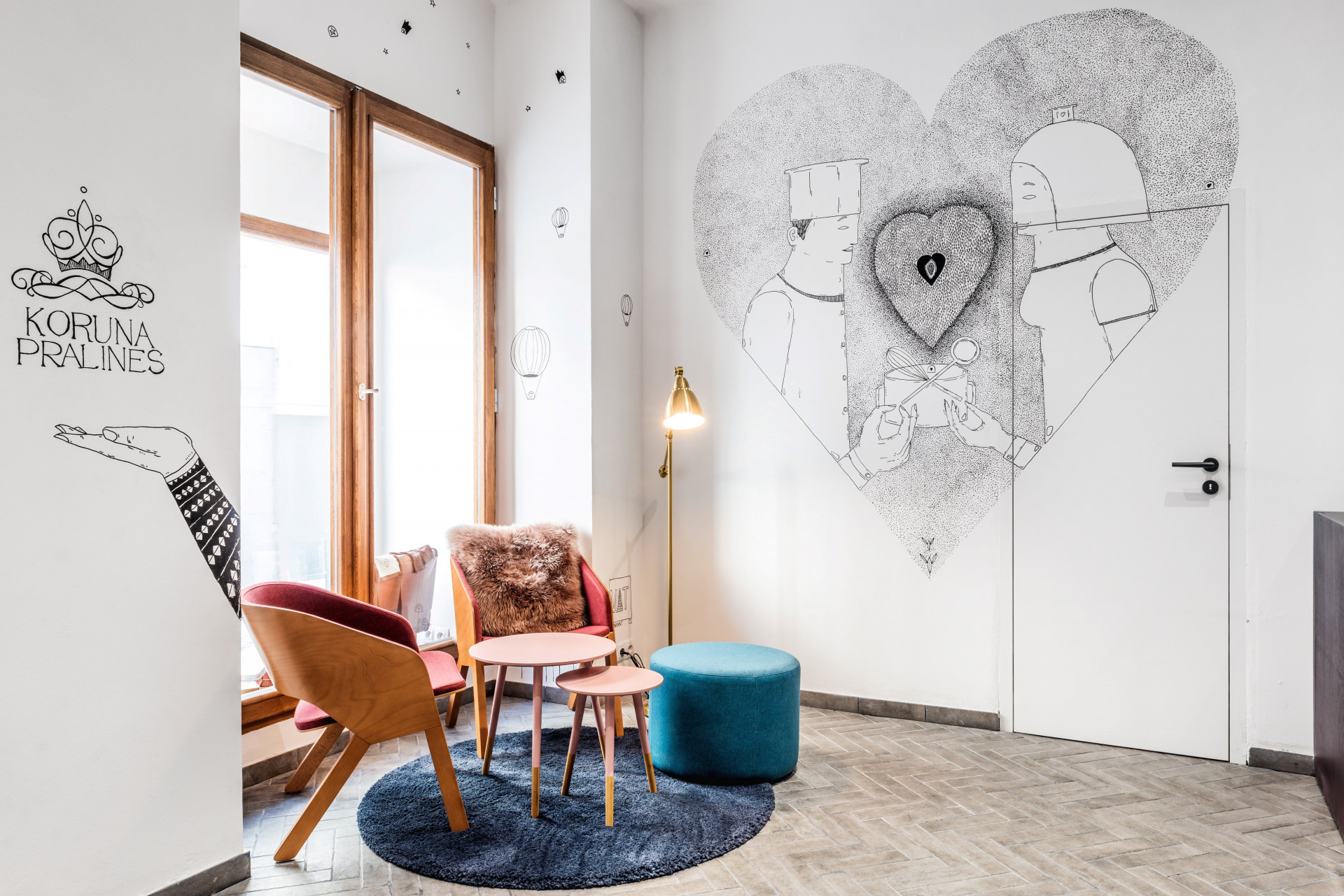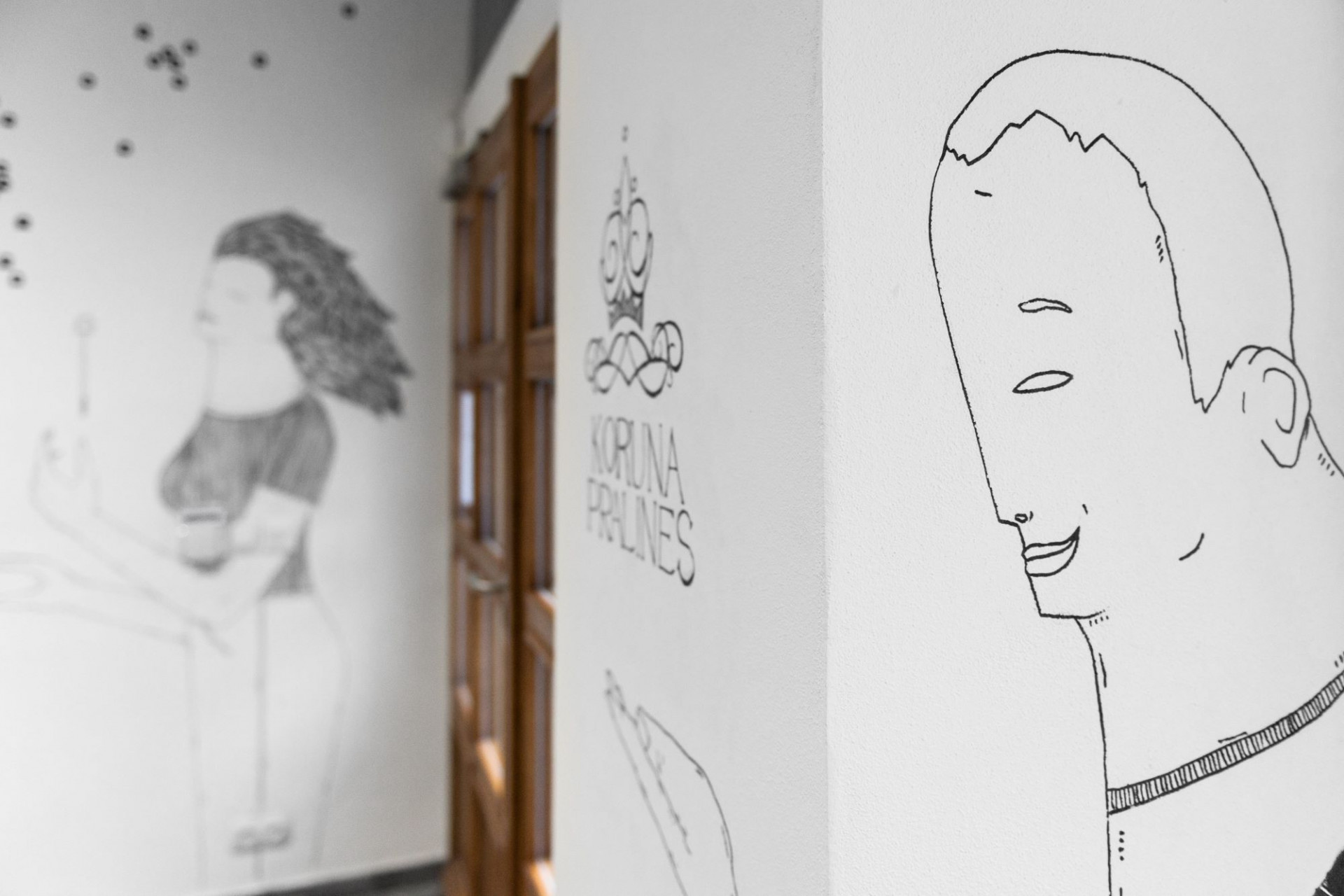 „Motiv srdce na uvítací stěně se soustřeďuje do středu z kakaových bobů, ve kterém je v samotném středu čokoládové srdce s celým bobem. Tento jednoduchý motiv jsem volil tak, aby byl lehce zapamatovatelný a lidé si jej s pralinkárnou spojili, avšak zároveň je srdce detailně vykreslené, aby v něm hledali. Dva kuchaři po boku se nemohou dočkat, až se pustí do vaření další chutné čokolády,“ popisuje autor ilustrací. „Na protější straně je pak slečna, která namáčí bublifuk ve tvaru pralinky do horké čokolády a rozfukuje pralinky po celém světě.“