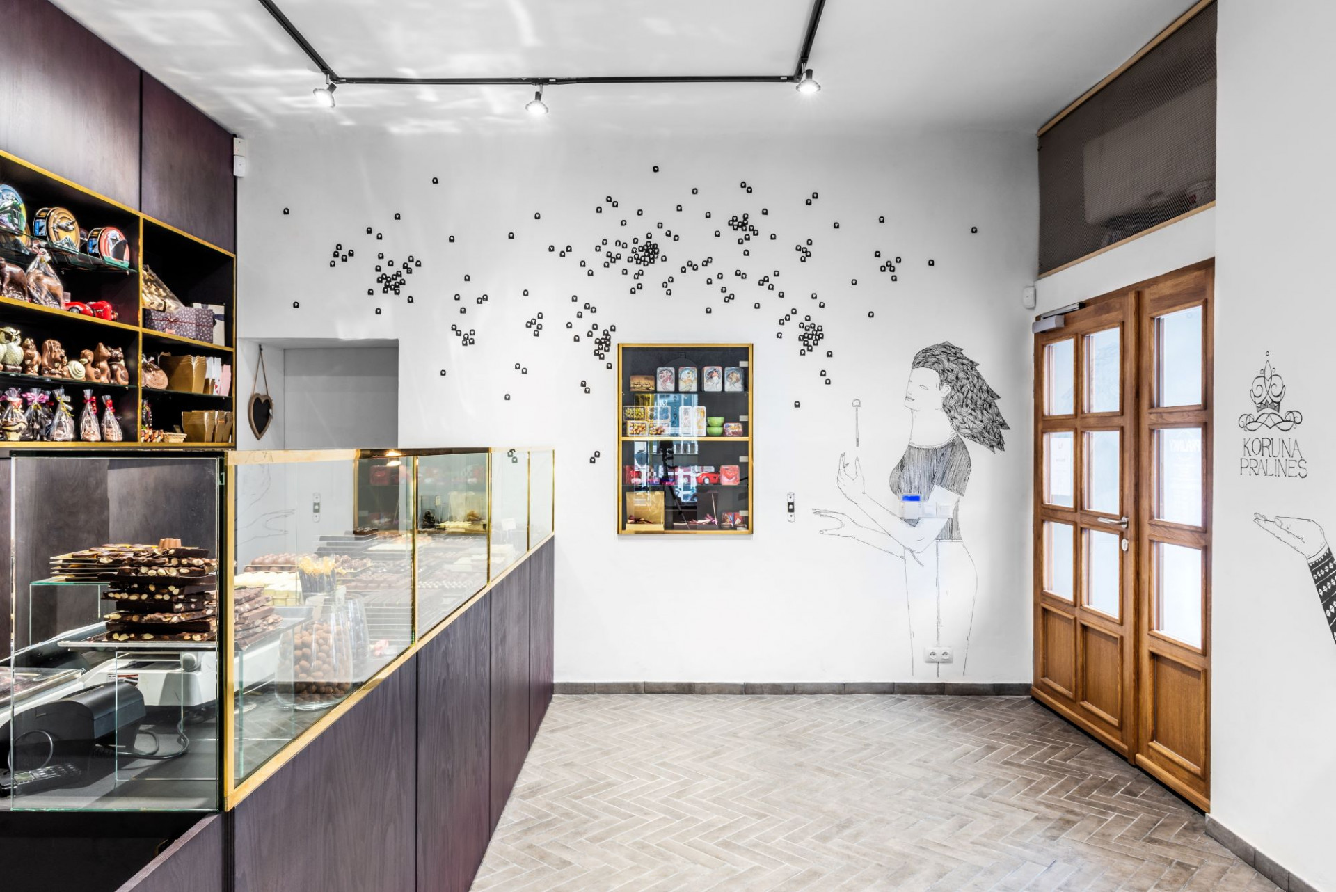 Bílé stěny prodejny zdobí originální ilustrace, které mají za úkol vyprávět příběh o čokoládových pralinkách vyráběných s láskou, z opravdové kvalitní čokolády. Pro tvorbu ilustrací oslovil architekt Karnet svého bývalého spolužáka Matyáše Proška, kterému se požadovanou atmosféru podařilo dokonale vystihnout.