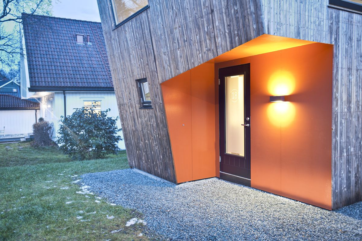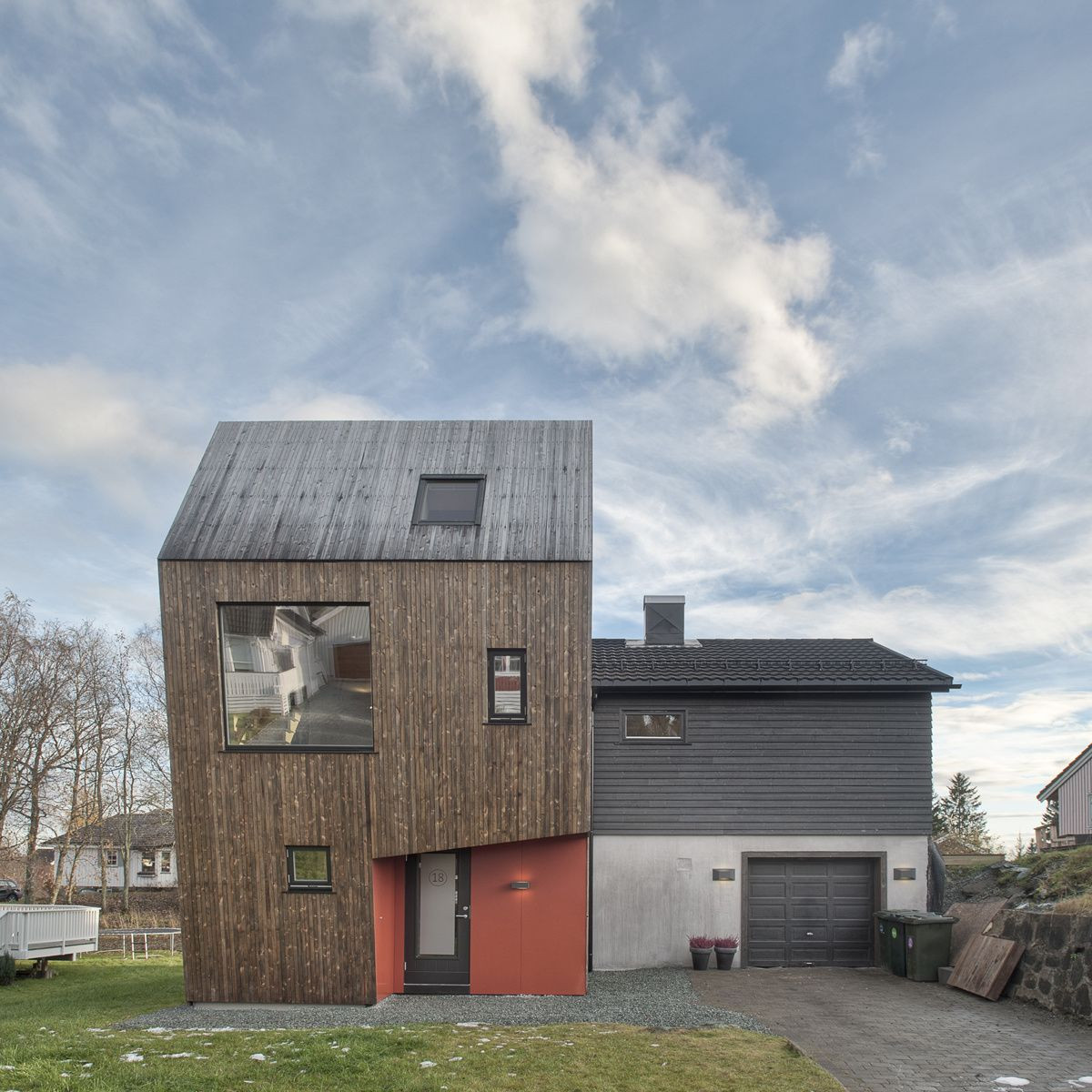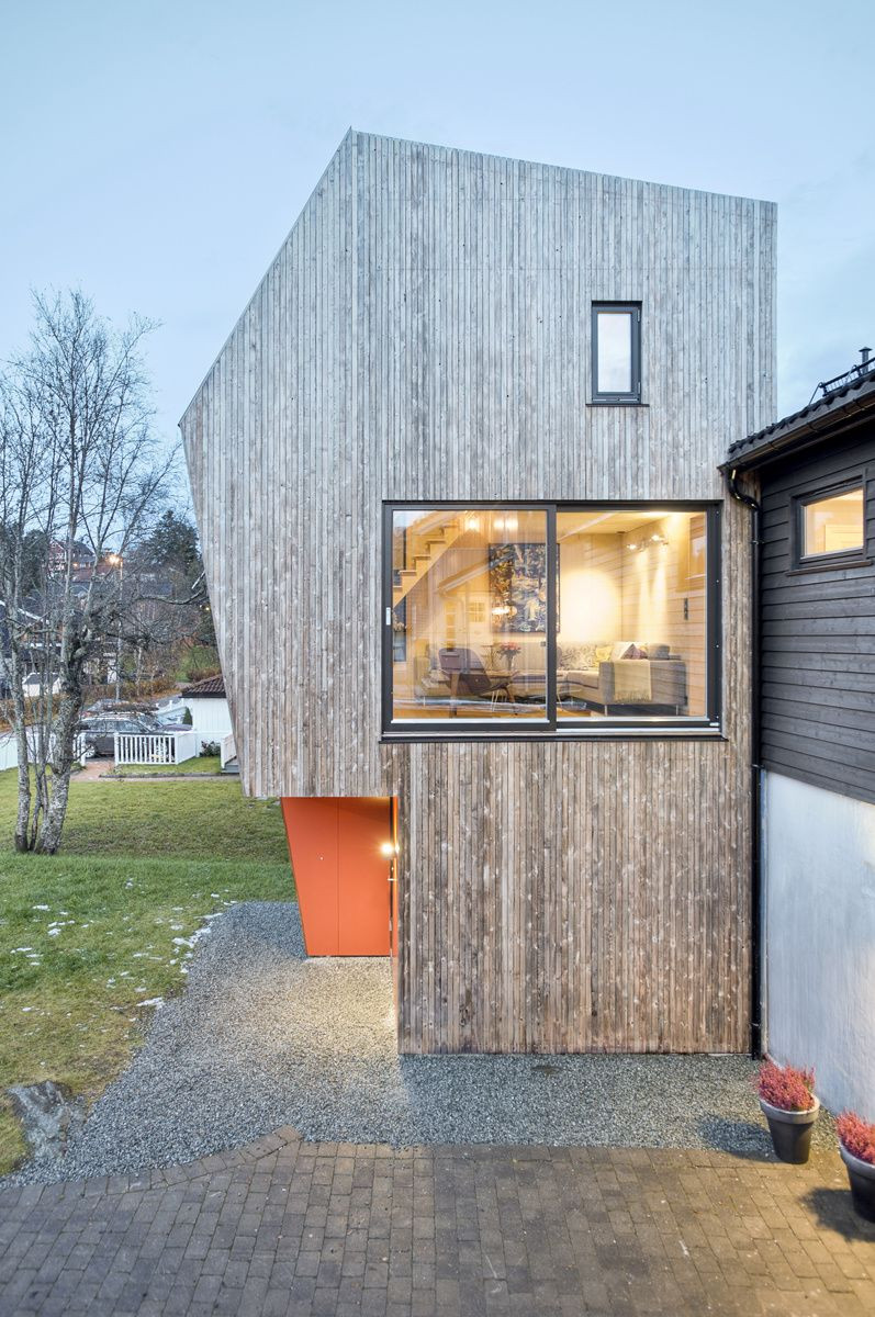Moderně pojatá přístavba od norských architektů TYIN tegnestue rozšiřuje obývací prostory staršího rodinného domu. Vertikální hmota s dřevěnou fasádou vyčnívá z okolní zástavby a současně prověřuje místní stavební regulace.