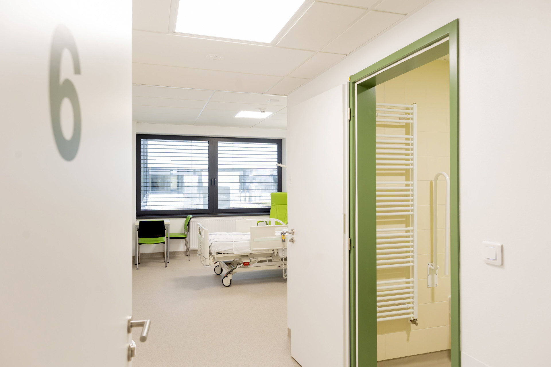 Modrá, zelená, oranžová – pro každé patro jedna pastelová barva. Keramické obklady vyhověly množstvím odstínů i parametry pro zdravotnické zařízení. Například moderní interiér je tak trendově „odbarvený“. Jemnější odstíny pomáhají pacientům cítit se zde příjemně, nejsou agresivní ani rušivé.