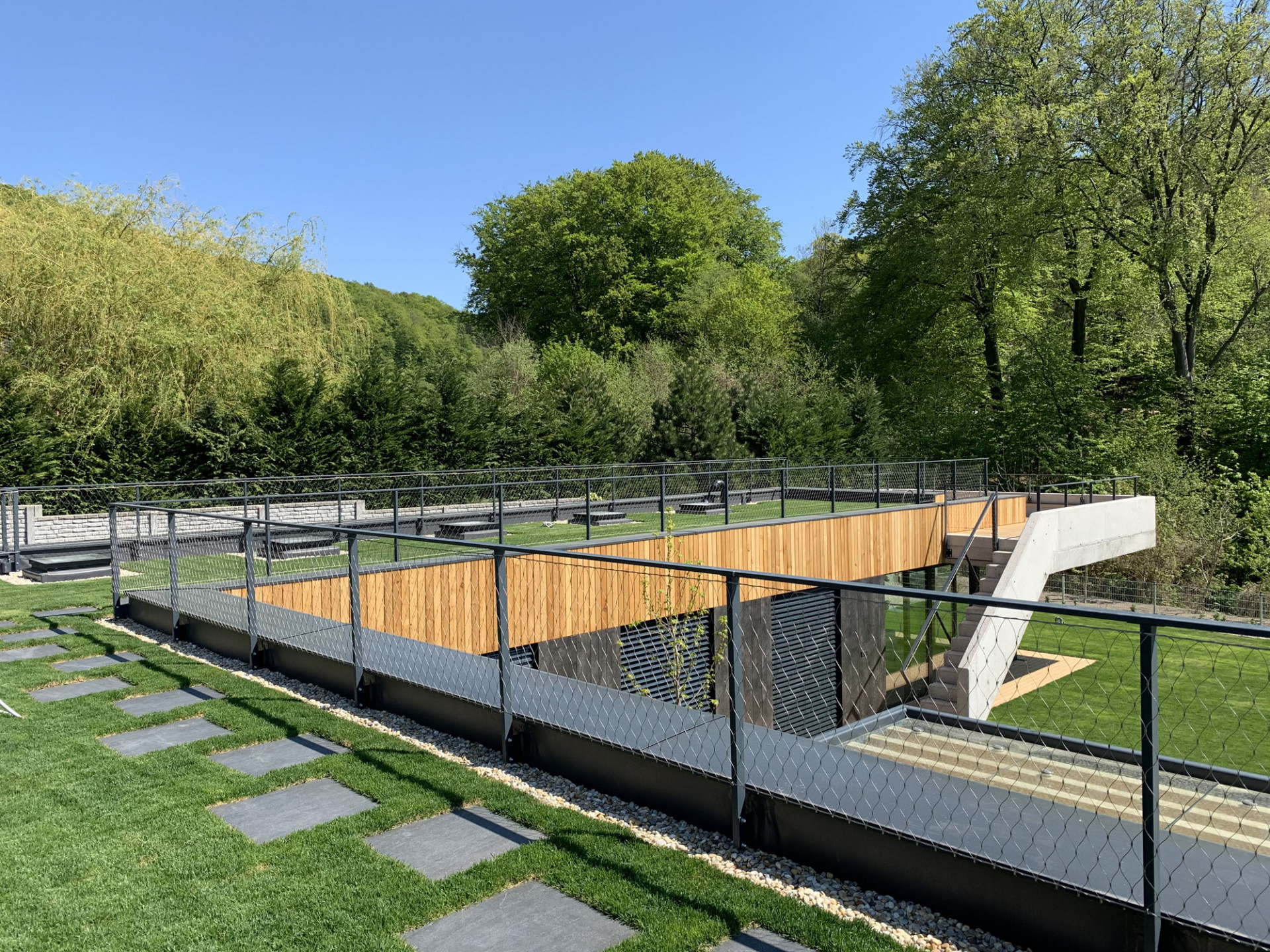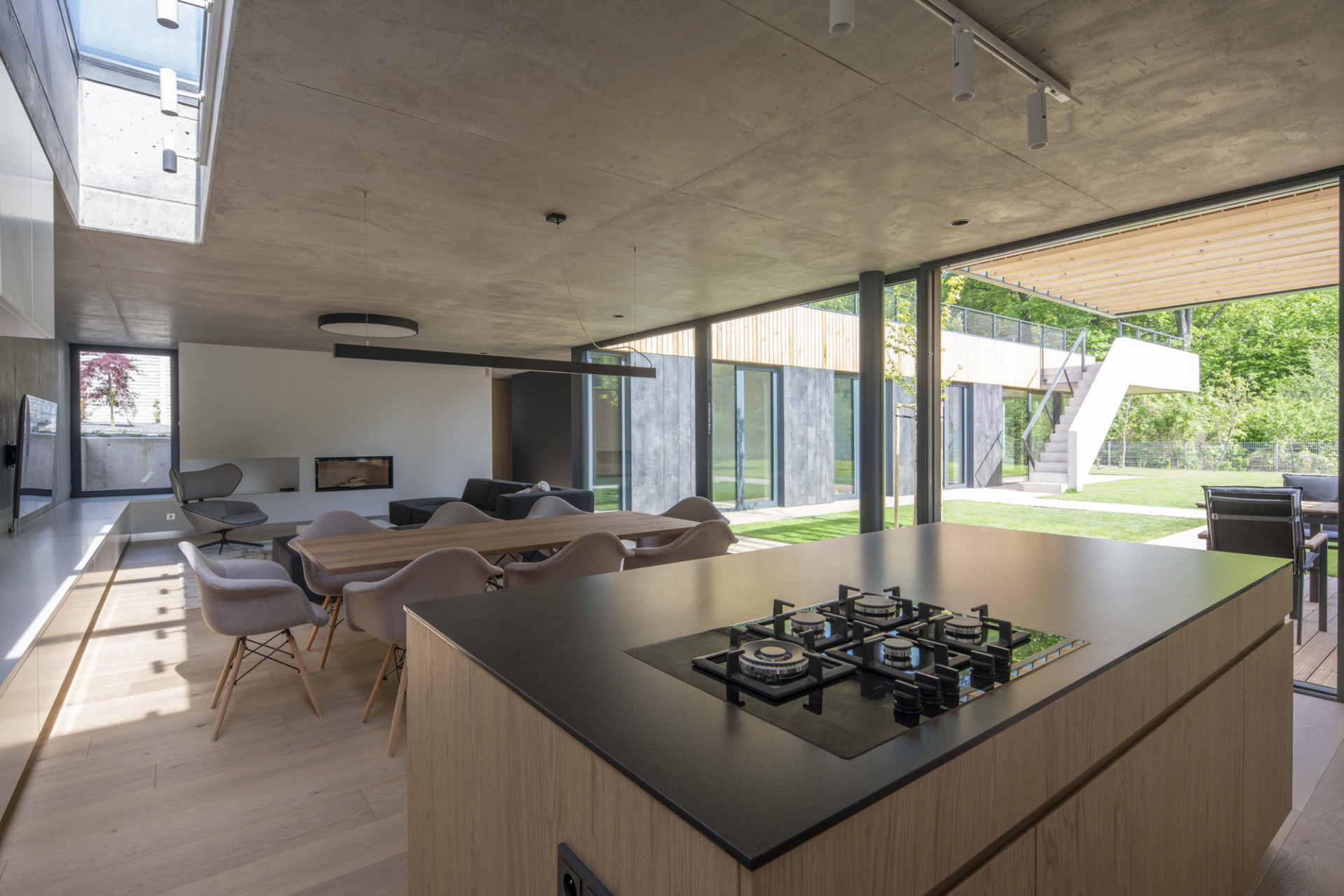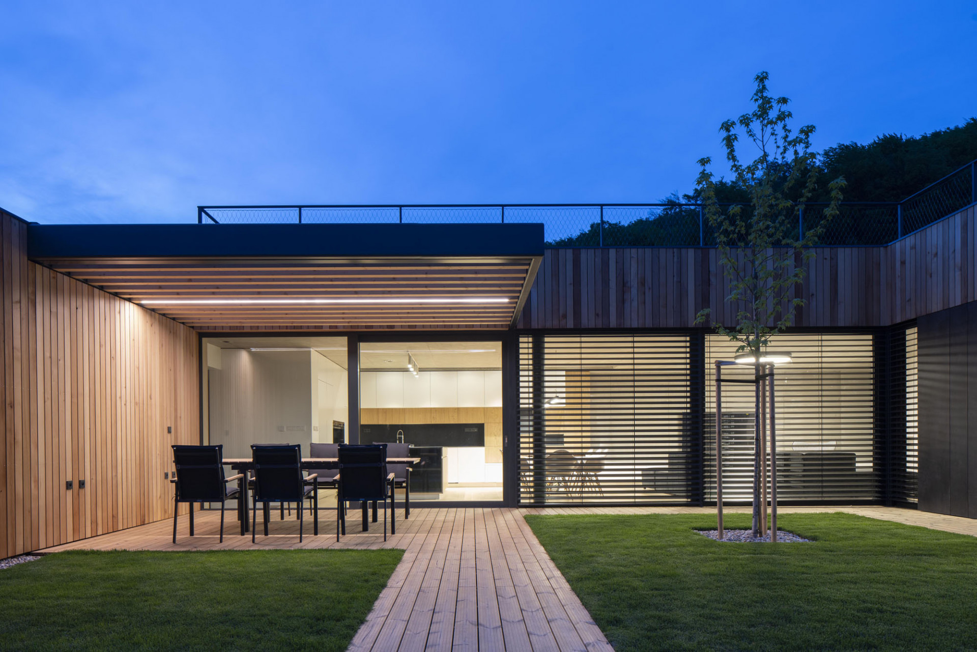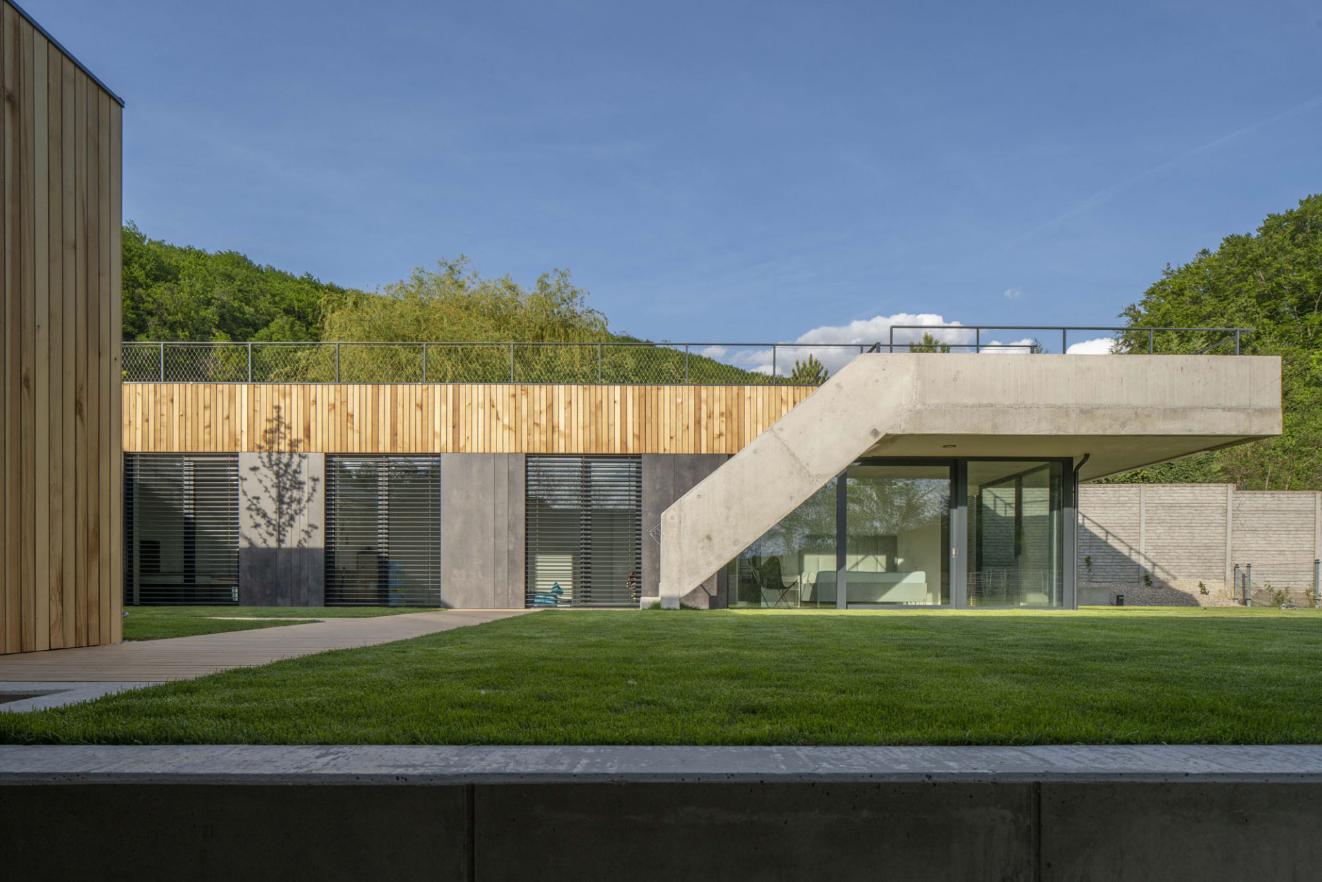 „Šlo o to vtáhnout černou z fasády také do interiéru. Jsem rád, že se majitelé výrazně tmavých stěn nebáli a dodrželi navržený materiálový koncept až do konce,“ dodává Moravčík. Beton použil architekt i na schodiště vedoucí na zelenou střechu. Vysoká betonová atika plynule přechází do hmoty schodiště a jako stužka obtáčí čelo východního křídla domu. Zelená střecha se má dle představ architekta Moravčíka postupně proměnit v úrodnou zahrádku s množstvím záhonů.