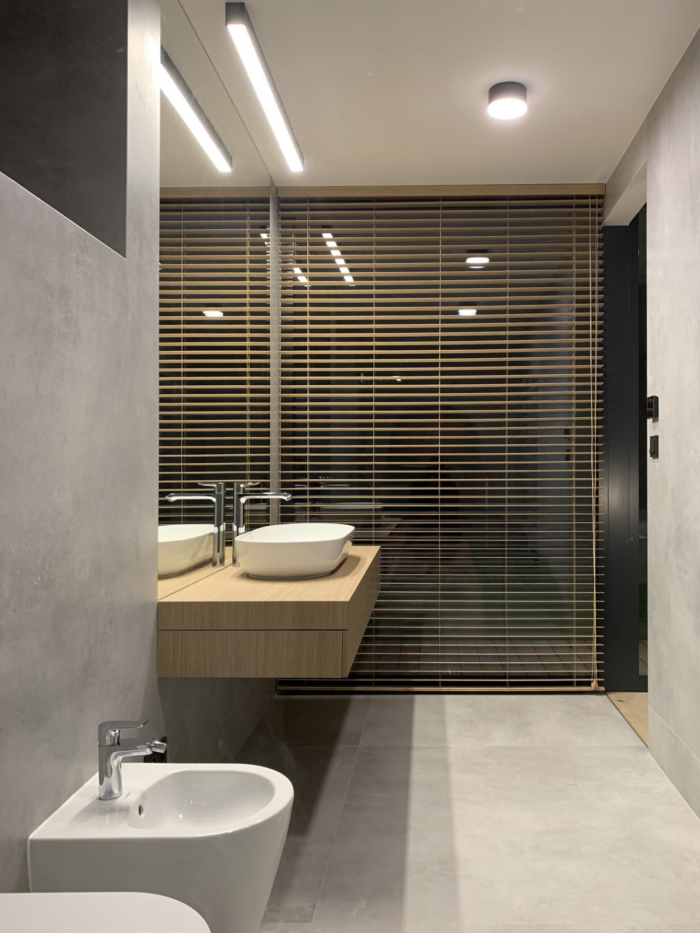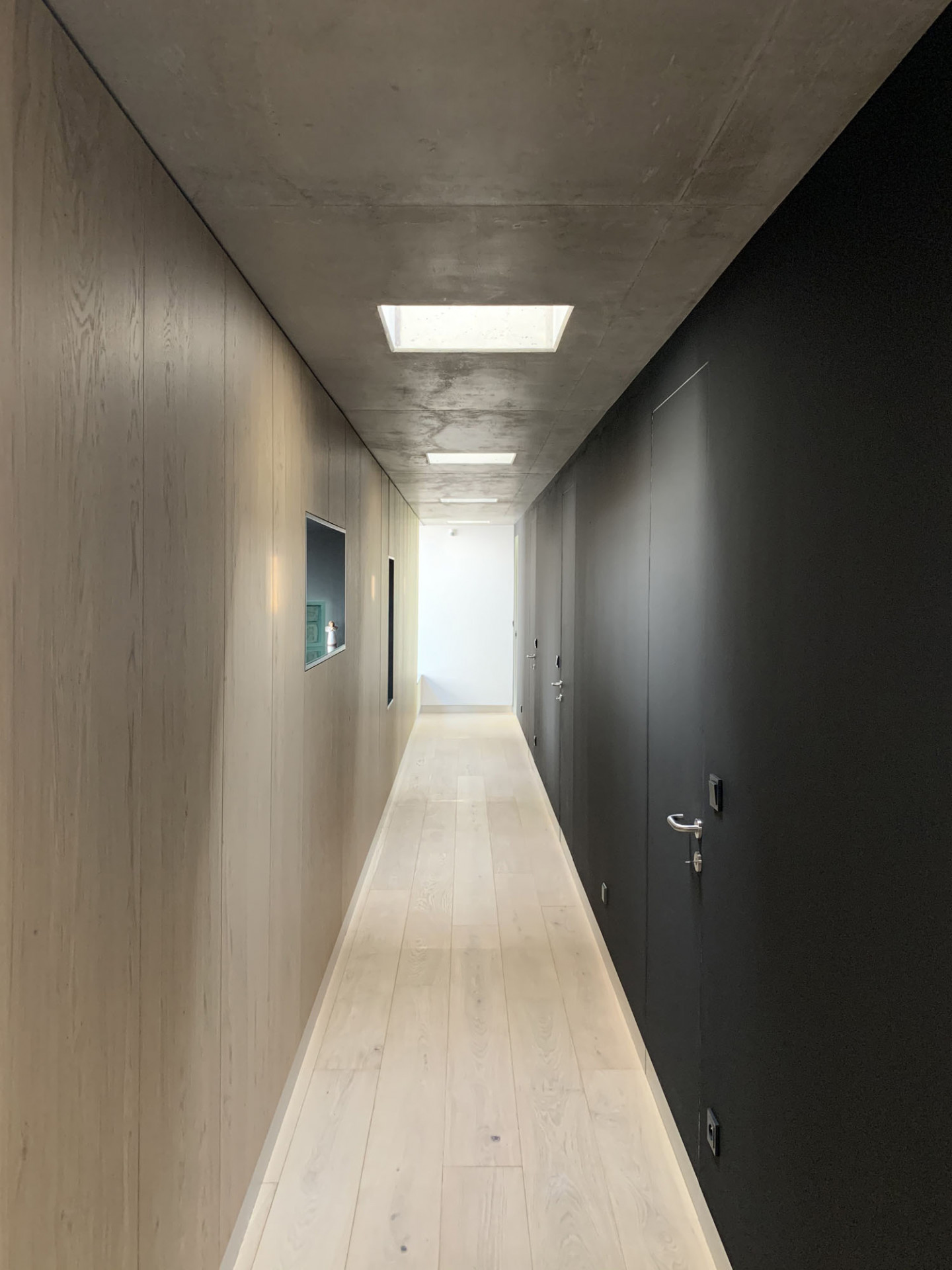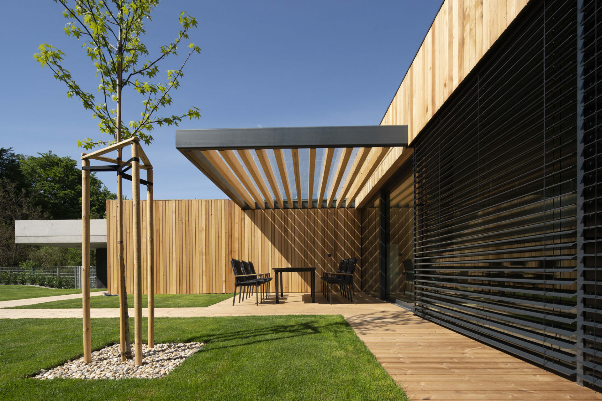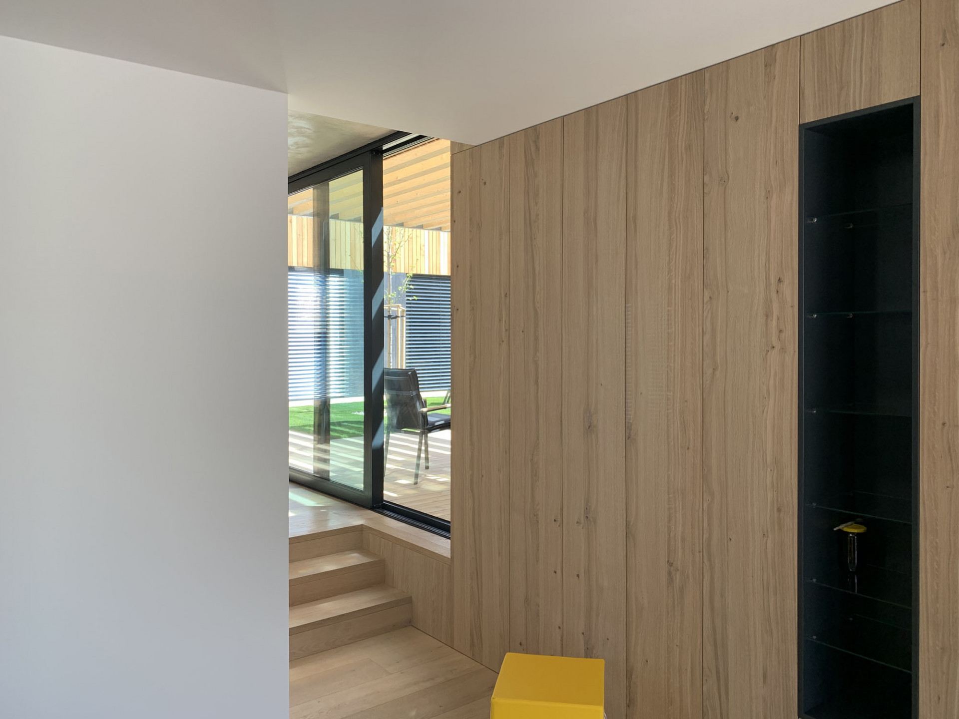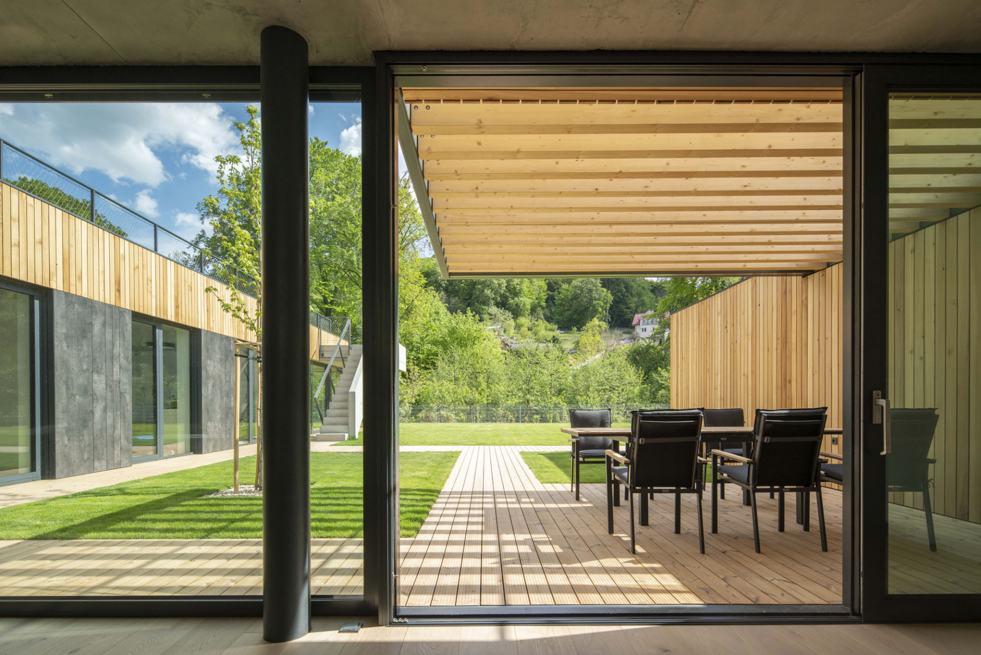 „Šlo o to vtáhnout černou z fasády také do interiéru. Jsem rád, že se majitelé výrazně tmavých stěn nebáli a dodrželi navržený materiálový koncept až do konce,“ dodává Moravčík. Beton použil architekt i na schodiště vedoucí na zelenou střechu. Vysoká betonová atika plynule přechází do hmoty schodiště a jako stužka obtáčí čelo východního křídla domu. Zelená střecha se má dle představ architekta Moravčíka postupně proměnit v úrodnou zahrádku s množstvím záhonů.