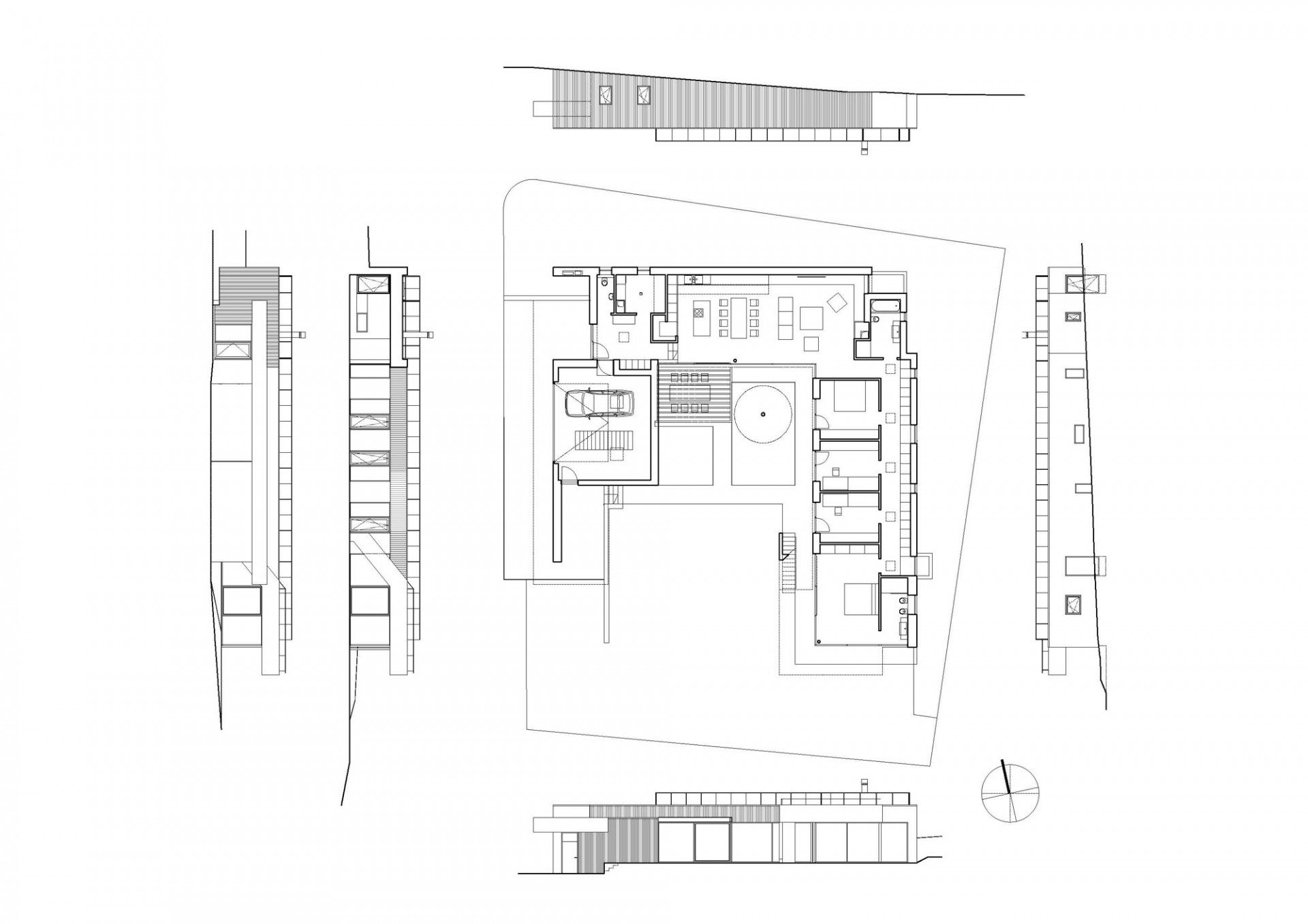 Jednotlivé hmoty domu jsou uspořádané do půdorysného tvaru „U“ kolem prostorného vnějšího atria. Při pobytu v tomto soukromém prostoru člověk nevnímá okolní zástavbu, pouze zeleň rozlehlé navazující zahrady a vzdálených vzrostlých stromů.