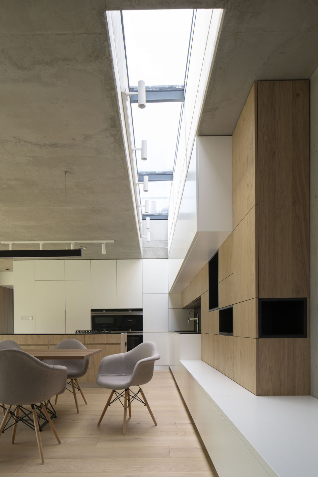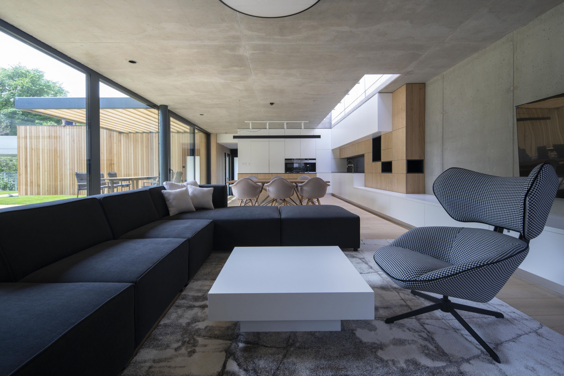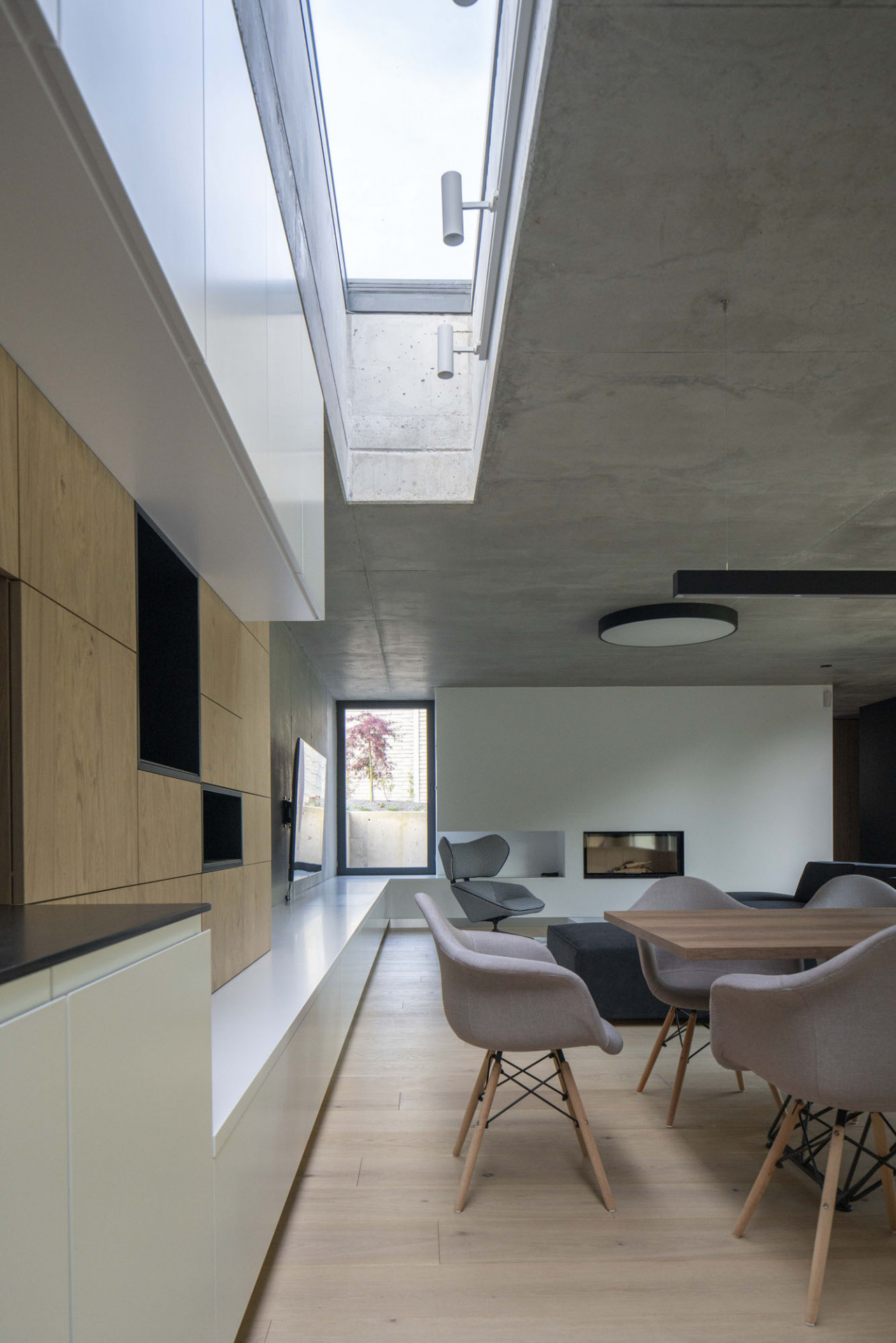 Jednotlivé prostory domu jsou řazené v logickém sledu za sebou. Díky velkoplošným okenním výplním v hliníkových rámech Aluprof komunikují všechny místnosti s exteriérem společného atria. Stává se tak součástí interiéru, který je díky tomu také velkoryse prosvětlený. Dostatek přirozeného denního světla na severní straně hlavního obytného prostoru navíc zajišťuje obdélný střešní světlík. Obdobně navrhl architekt světlíky i v přístupové chodbě k pokojům.
