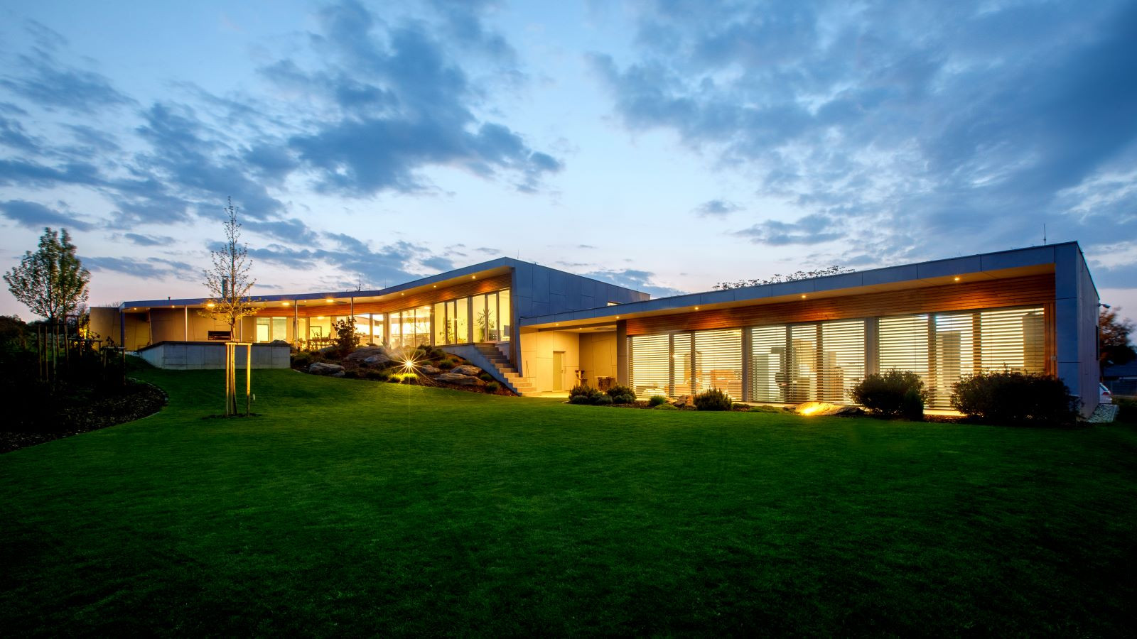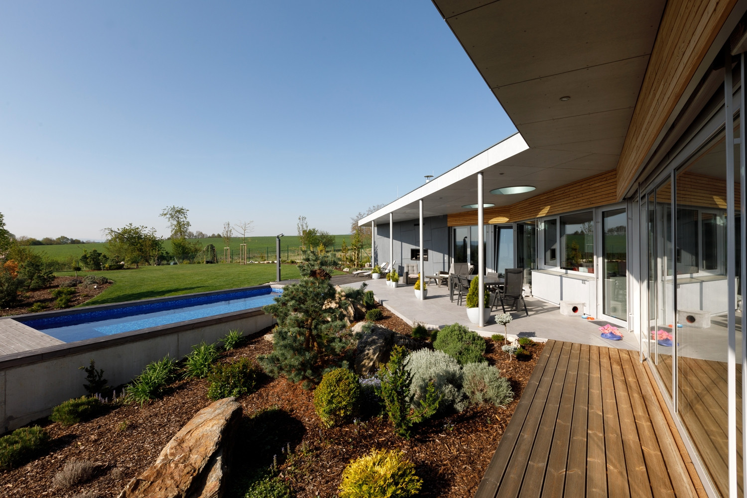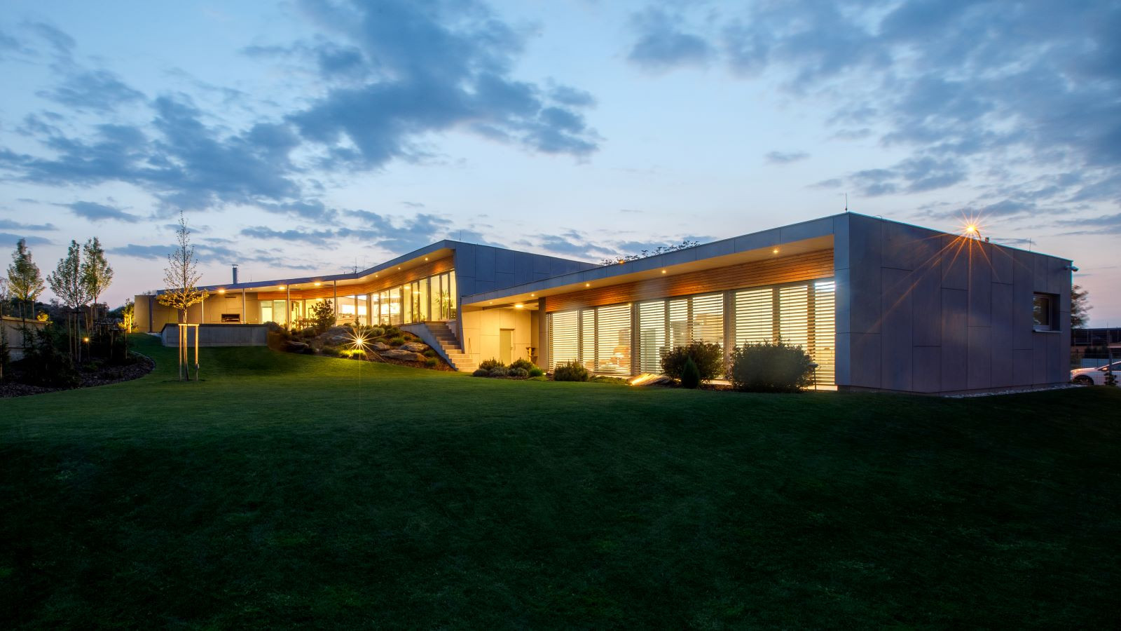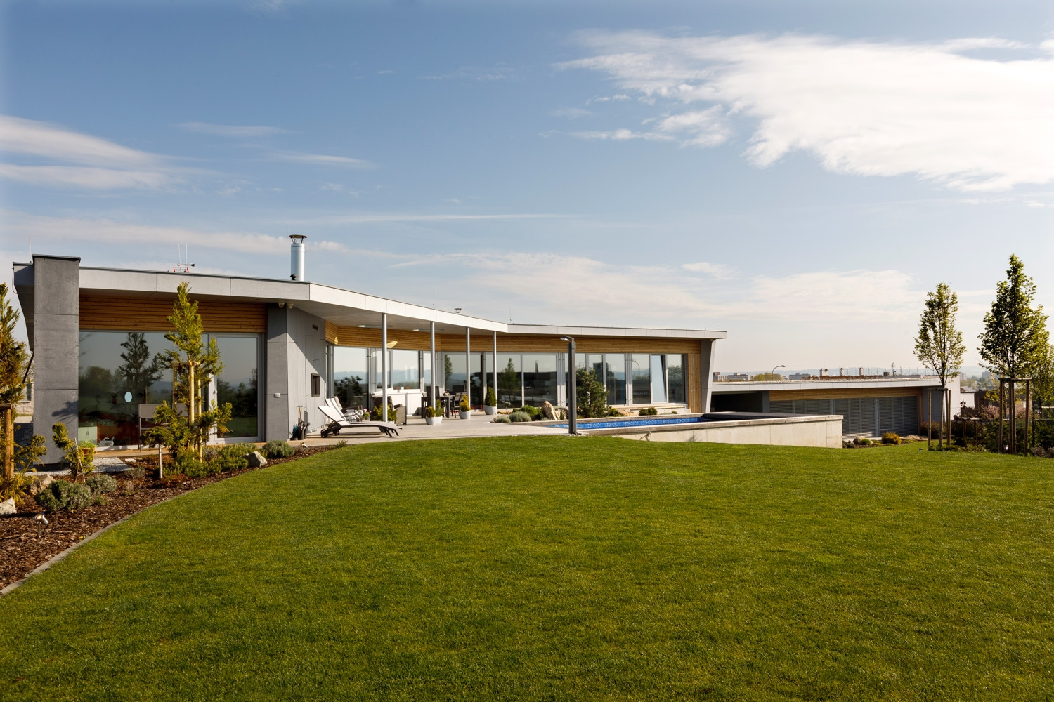 Oba domy jsou volně položeny do zahrady, která na ně zcela přirozeně navazuje. Na jižní straně pocit volnosti a krajiny umocňuje navazující pole a volný terén. Díky celoproskleným stěnám z vysoce tepelněizolačních hliníkových systémů Schüco AWS 90.SI+ s trojitým izolačním sklem (jsou vhodné i pro pasivní domy) si mohou obyvatelé domu užít krásné výhledy na panorama Českých Budějovic a okolí. Komfortní vstup na terasu zajišťují rovněž vysoce tepelně izolované posuvné dveře se zdvihem Schüco ASS 70.HI, s perfektní vodotěsností a zvukovou izolací. Prosklené plochy jsou navíc chráněny před sluncem přesahy střech a venkovními hliníkovými žaluziemi, v zimním období je naopak jejich zásluhou dům naplněn denním světlem. „Slunce a výhledy, to nám v minulém domě chybělo. Bydleli jsme v takovém malém ďolíku pod kopcem, kolem parcely vedla silnice, i když ne frekventovaná, tak přece jen to nebylo zcela komfortní. Teď jsme na kopci s krásnými výhledy a prosluněnou zahradou i domem,“ je spokojen investor.