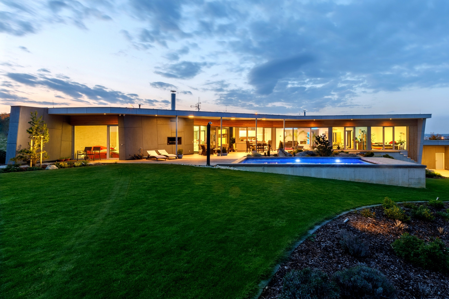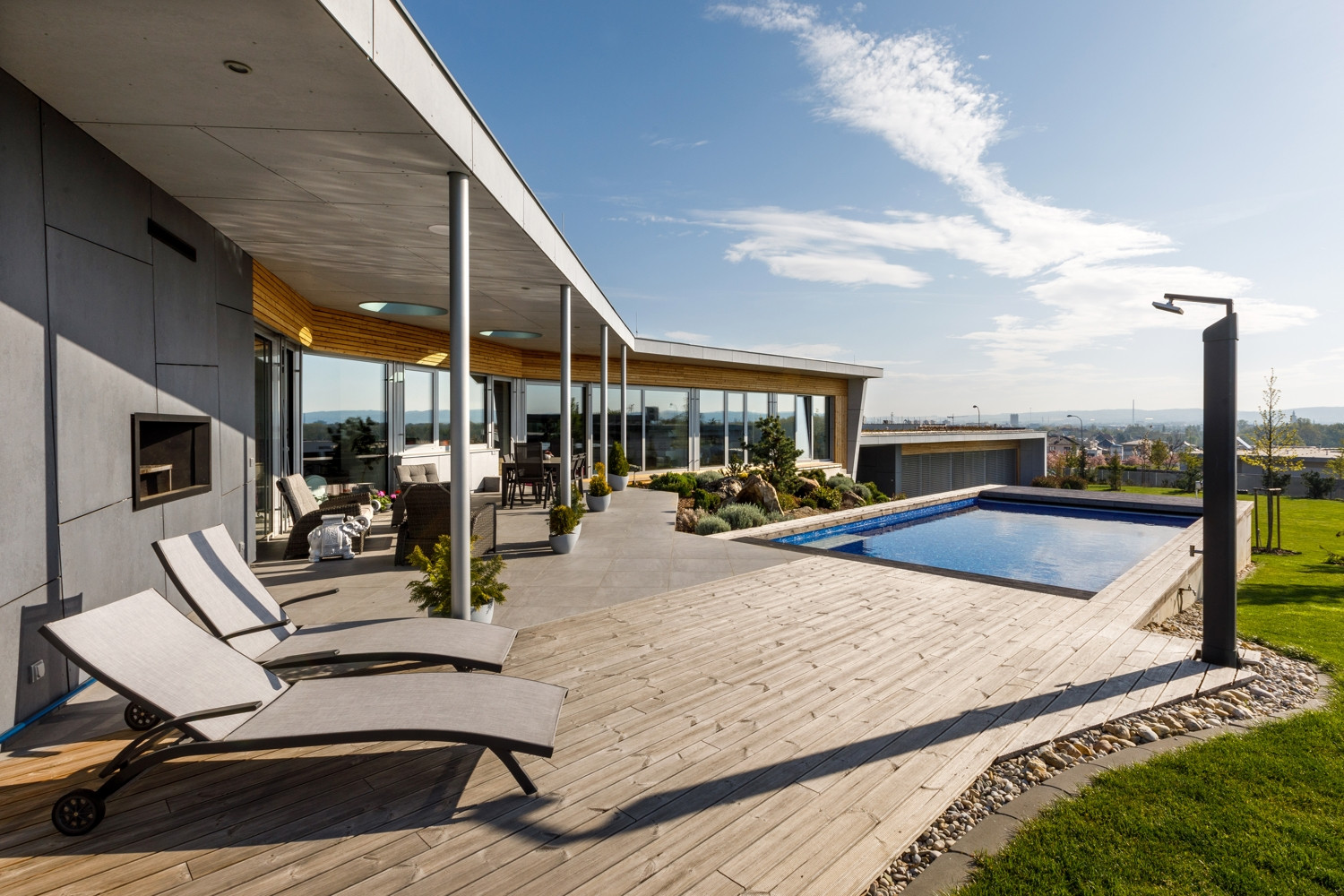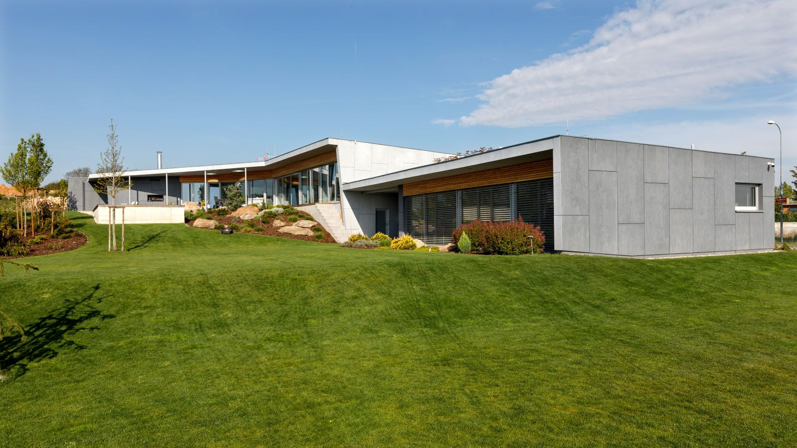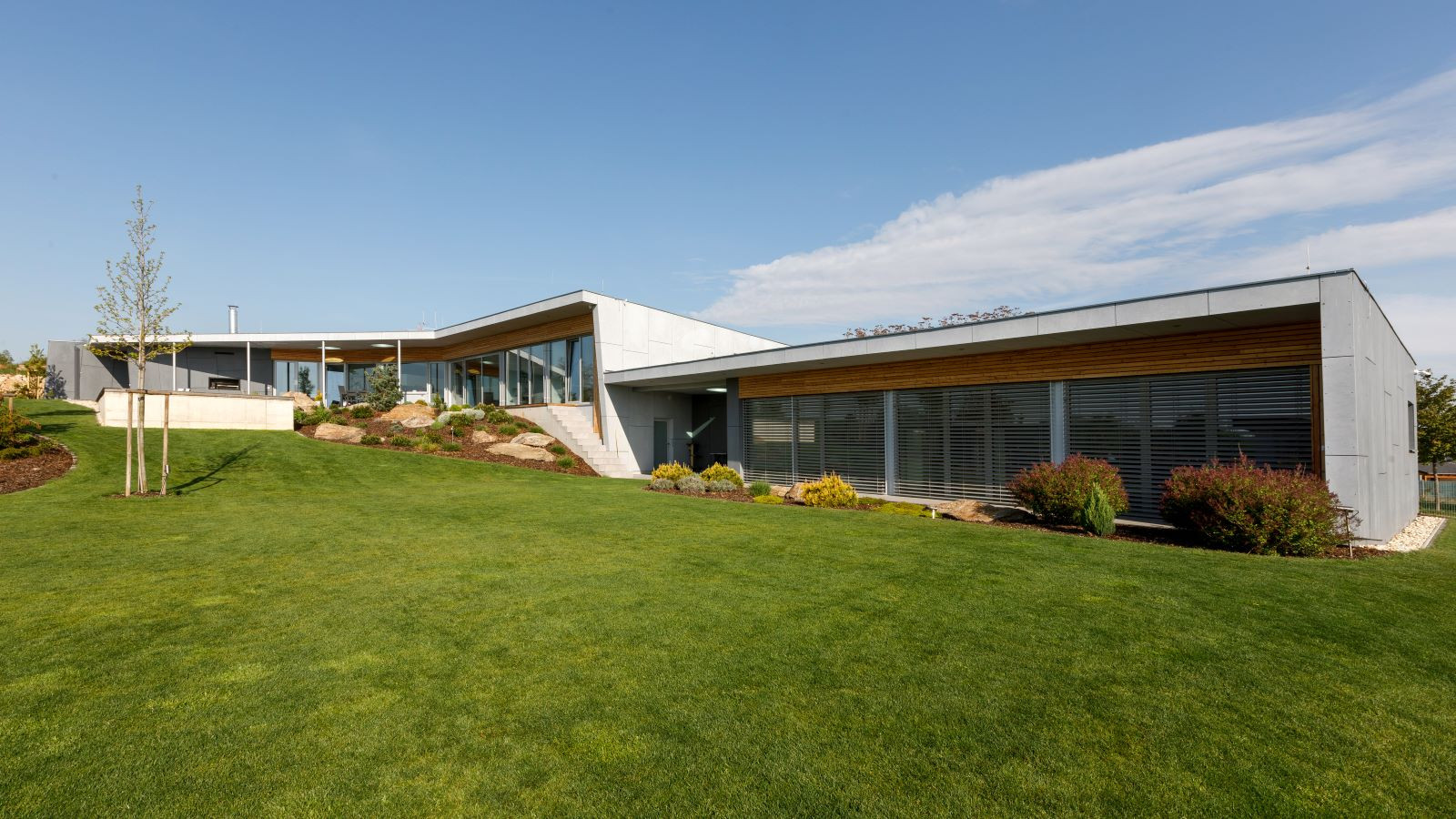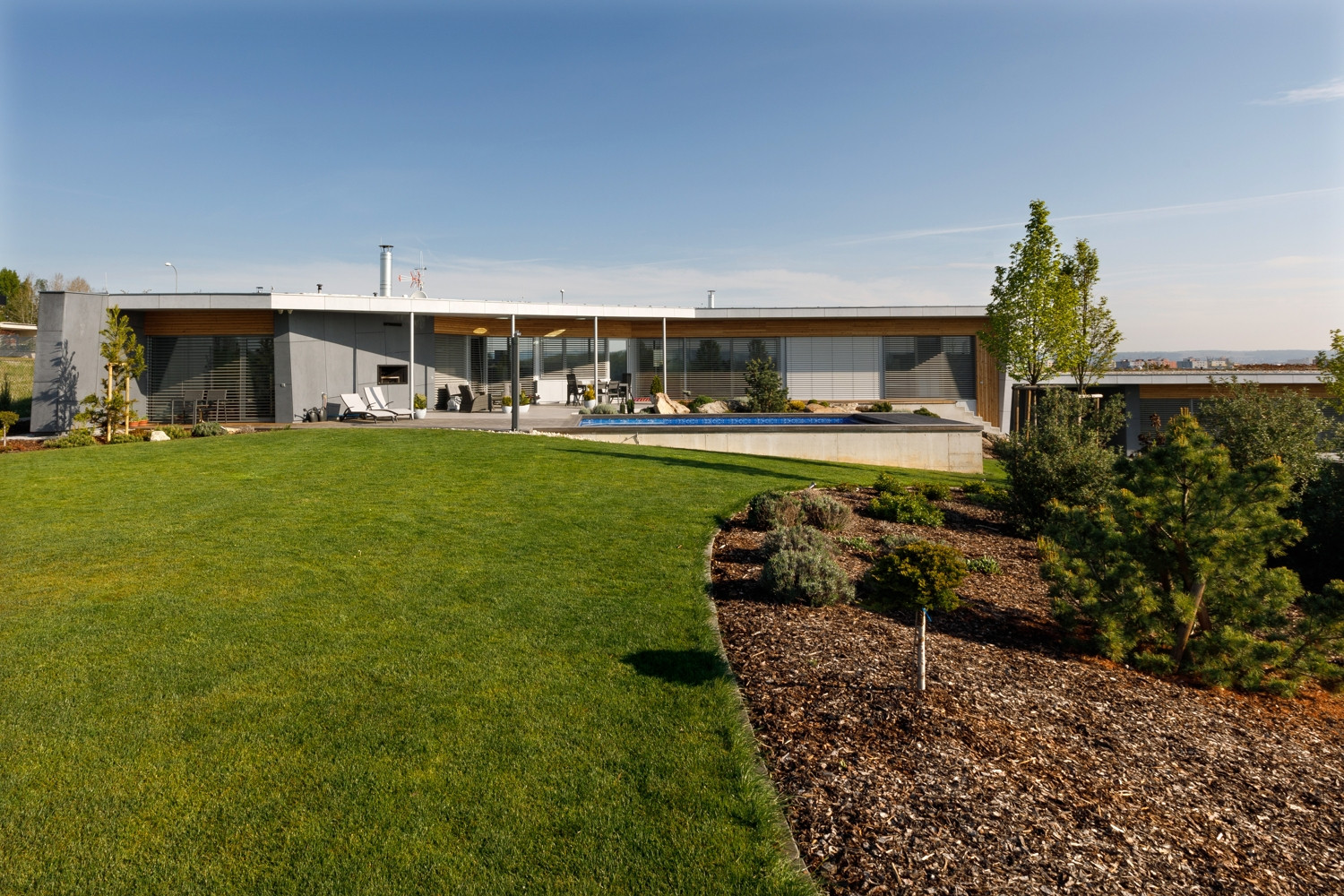 Oba domy jsou volně položeny do zahrady, která na ně zcela přirozeně navazuje. Na jižní straně pocit volnosti a krajiny umocňuje navazující pole a volný terén. Díky celoproskleným stěnám z vysoce tepelněizolačních hliníkových systémů Schüco AWS 90.SI+ s trojitým izolačním sklem (jsou vhodné i pro pasivní domy) si mohou obyvatelé domu užít krásné výhledy na panorama Českých Budějovic a okolí. Komfortní vstup na terasu zajišťují rovněž vysoce tepelně izolované posuvné dveře se zdvihem Schüco ASS 70.HI, s perfektní vodotěsností a zvukovou izolací. Prosklené plochy jsou navíc chráněny před sluncem přesahy střech a venkovními hliníkovými žaluziemi, v zimním období je naopak jejich zásluhou dům naplněn denním světlem. „Slunce a výhledy, to nám v minulém domě chybělo. Bydleli jsme v takovém malém ďolíku pod kopcem, kolem parcely vedla silnice, i když ne frekventovaná, tak přece jen to nebylo zcela komfortní. Teď jsme na kopci s krásnými výhledy a prosluněnou zahradou i domem,“ je spokojen investor.