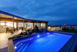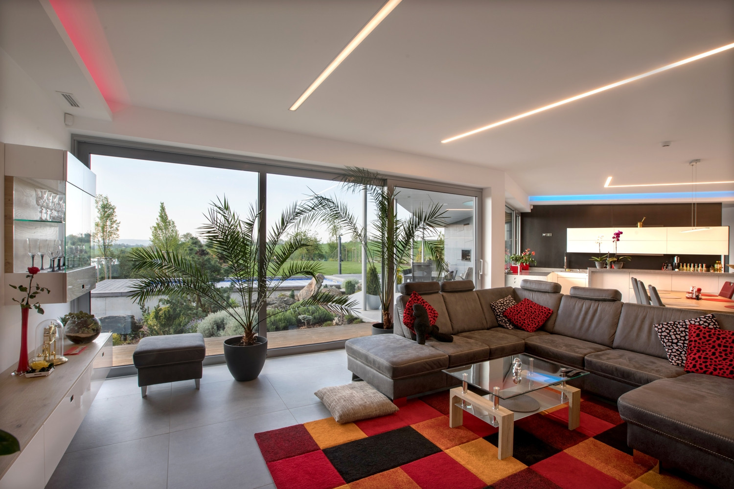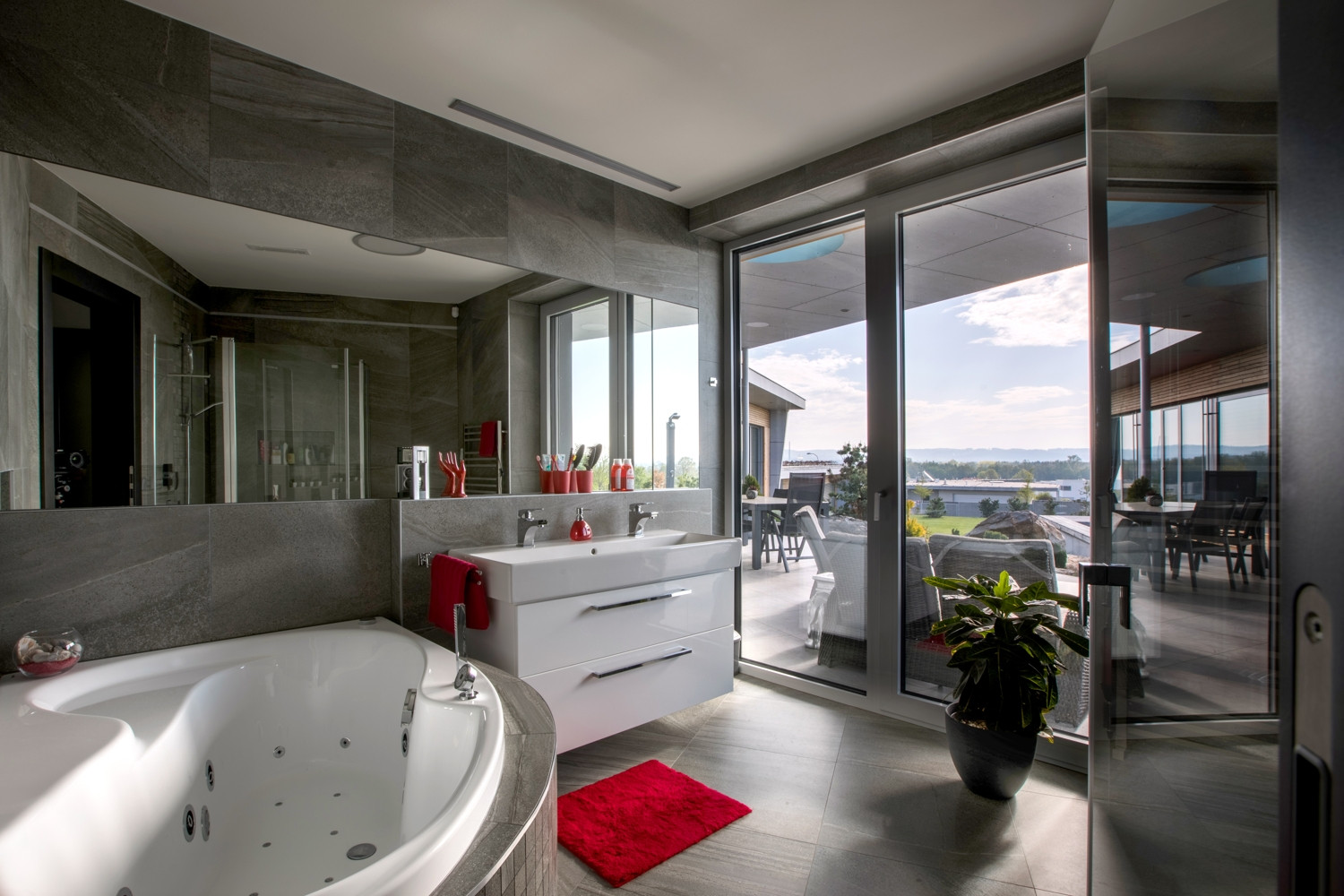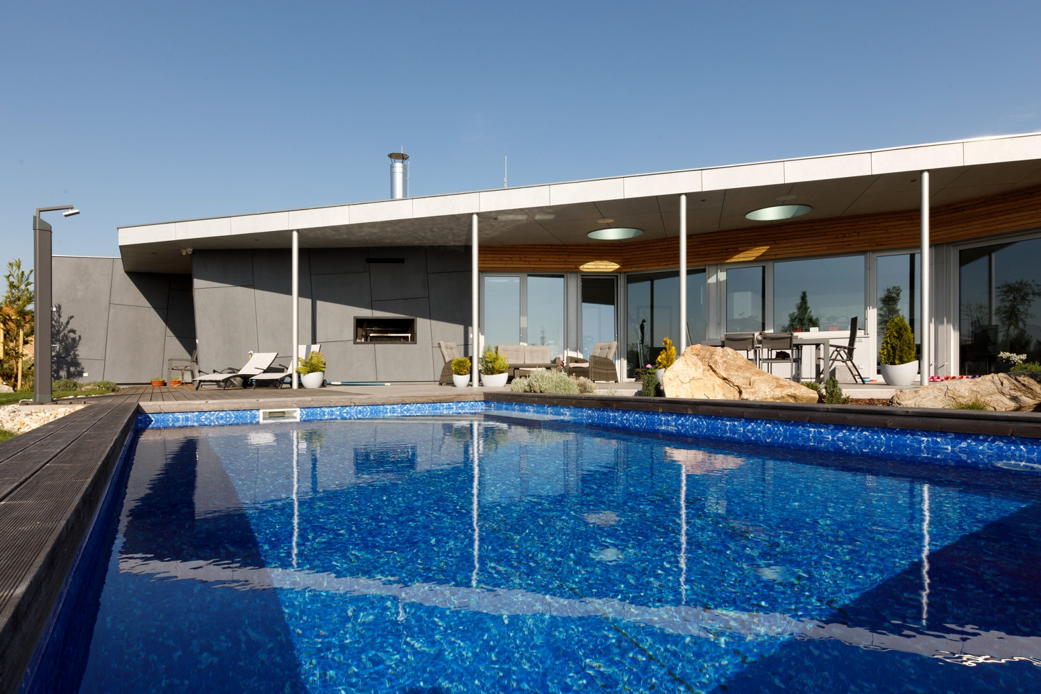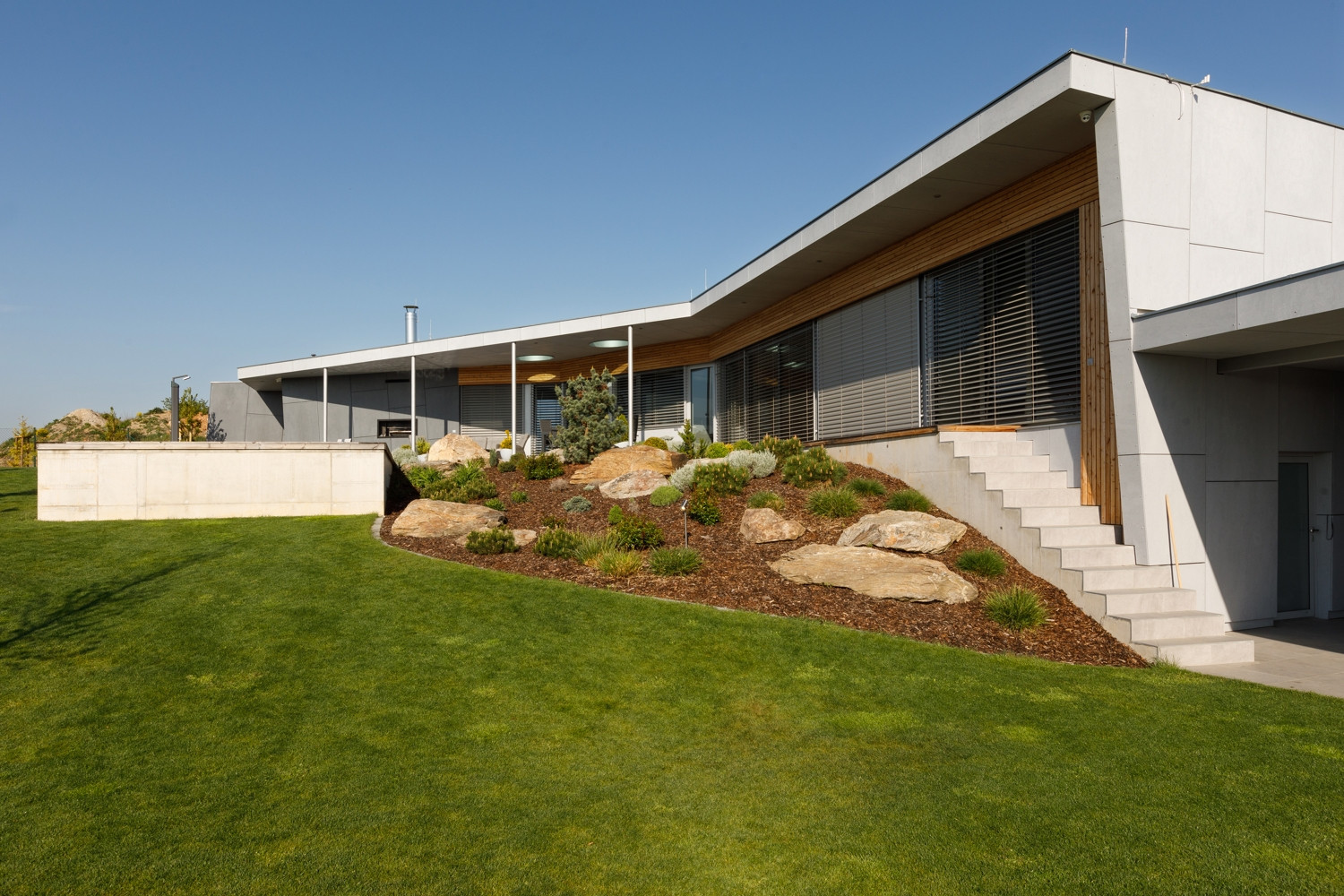 Oba domy jsou volně položeny do zahrady, která na ně zcela přirozeně navazuje. Na jižní straně pocit volnosti a krajiny umocňuje navazující pole a volný terén. Díky celoproskleným stěnám z vysoce tepelněizolačních hliníkových systémů Schüco AWS 90.SI+ s trojitým izolačním sklem (jsou vhodné i pro pasivní domy) si mohou obyvatelé domu užít krásné výhledy na panorama Českých Budějovic a okolí. Komfortní vstup na terasu zajišťují rovněž vysoce tepelně izolované posuvné dveře se zdvihem Schüco ASS 70.HI, s perfektní vodotěsností a zvukovou izolací. Prosklené plochy jsou navíc chráněny před sluncem přesahy střech a venkovními hliníkovými žaluziemi, v zimním období je naopak jejich zásluhou dům naplněn denním světlem. „Slunce a výhledy, to nám v minulém domě chybělo. Bydleli jsme v takovém malém ďolíku pod kopcem, kolem parcely vedla silnice, i když ne frekventovaná, tak přece jen to nebylo zcela komfortní. Teď jsme na kopci s krásnými výhledy a prosluněnou zahradou i domem,“ je spokojen investor.
