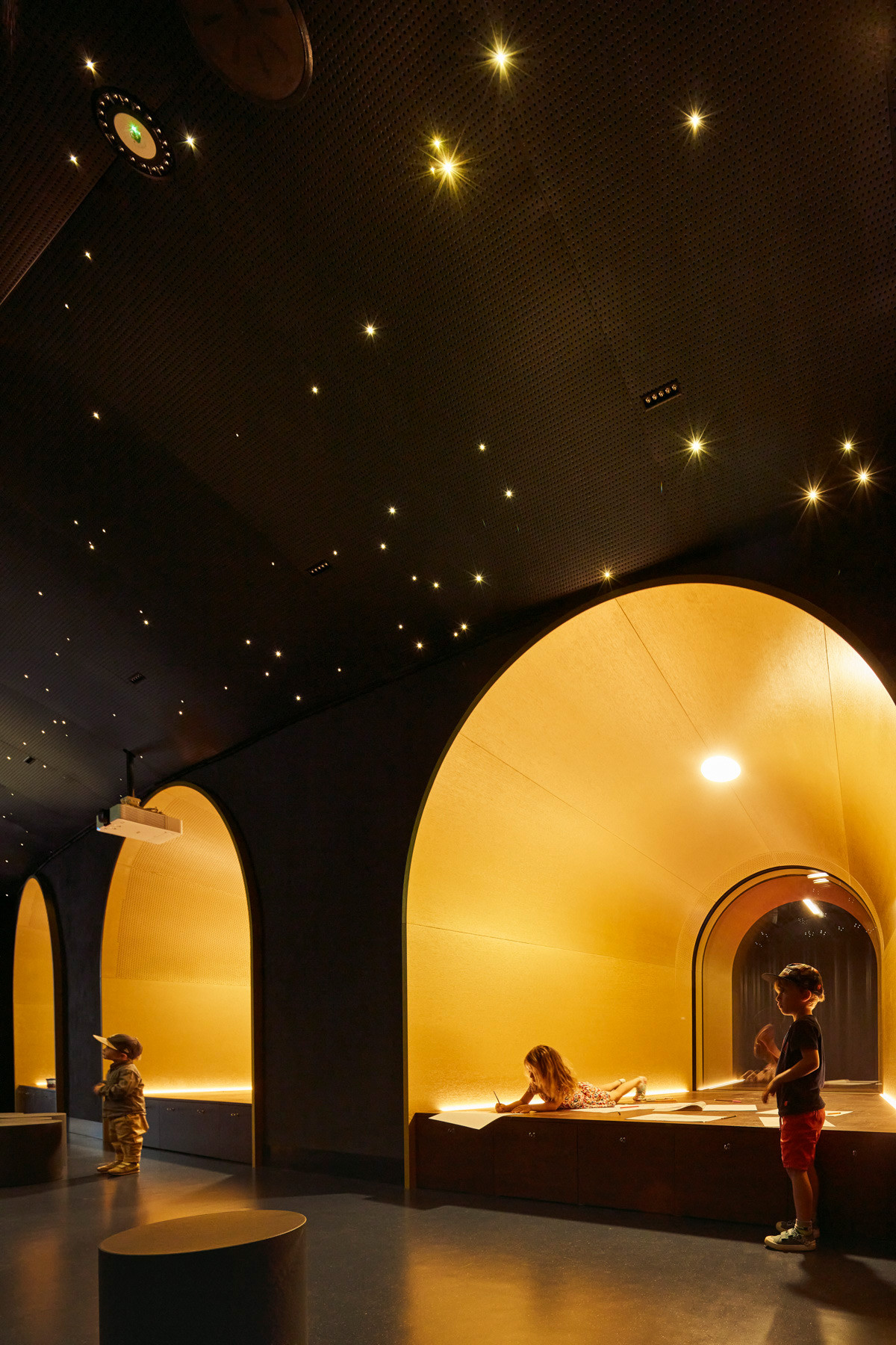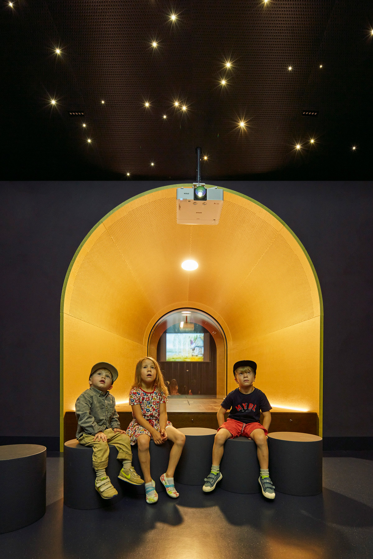 Dalším prostorem s velmi osobitou estetikou je respirium, které je pomocí prosklených výklenků vizuálně propojeno s prvním auditoriem, se kterým sdílí také svůj podélný tvar. „V respiriu dochází k velkému finále, ve kterém se všechny bodu programu v synergickém efektu složí do smysluplného celku. Sál slouží k projekcím, tvořivým workshopům či jako prostor pro relaxaci, uvolnění a zpracování zážitku. Efektní dřevěný lamelový strop, v němž je skryto osvětlení, umocňuje estetický dojem místnosti,“ popisují architekti.