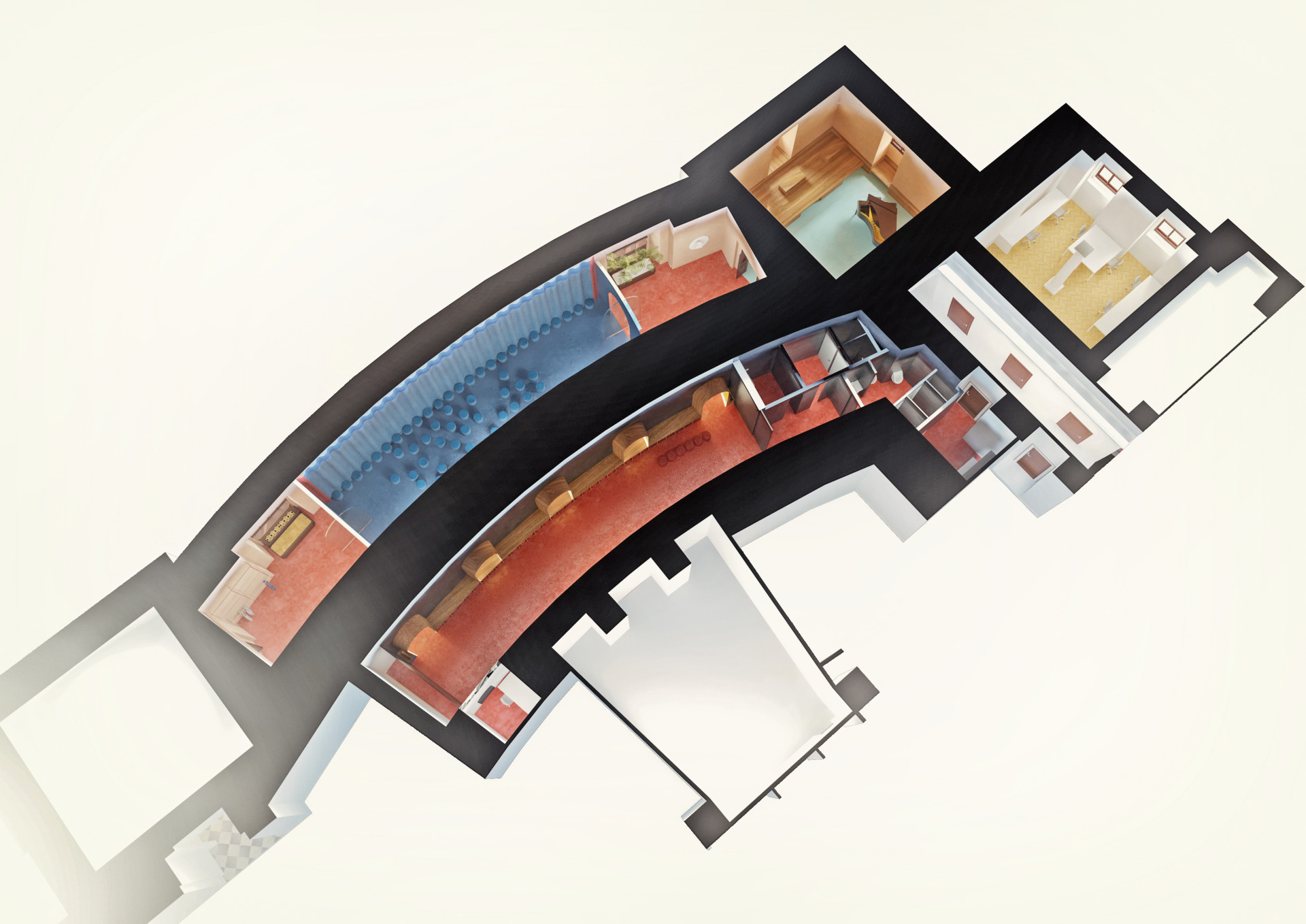 „Upravené prostory se nacházejí v přízemí historické budovy, v místě původních pokladen a kanceláří. Zdánlivě nevyhovující prostory se podařilo přizpůsobit jejich nové funkci a na první pohled zásadní limity a nedostatky přetvořit v jejich přednosti,“ vysvětlují architekti Pavel Nový a Vít Svoboda.