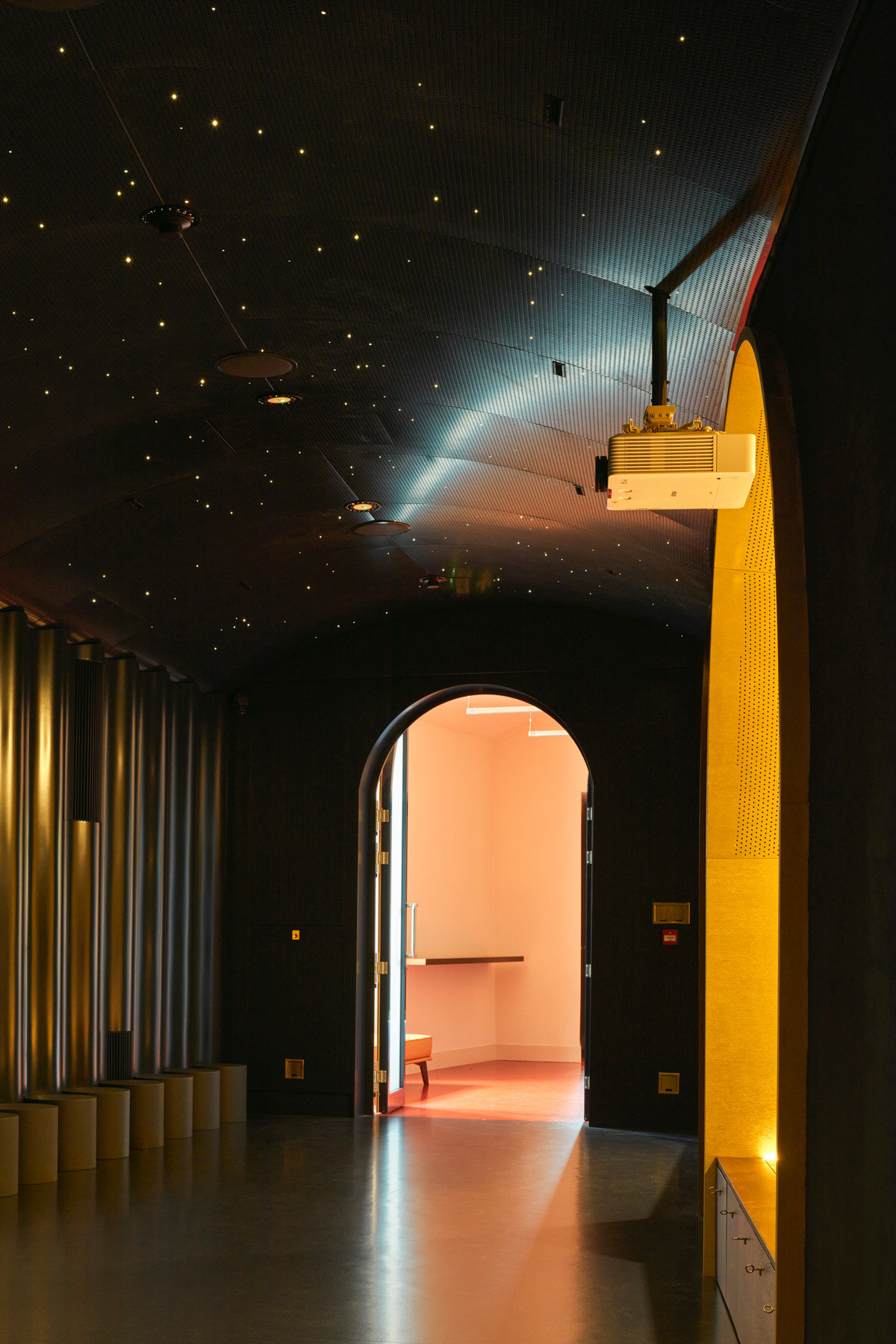 Návštěvníci vstupují z ulice 17. listopadu do vstupní haly se šatnou. Vzdělávací programy probíhají ve dvou auditoriích – první z nich zaujme především stropem ztvárněným jako noční obloha. Najdeme tu také trojici zlatých pódií, které svou barvou odkazující na materiály hudebních nástrojů doslova září v jinak tmavém prostoru. Naproti těmto pódiím se zabudovanými úložnými prostory se nachází zvlněná akustická stěna. Druhé auditorium je mnohem variabilnější a jeho hlavní prvek představuje zlatý strop. Funguje jako komorní koncertní síň, prostor pro lektorské workshopy i zázemí edukačního centra s různým uspořádáním sezení diváků.