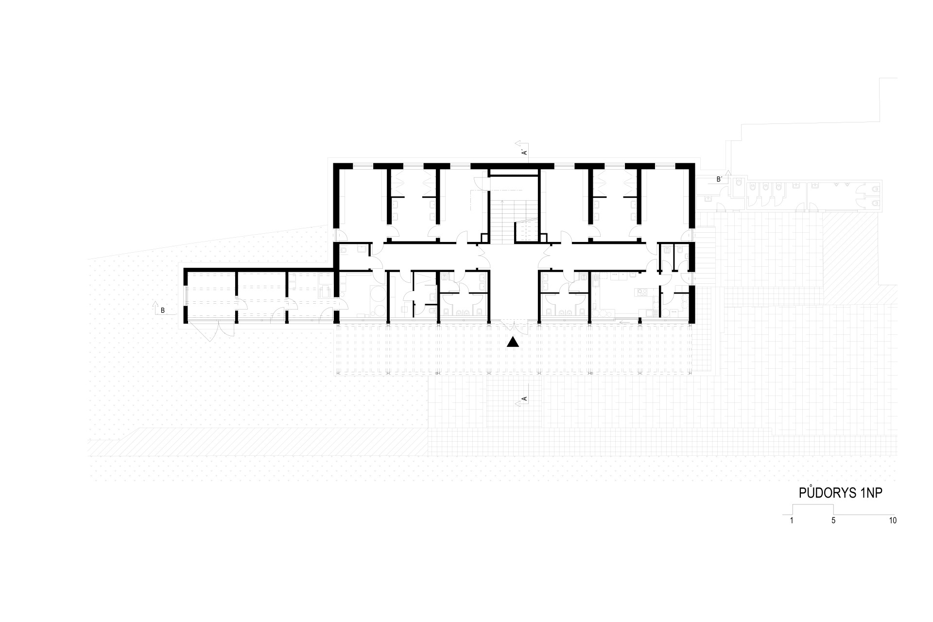 Šatny se nacházejí na přízemí, jsou uspořádány kolem centrální chodby a po dvojicích mají společné sprchy a toalety. „Dále se zde nachází bufet s výdejem přes okénko do krytého prostoru pod tribunou, zázemí pro rozhodčí a místnost s technologiemi,“ dodávají architekti. V patře je zase klubovna, kancelář a posilovna odkud je výhled na hřiště.