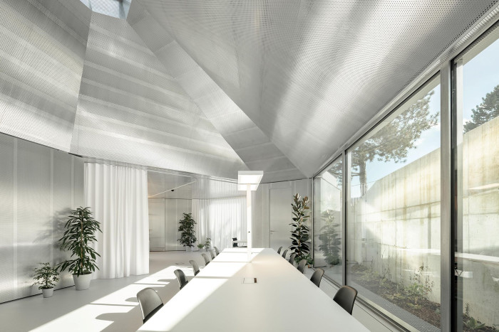Při volbě materiálů v interiéru zvítězilo lokální topolové dřevo. Desky kancelářských stolů pak byly vyrobeny na zakázku z borovice ze severního Španělska. Vybavení prostoru doplnily i židle od dr. Cato, španělského návrháře nábytku a přítele studia, které vedou architekti Ignacio de la Vega a Pillar Cano-Lasso. Stěny zdobí abstraktní umělecké dílo složené ze strojové prošitých historických látek, tzv. Delavegacanolasso.