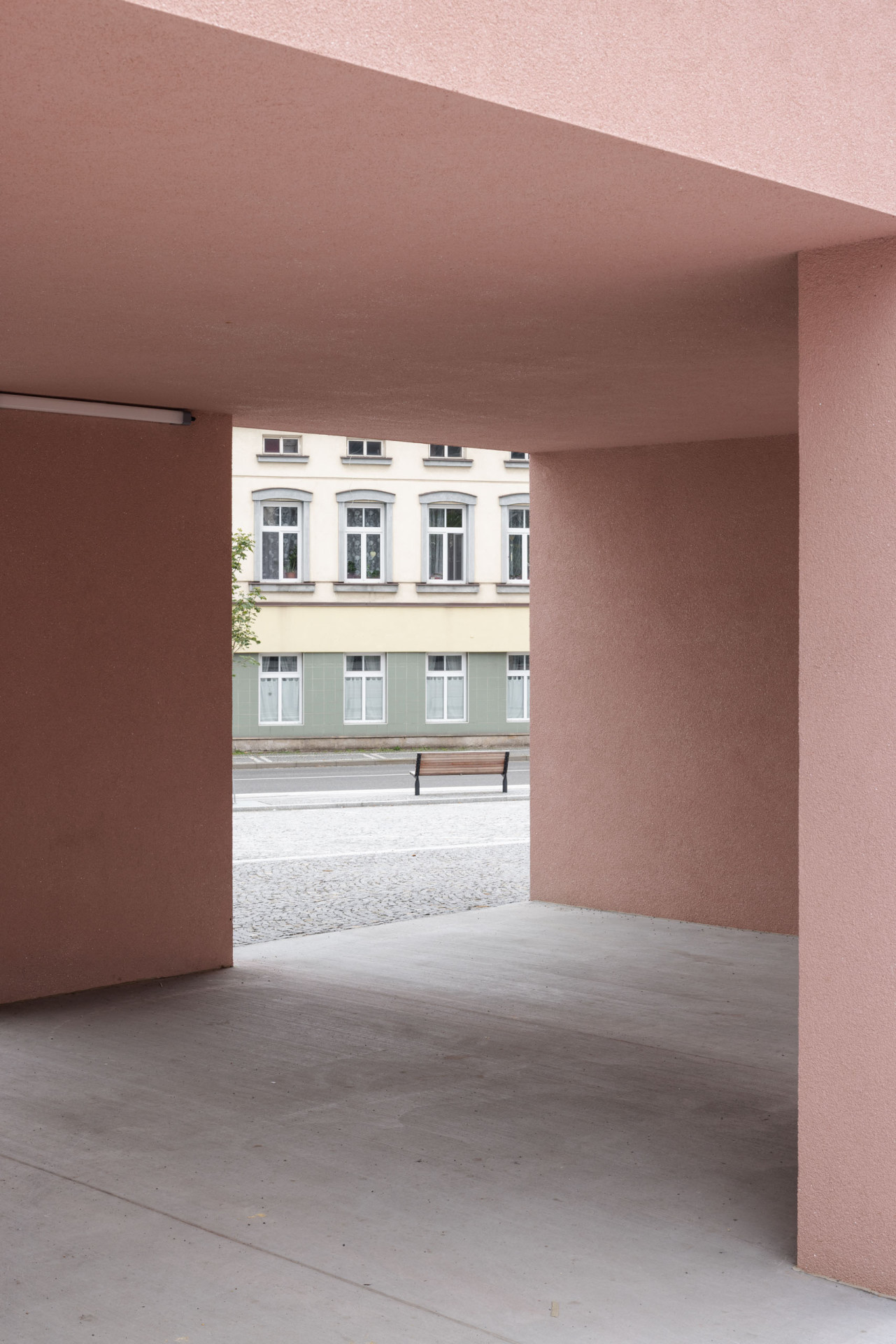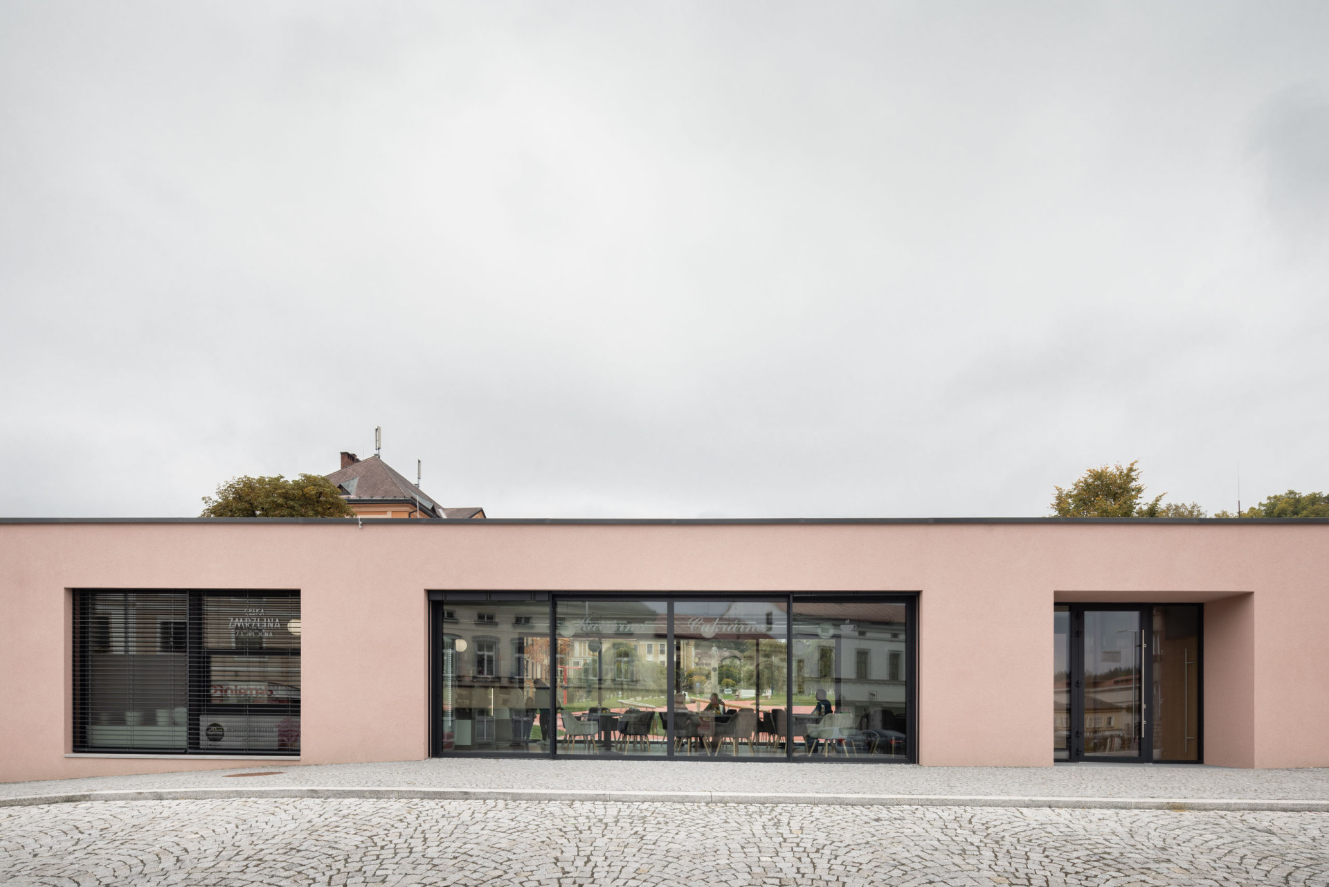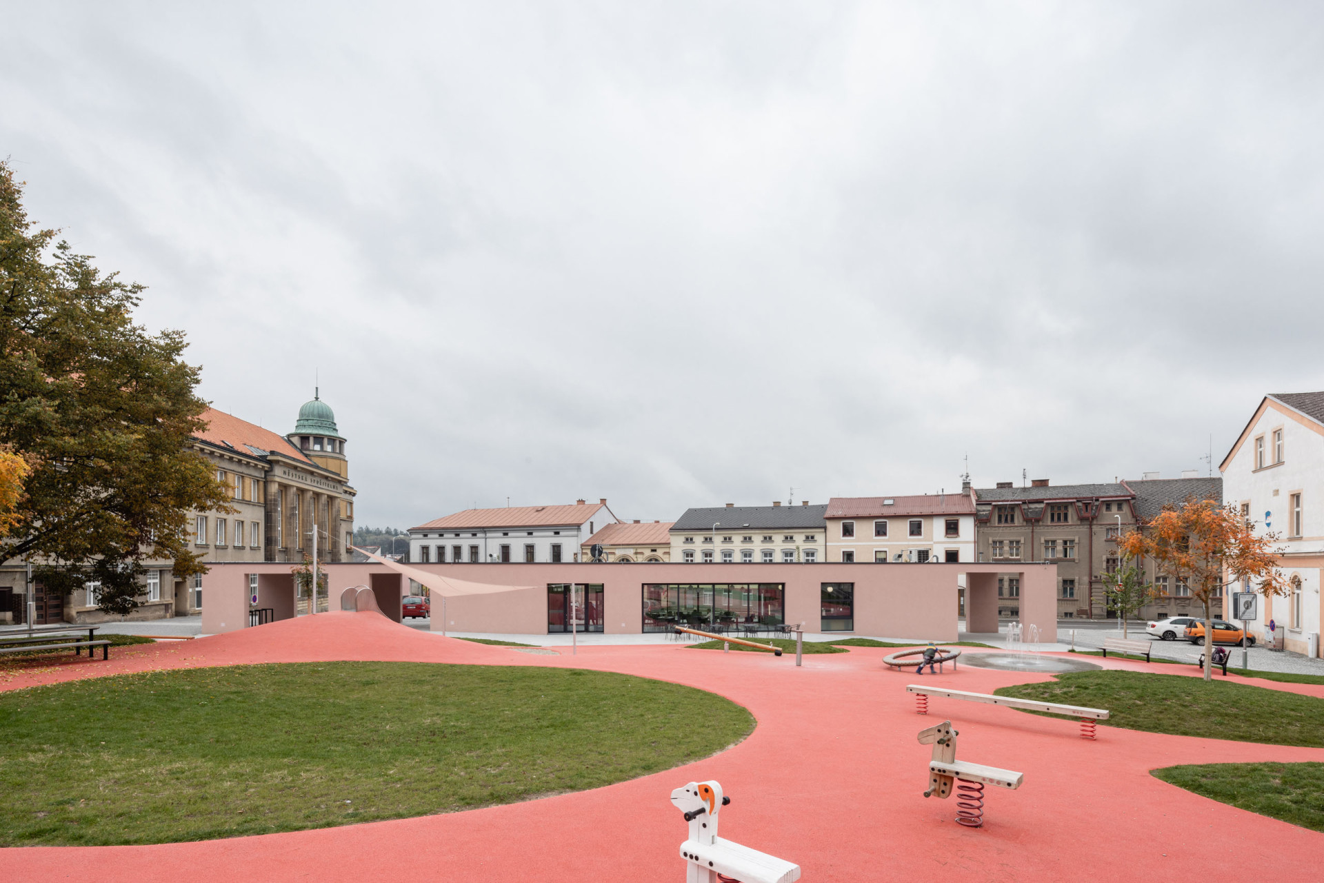 Ačkoliv je pavilon střídmý, rozhodně není nudný – díky růžovým fasádám si ho skutečně všimne každý. Barva, která se přeci jen pro Červený Kostelec hodí, se dále přelévá i na pochozí plochy, křivolaké cesty, které se táhnou přes nové dětské hřiště a okolo fontány. Na hravou část veřejného prostranství pak navazuje formálnější zóna s parkovou úpravou, kterou v budoucnosti ještě zpříjemní vzrostlé stromy.