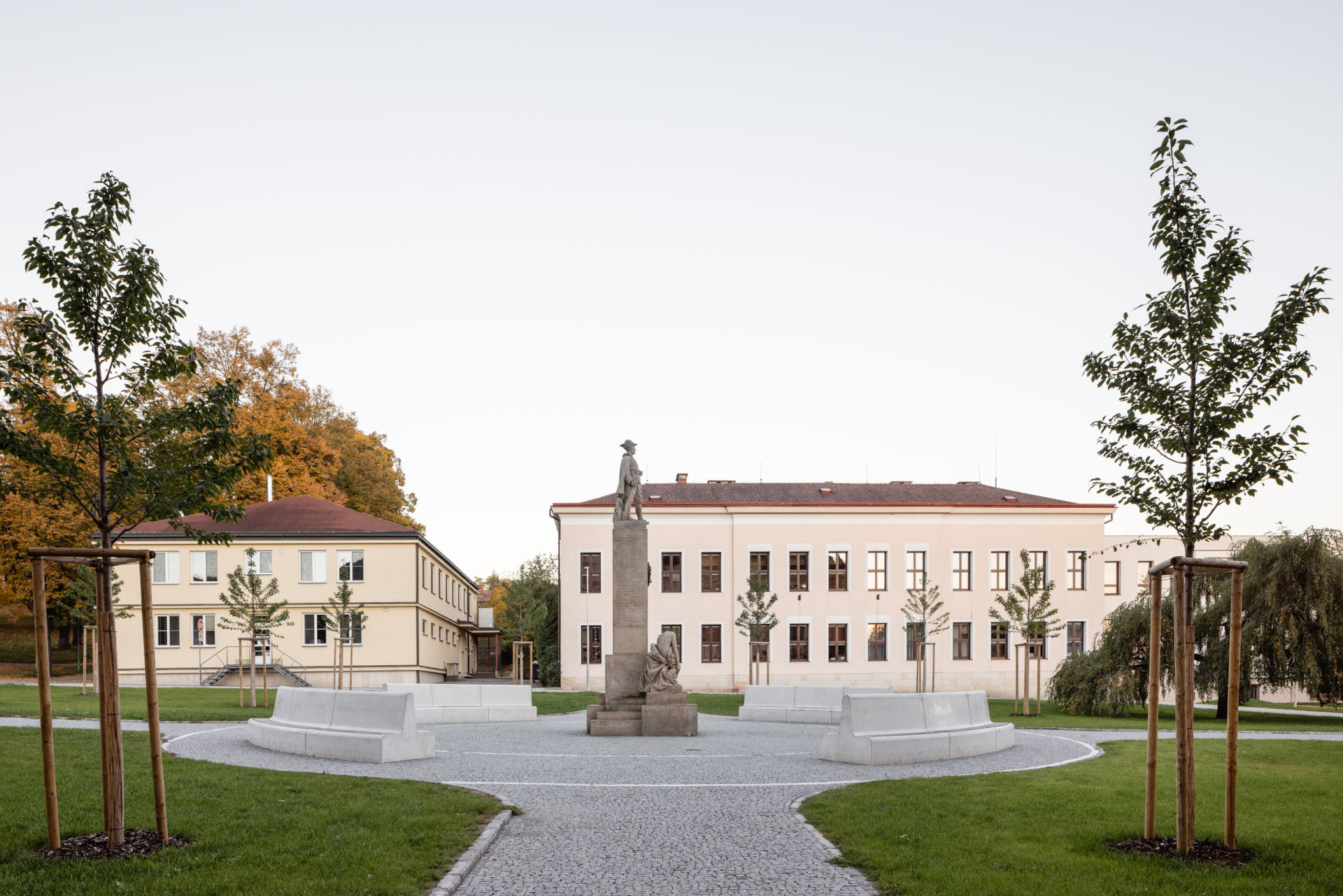 Nové veřejné prostranství se nachází mezi dvěma školními budovami – jednou je i monumentální objekt bývalé městské spořitelny z roku 1928. Původní charakter a architektura místa sehrála při navrhování pavilonu a jeho okolí důležitou roli. „Autorská ambice byla soustředěna do pár bodů lokality, jinak se návrh snažil zejména podpořit stávající kvality prostředí,“ říkají autoři. Pavilon dostal podobu nízké podlouhlé hmoty s mnoha průhledy, díky kterým se nestal neprostupnou bariérou, účinně však oddělil volnočasové prostranství od místní silnice. Dnes v něm funguje cukrárna.