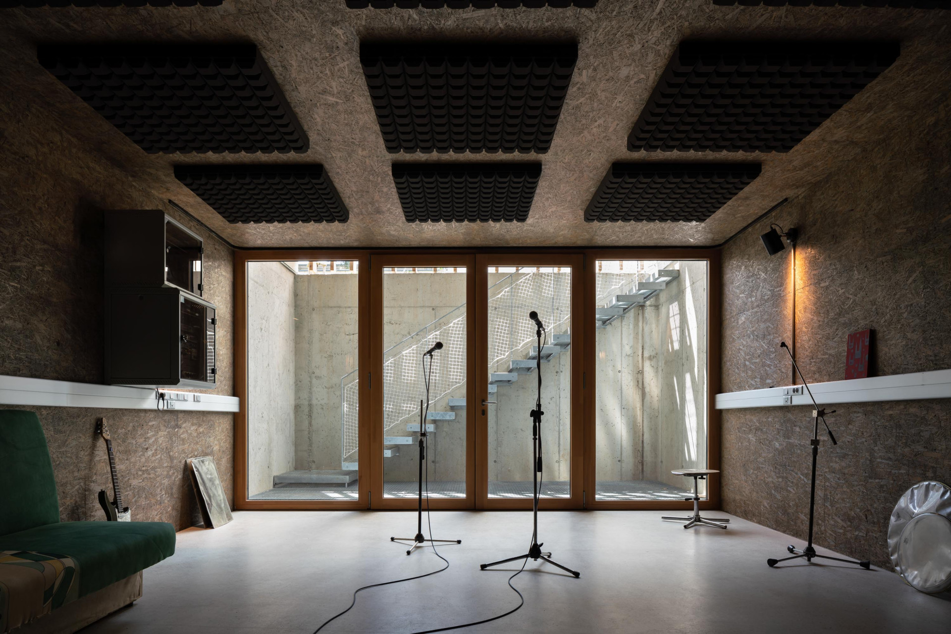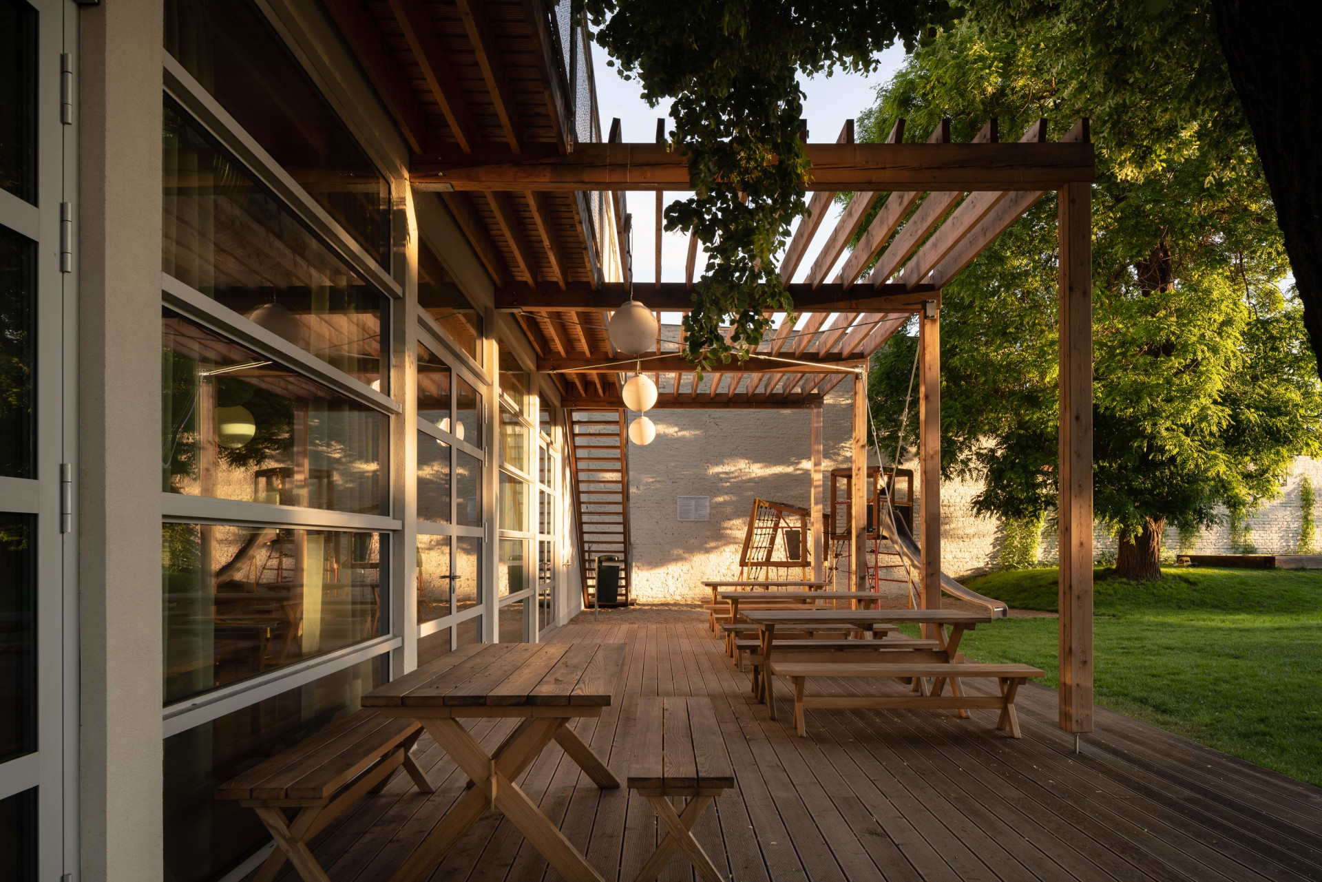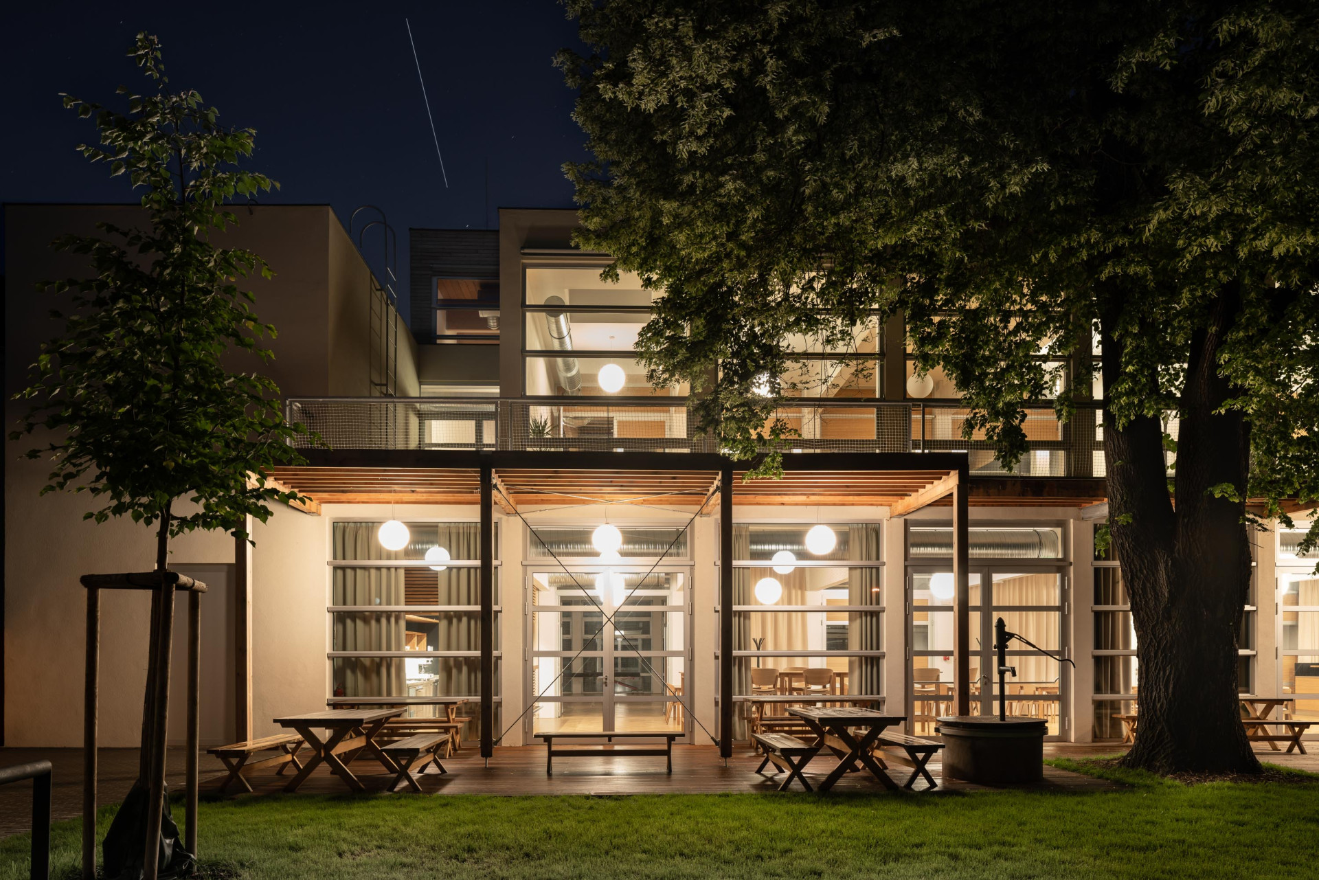 V zahradě je červená víceúčelová sportovní plocha, a taky klubovna, která zároveň slouží jako tribuna/jeviště/místo pro promítání. V jejím suterénu je zase hudební zkušebna. Stojí zde i samostatný sklad – bývalé stavení, do kterého se schovává třeba zahradní nábytek pro slavnosti. Mimo to obsahuje zázemí pro klub seniorů, které se prakticky otevírá pohledu ven. Na otevřenosti je ostatně postavený celý areál, jednotlivé prostory se dají vzájemně propojovat nebo izolovat. Na krytou terasu za hospodou si tak můžete přijít sednout, i když se zrovna nic nehraje.