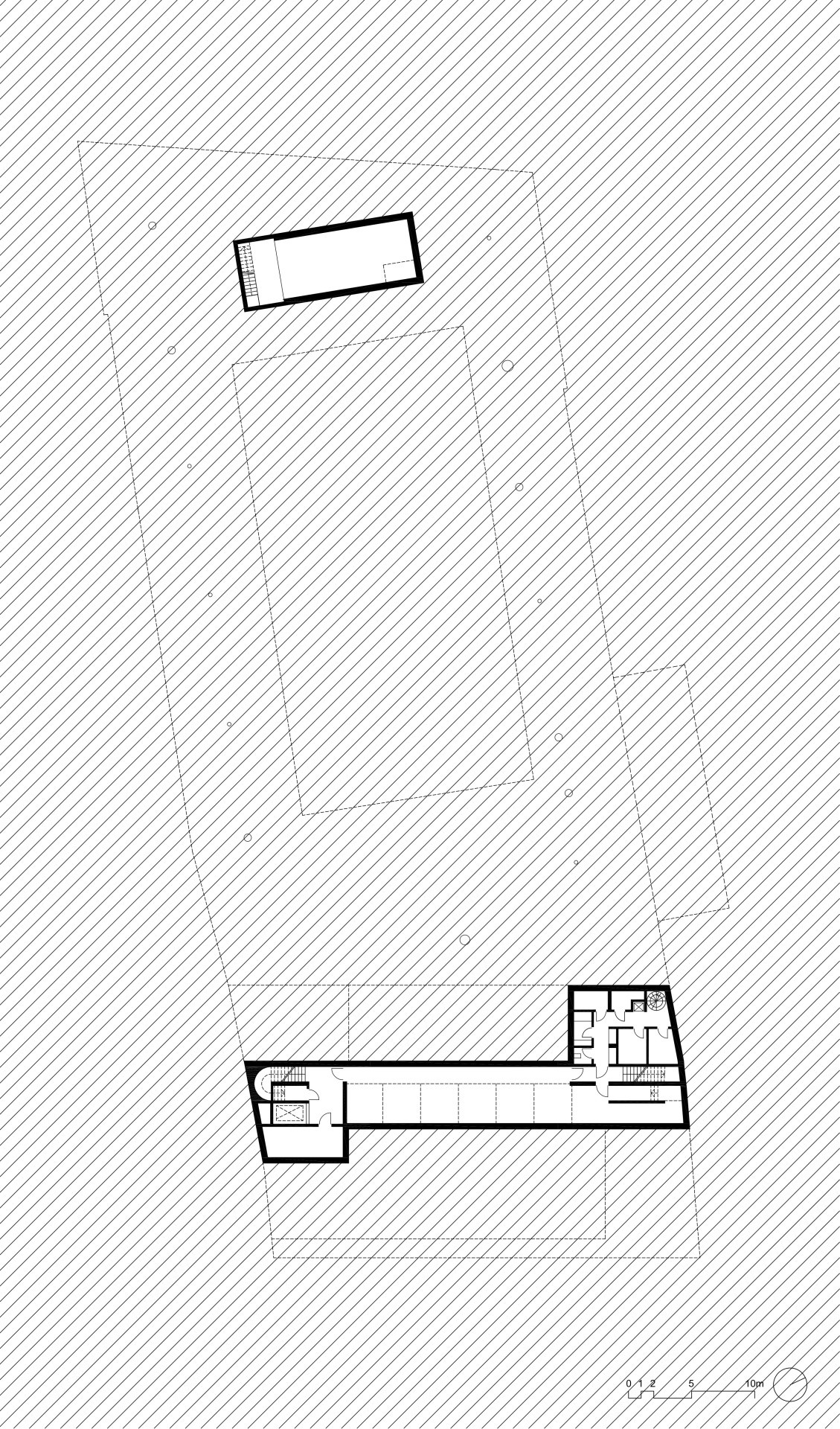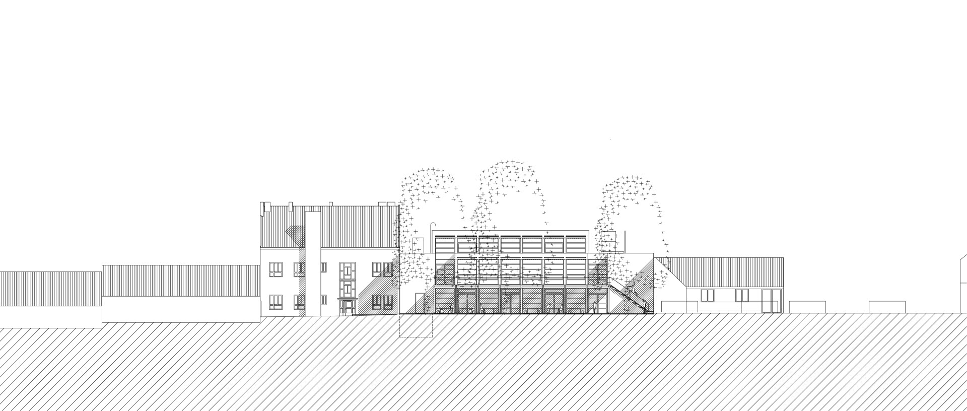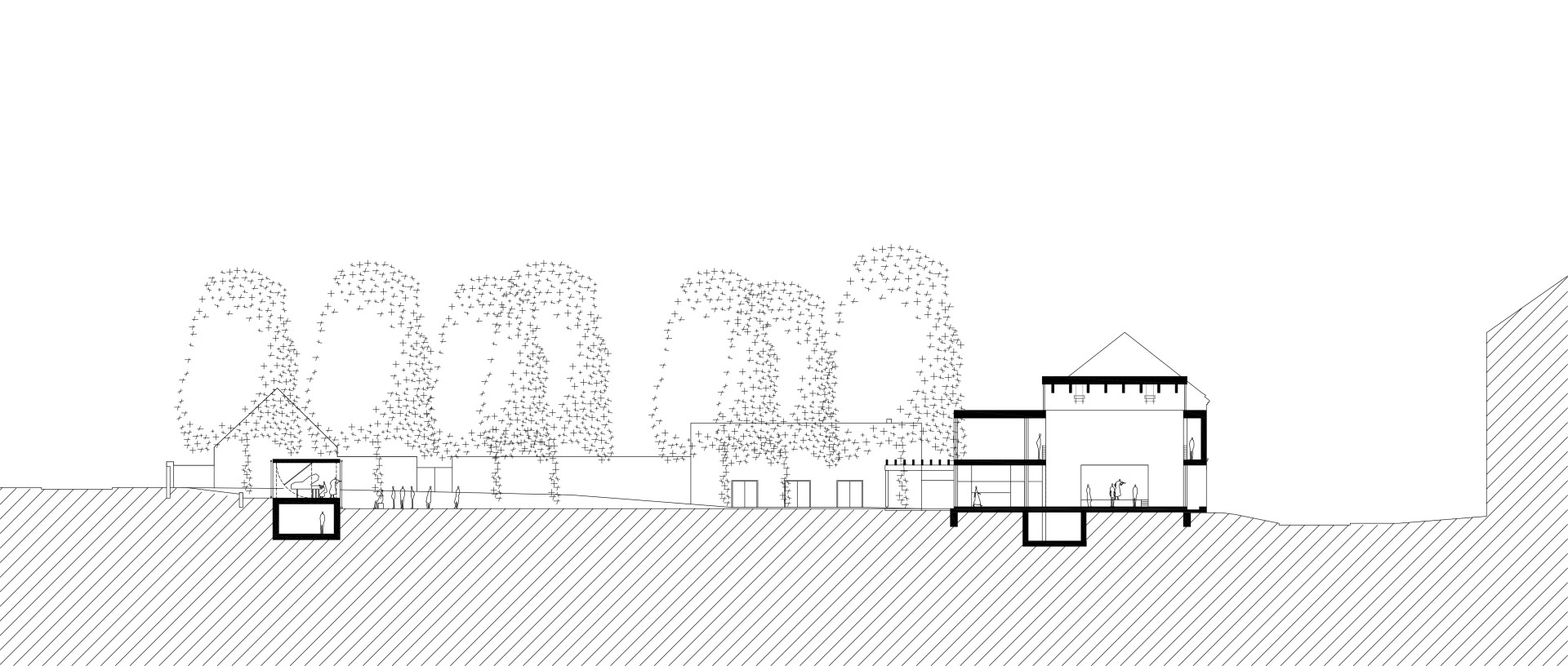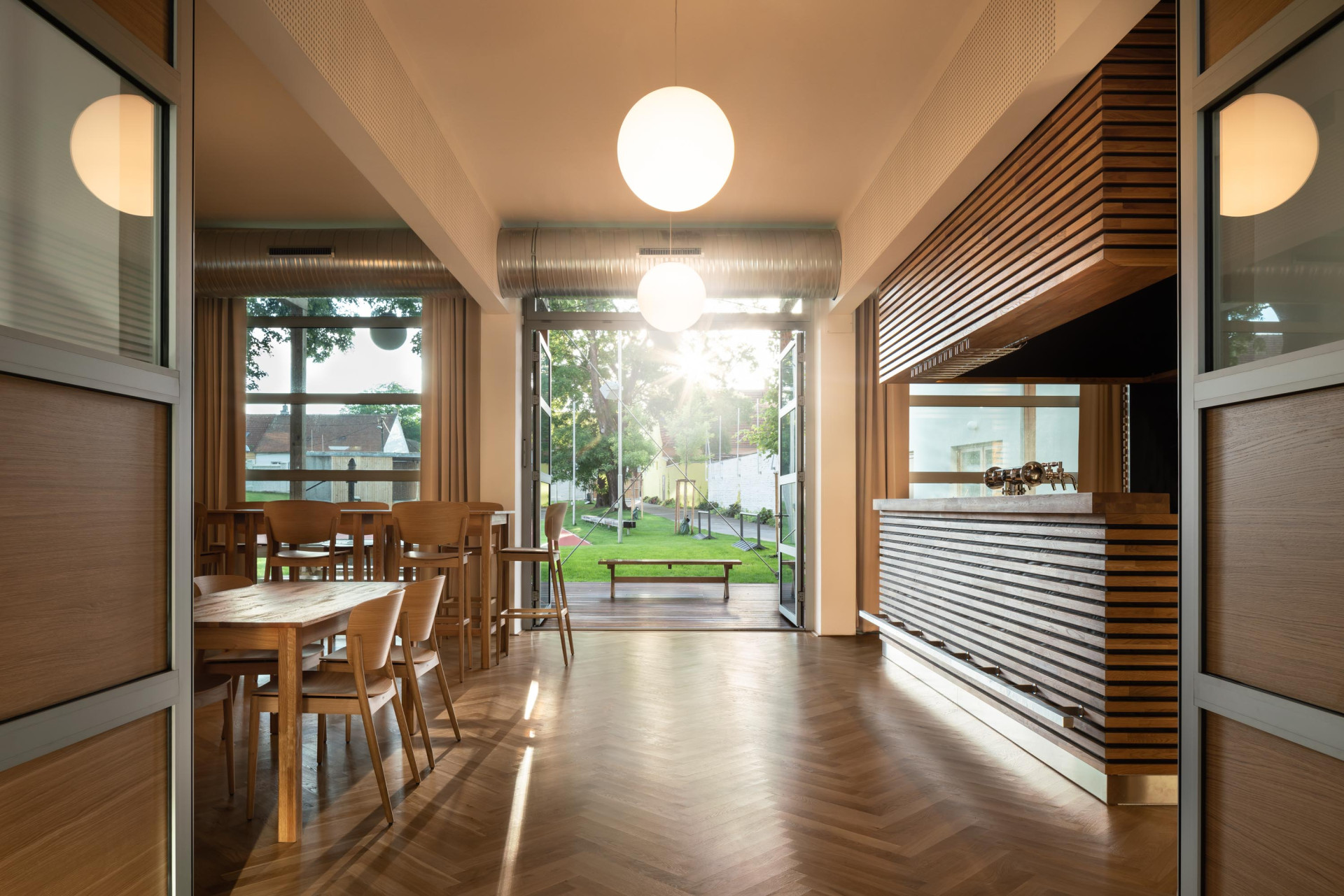 V zahradě je červená víceúčelová sportovní plocha, a taky klubovna, která zároveň slouží jako tribuna/jeviště/místo pro promítání. V jejím suterénu je zase hudební zkušebna. Stojí zde i samostatný sklad – bývalé stavení, do kterého se schovává třeba zahradní nábytek pro slavnosti. Mimo to obsahuje zázemí pro klub seniorů, které se prakticky otevírá pohledu ven. Na otevřenosti je ostatně postavený celý areál, jednotlivé prostory se dají vzájemně propojovat nebo izolovat. Na krytou terasu za hospodou si tak můžete přijít sednout, i když se zrovna nic nehraje.