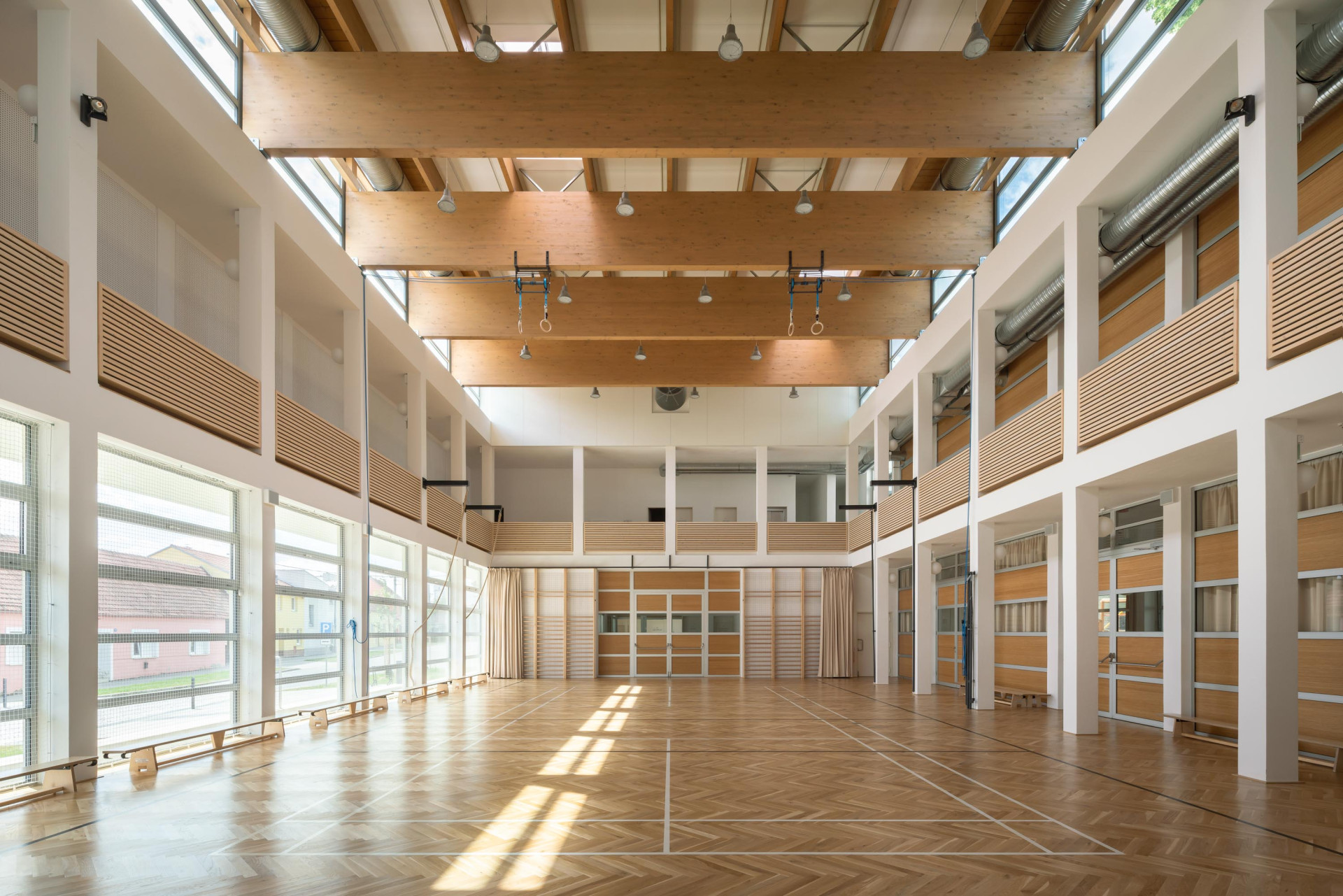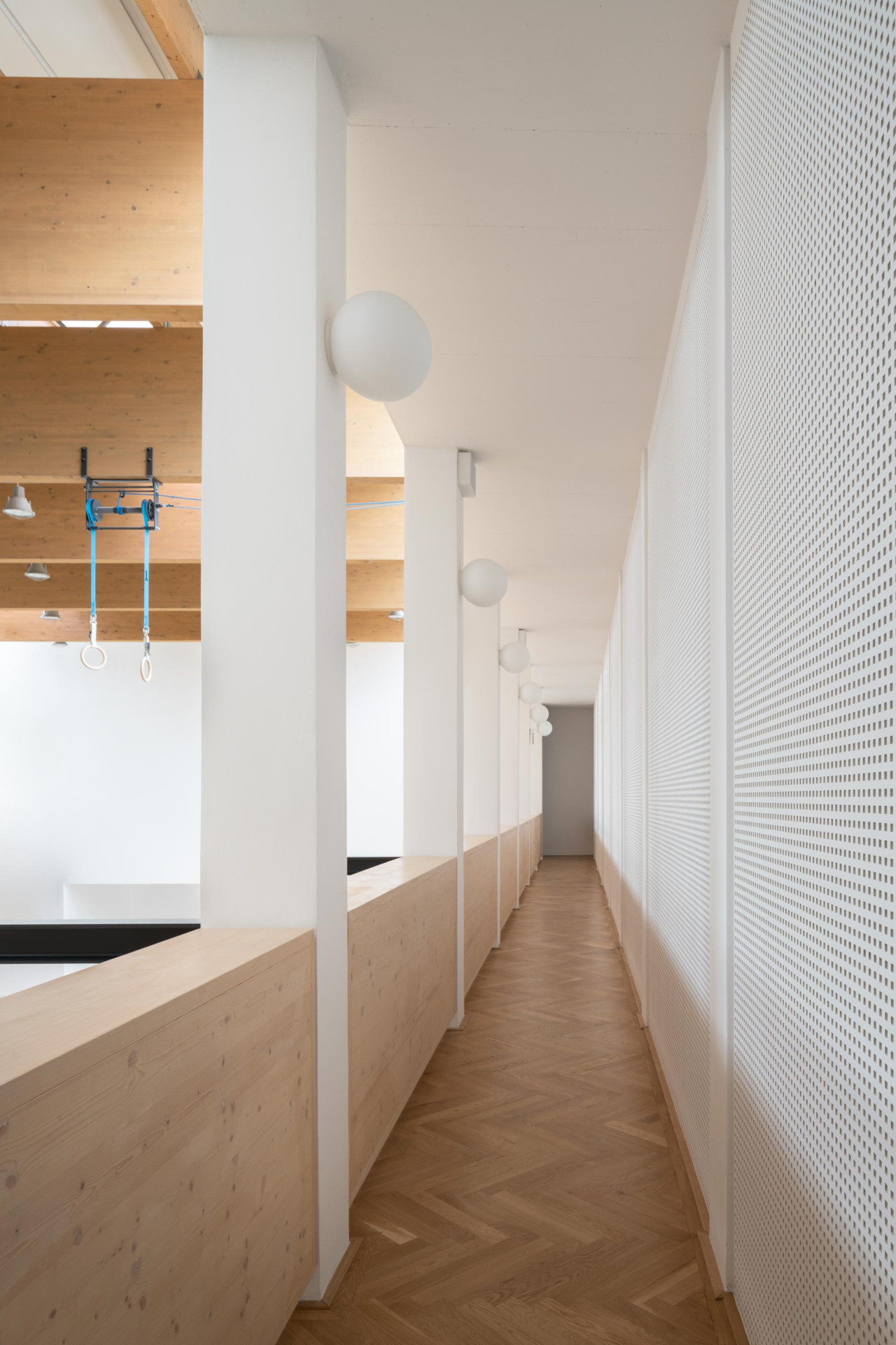 Budovou prostupuje bílá barva a dřevo. Všechny prostory – hospoda, tělocvična, menší sály v patře a taky ochoz, ze kterého se dá shlížet na sportovní plochu, se tak vizuálně propojují