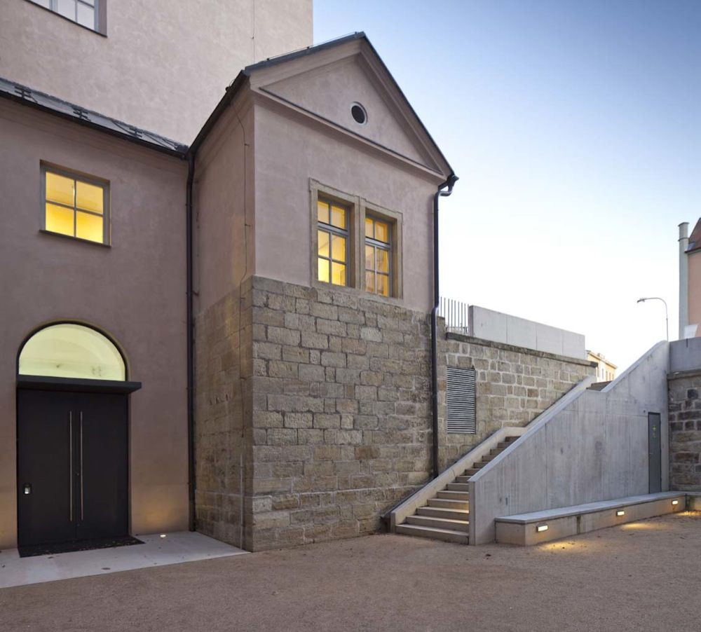 Sklepní prostor 1.NP je řešen tak aby byl co nejvíce čitelný původní velkorysý prostorový koncept. Kvůli nekvalitním stávajícím povrchovým úpravám a nutnému zásahu do skladeb podlah a stěn (hydroizolační konstrukce – odvod vlhkosti z prostor), jsou nehodnotné povrchy nově upraveny. Pouze pod západní kaplí jsou, dle restaurátorského průzkumu, zachovány a restaurovány fresky. Na přízemí navazuje dvůr ohraničený opěrnou zdí a spojený rampami se zahradami. Arkády na úrovni dvora jsou jednoduše zaskleny a tvoří tepelný filtr mezi interiérem a exteriérem. Vše je v jednoduchých lineárních liniích, či plochách, tak aby nedocházelo k výrazové kolizi s původním historickým objektem.