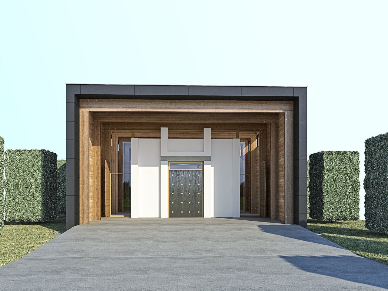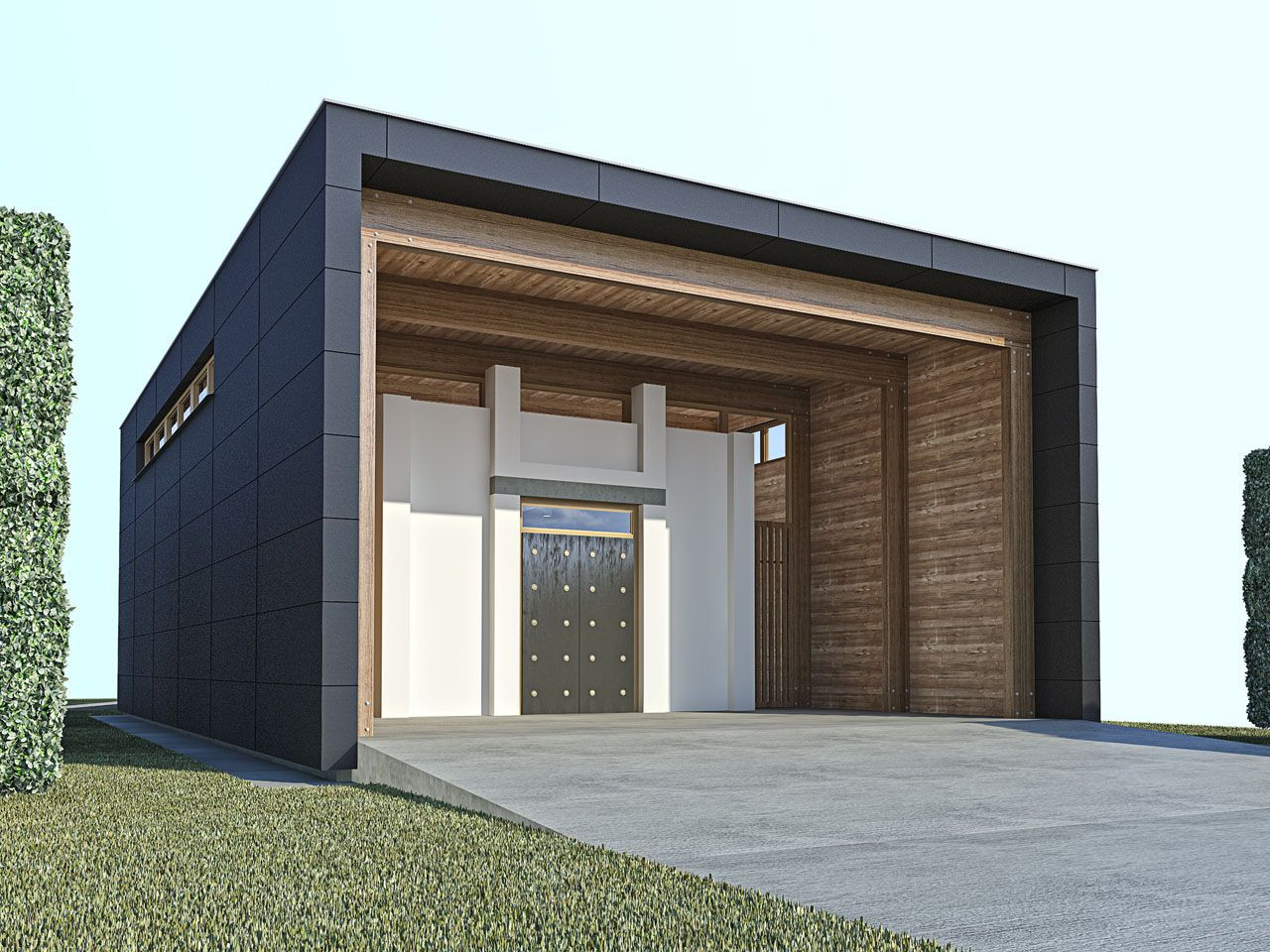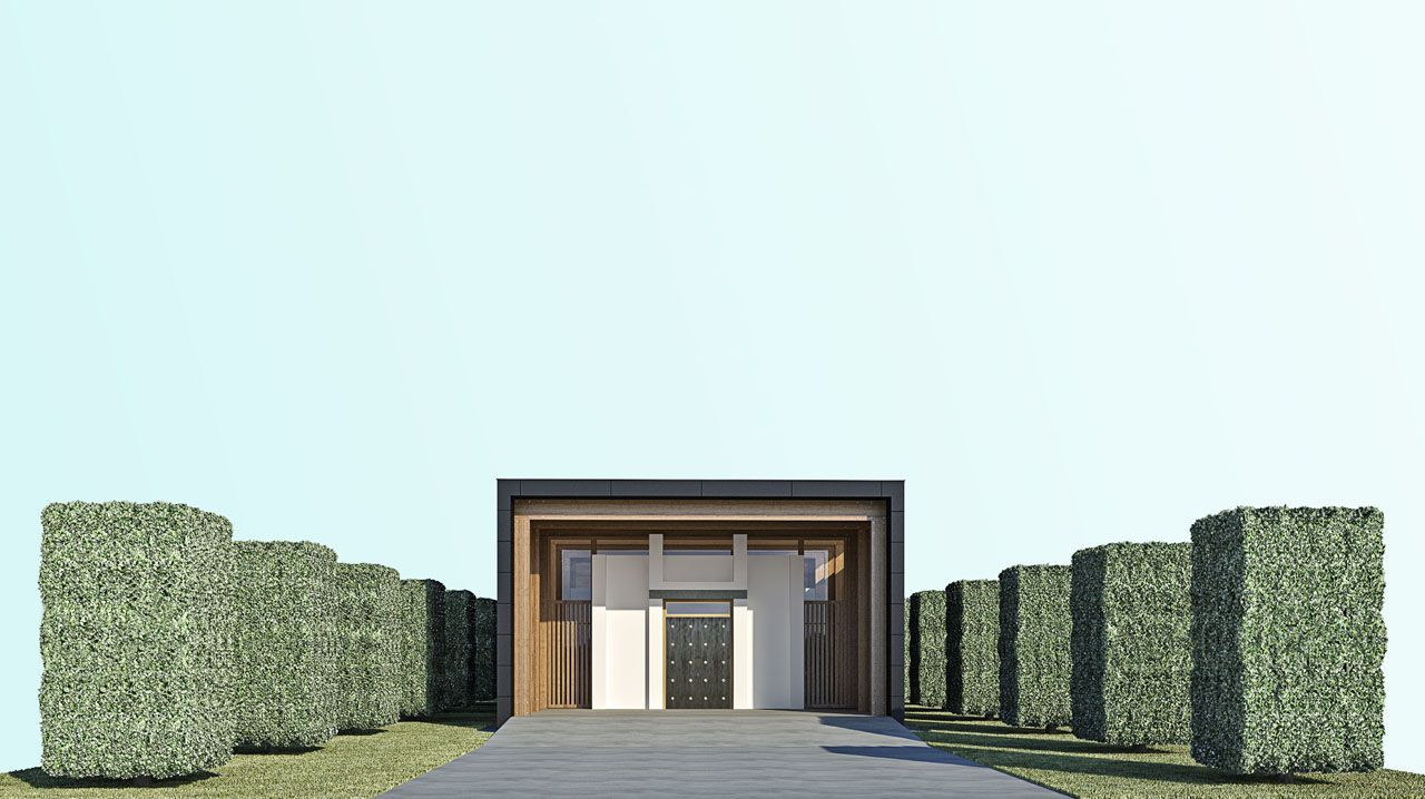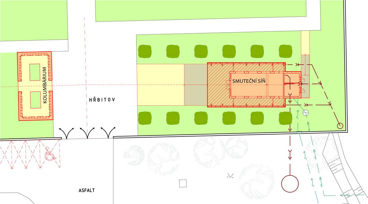 Hlavní vstupní závětří je širokou nástupní plochou spojeno s centrálním hřbitovním prostorem.