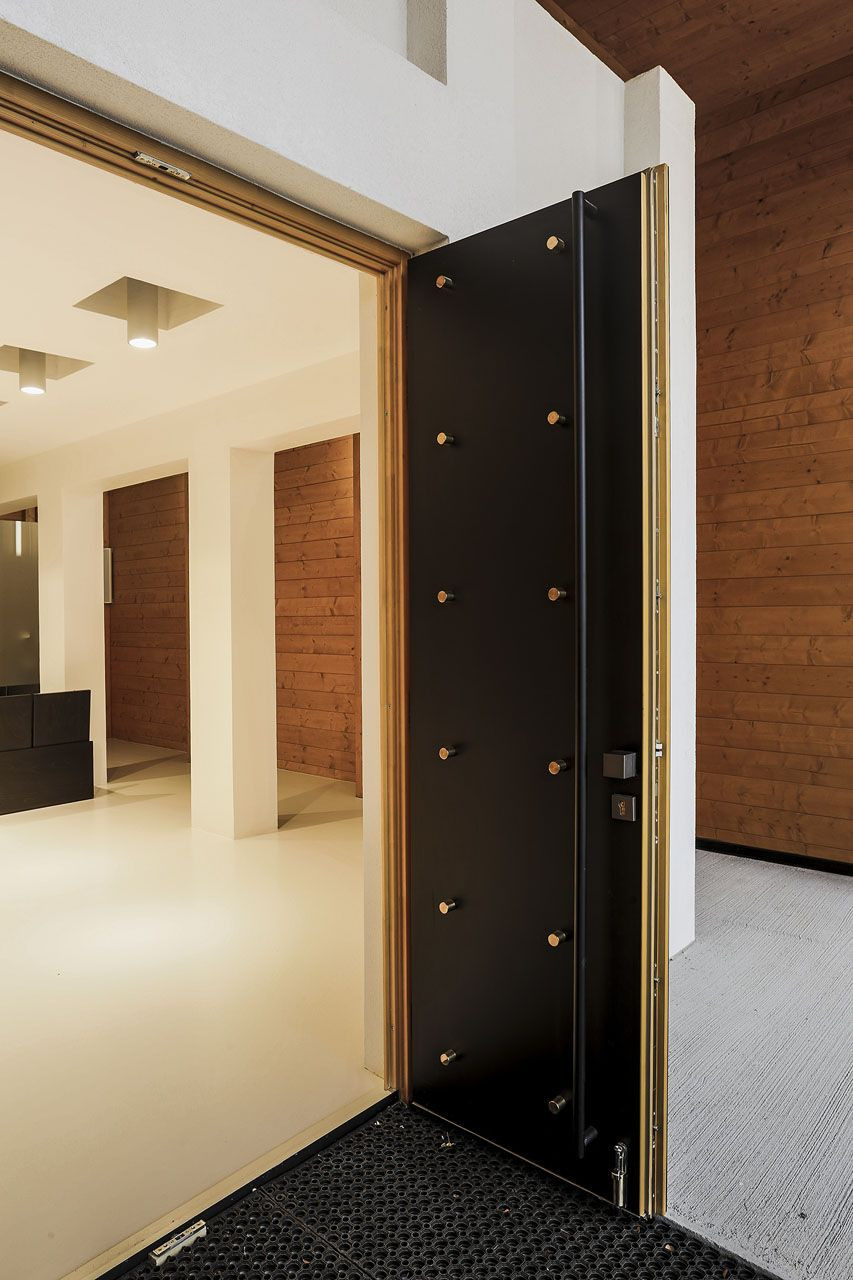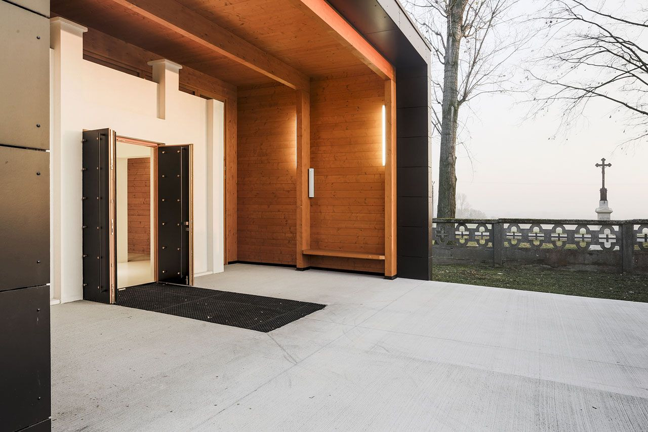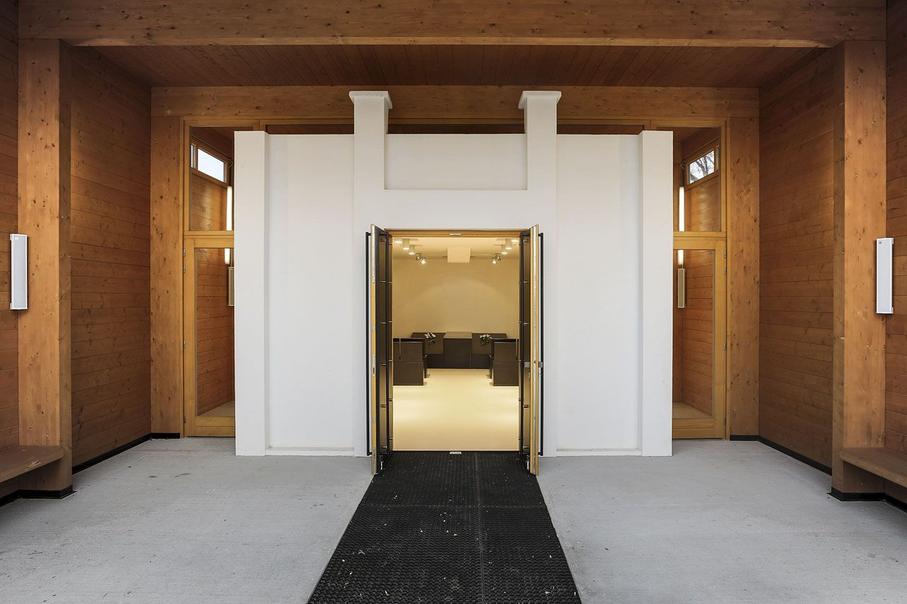 Zachován byl rovněž zajímavě řešený portál, který byl citlivě zakomponován do vstupní části obřadní síně v návaznosti na novou prosklenou stěnu. Hlavní vstup do obřadní síně je zvýrazněn dominantním závětřím. Zděnému portálu navíc dominují dřevěné hlavní vstupní dveře, obložené černým ocelovým plechem kotveným mosaznými nýty. Matná černá barva vstupních dveří koresponduje s černým odstínem fasádních obkladových desek, které při příchodu do smuteční síně rámují závětří a pokračují na dalších plochách fasád.
