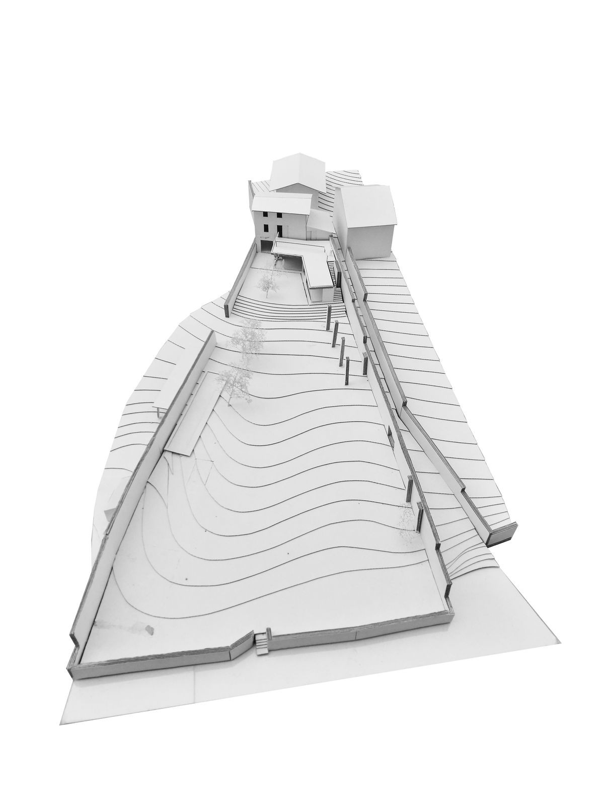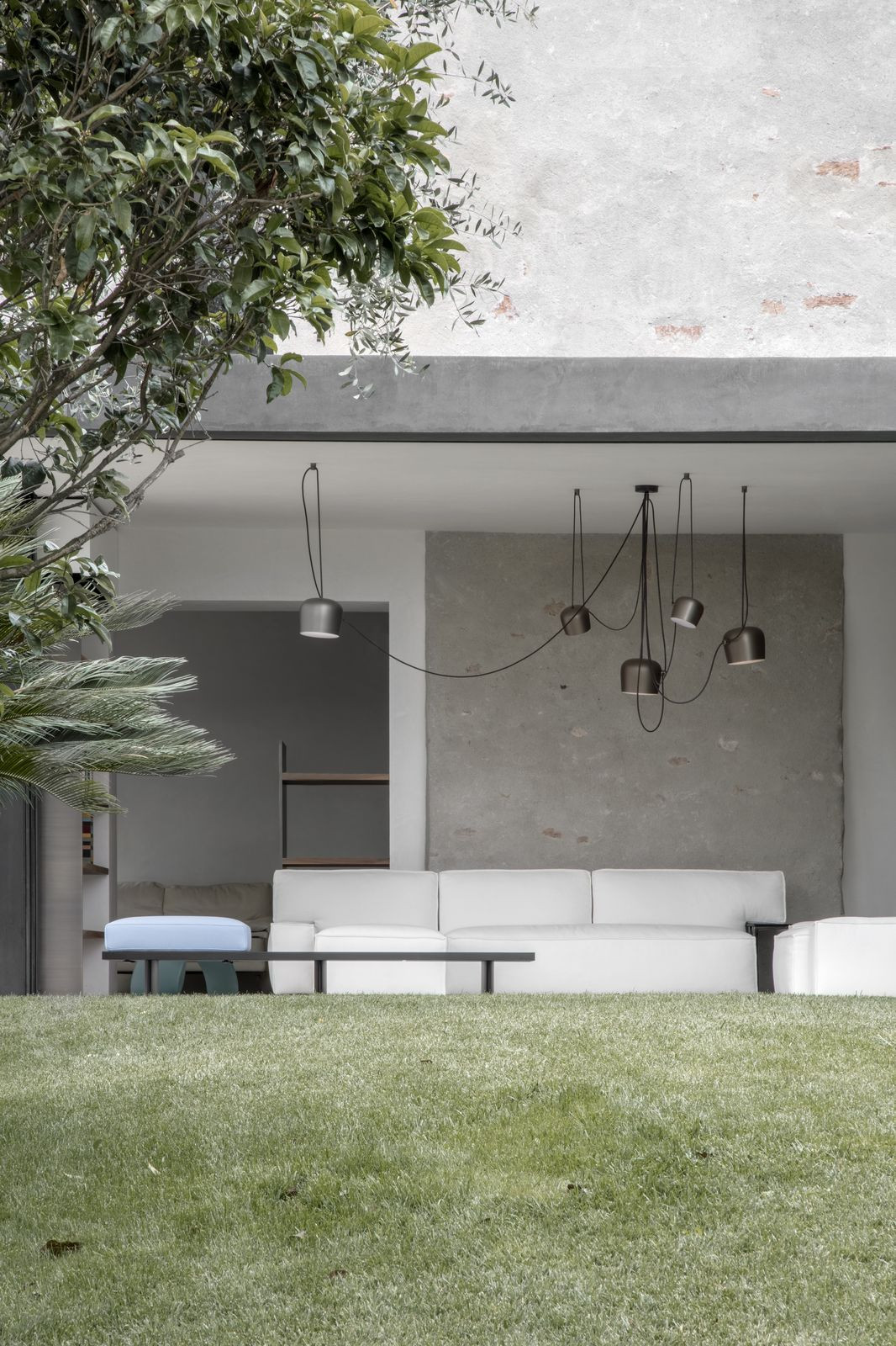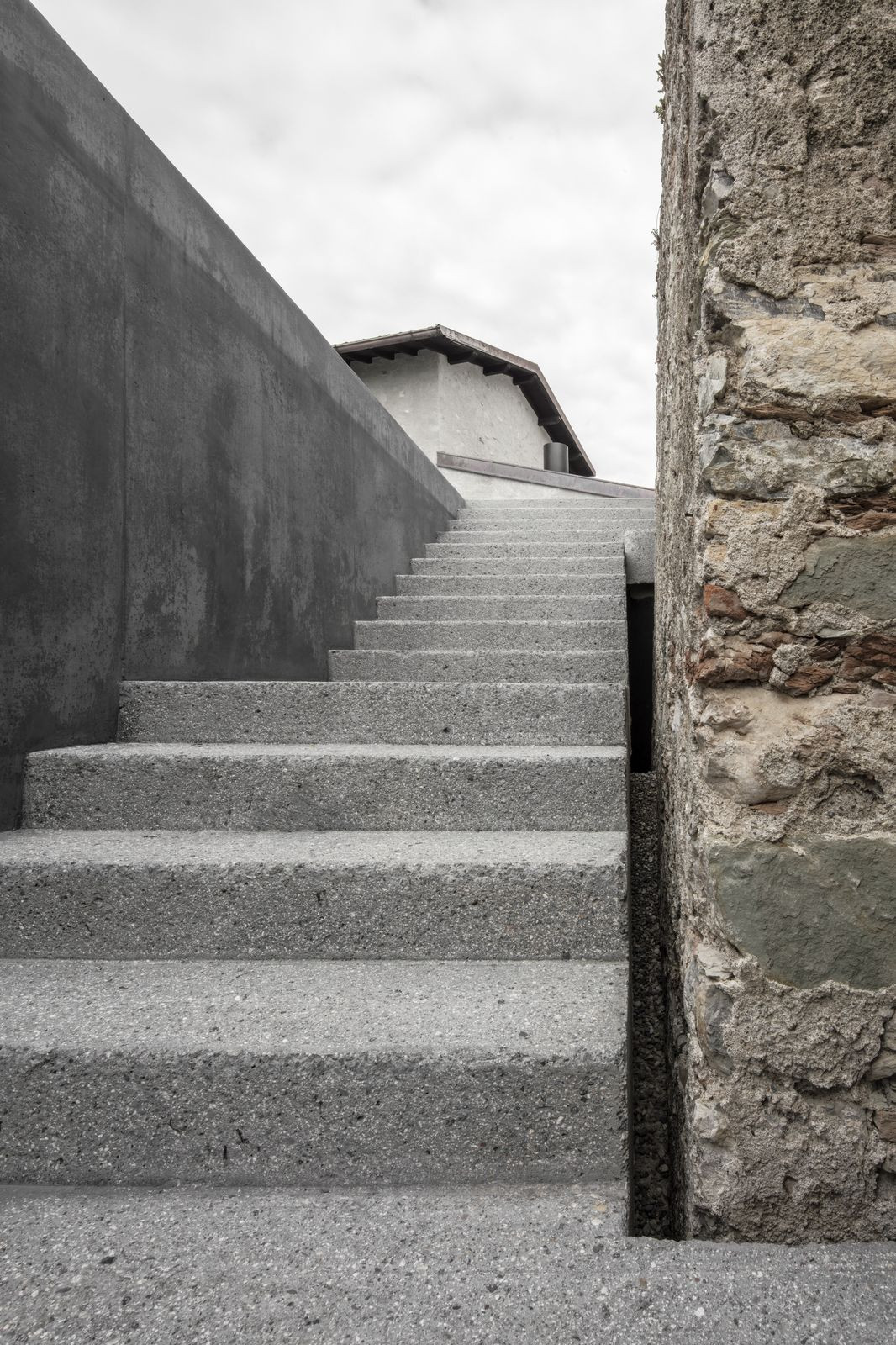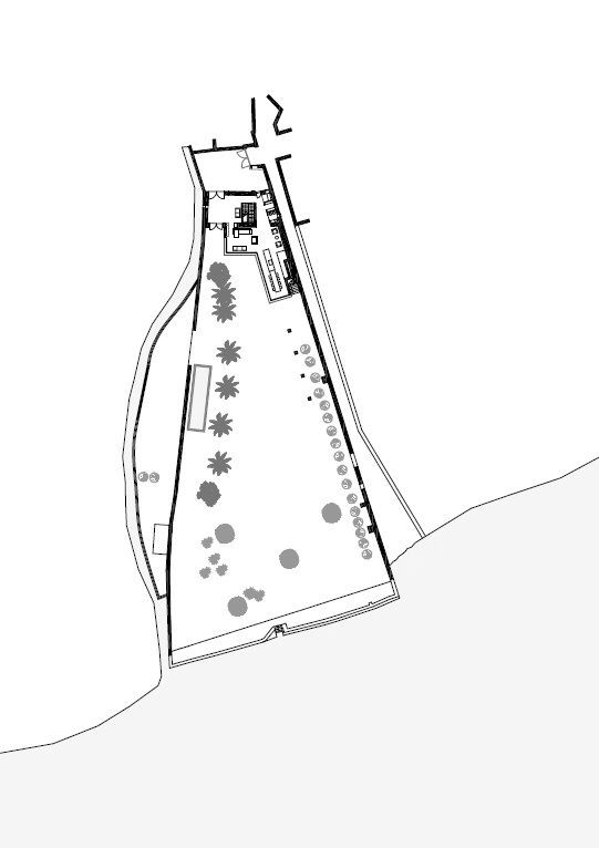 Na terasu nad přístavbou lze vystoupat po venkovním schodišti, které spojuje stávající budovu se zahradou. Povrchy z barveného betonu vytvářejí komplementární vztah s původní omítnutou kamennou fasádou. Přístavba se odděluje od stávající budovy a opět objevuje prostřednictvím intersticiálních prostorů. Bazén je umístěn na zahradě mezi sadem citronovníků a stoletými palmami.