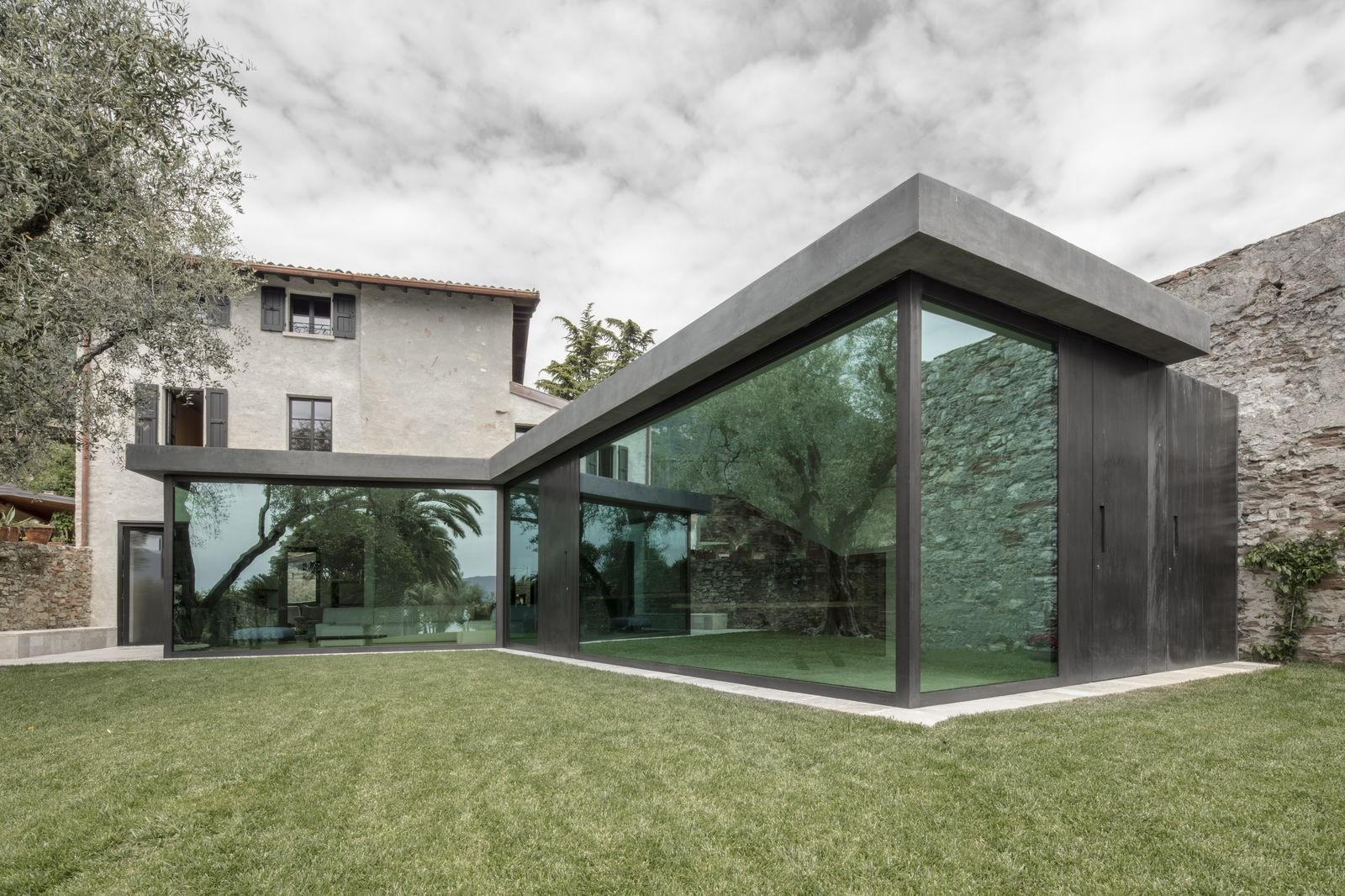Moderní přístavba u tradičního italského domu na břehu Gardského jezera se díky rozměrným posuvným oknům může v okamžiku zcela propojit se zahradou, které dominují citronovníky a stoleté palmy.