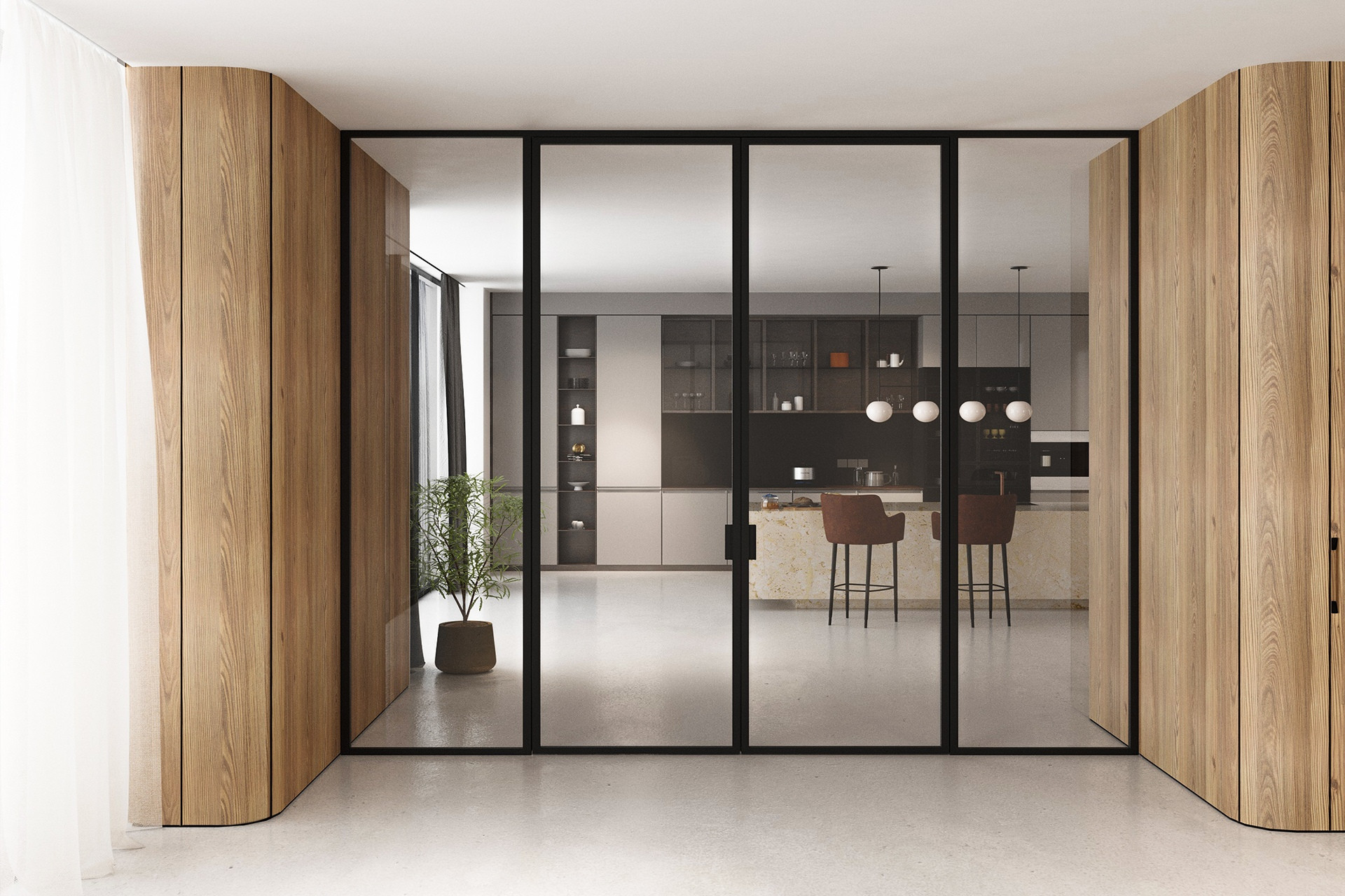 Kromě plně průhledného skla nabízí Dorsis také designová skla s různými vzory a úrovněmi průhlednosti. To umožňuje architektům jemně regulovat míru vizuálního propojení prostor – od plné transparentnosti až po pouhé naznačení přítomnosti světla za příčkou.