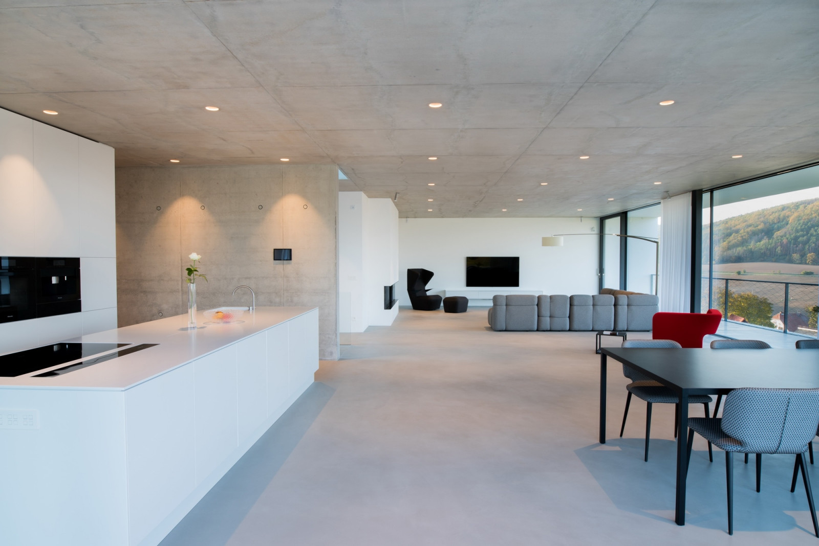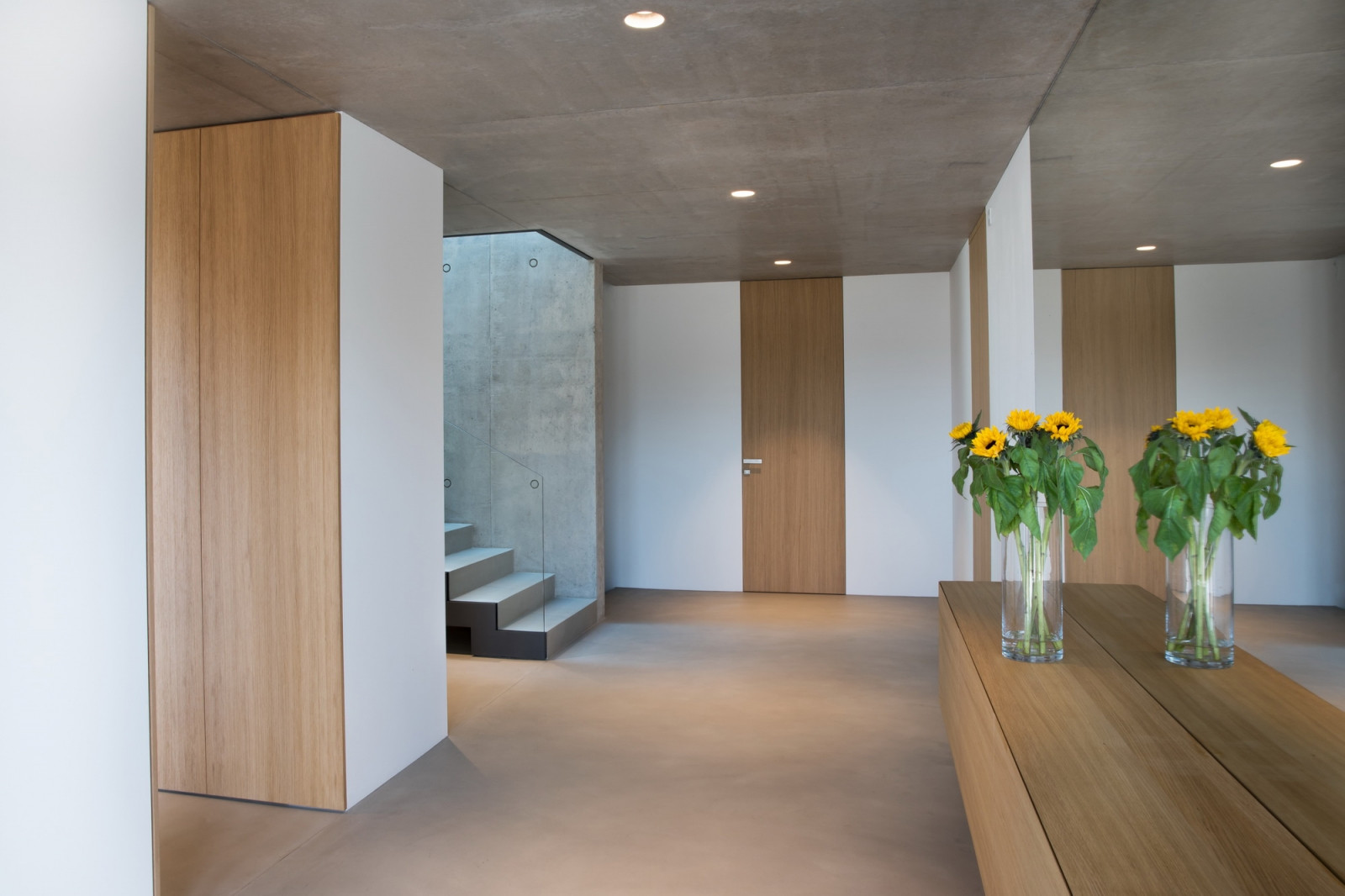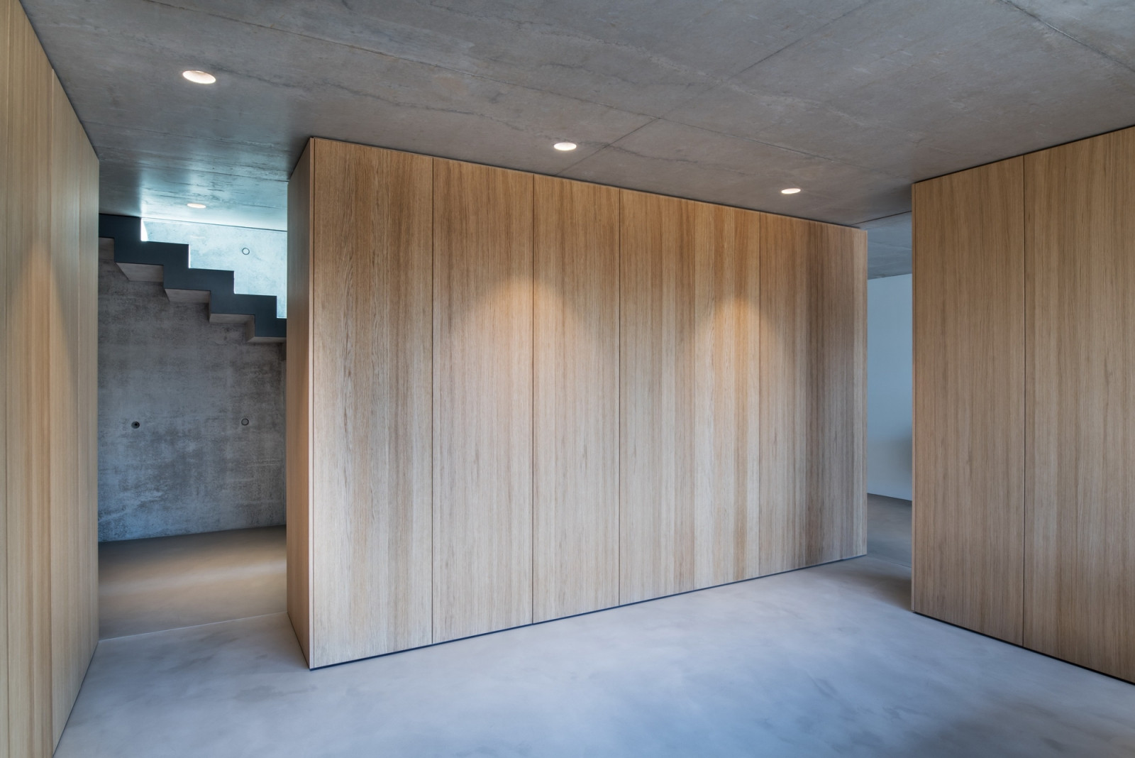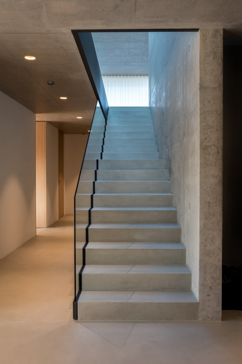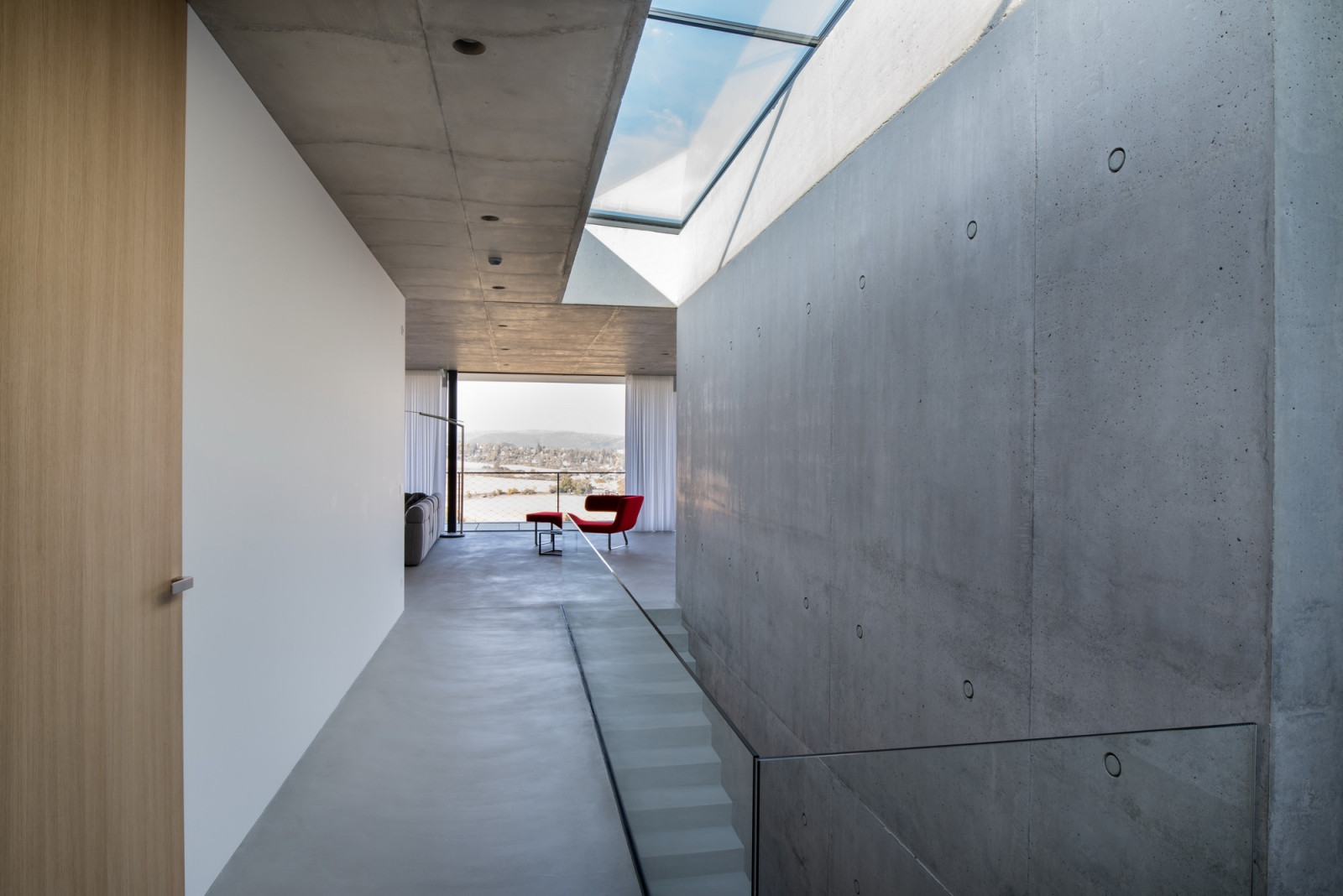 Aby se mohlo hlavní obytné patro otevřít do zahrady, nechal architekt veškeré zázemí domu včetně garáže a apartmá pro hosty umístit do suterénu s vazbou na ulici. Odtud pak stoupá schodiště a výtah do přízemí, které je v celé své horizontální rovině věnováno hlavnímu bytu majitelů. Prosvětlený interiér domu je řešen velmi jednoduše – bílé stěny doplňuje pohledový beton stropu a schodiště. Hlavní roli zde totiž hrají výhledy do okolí.