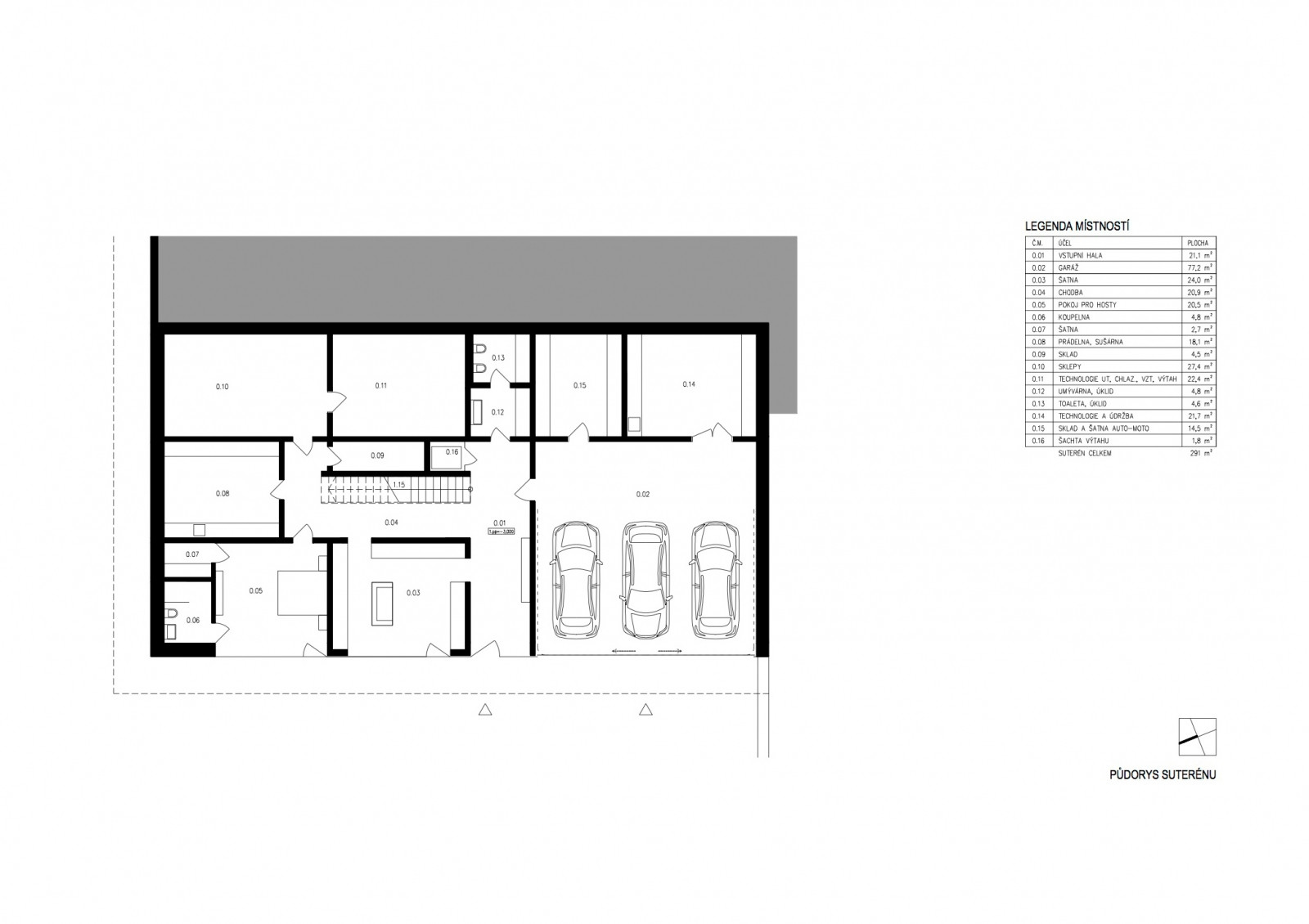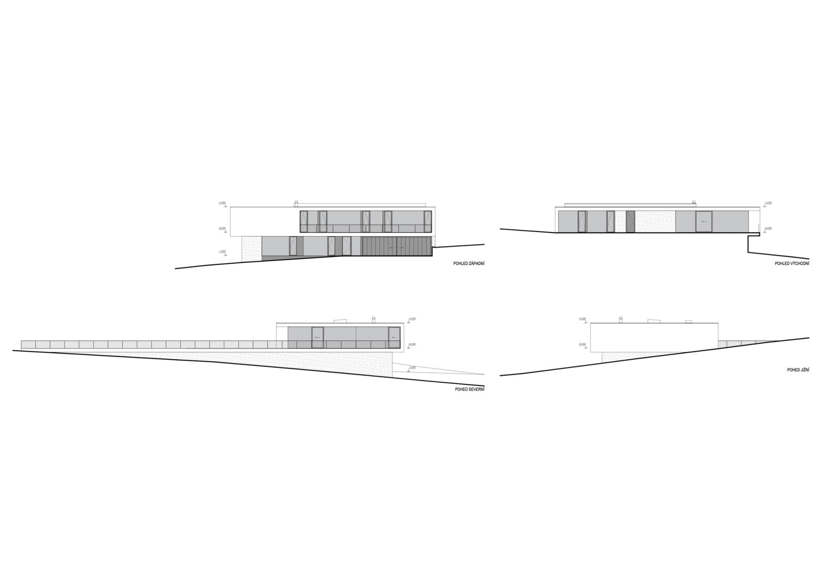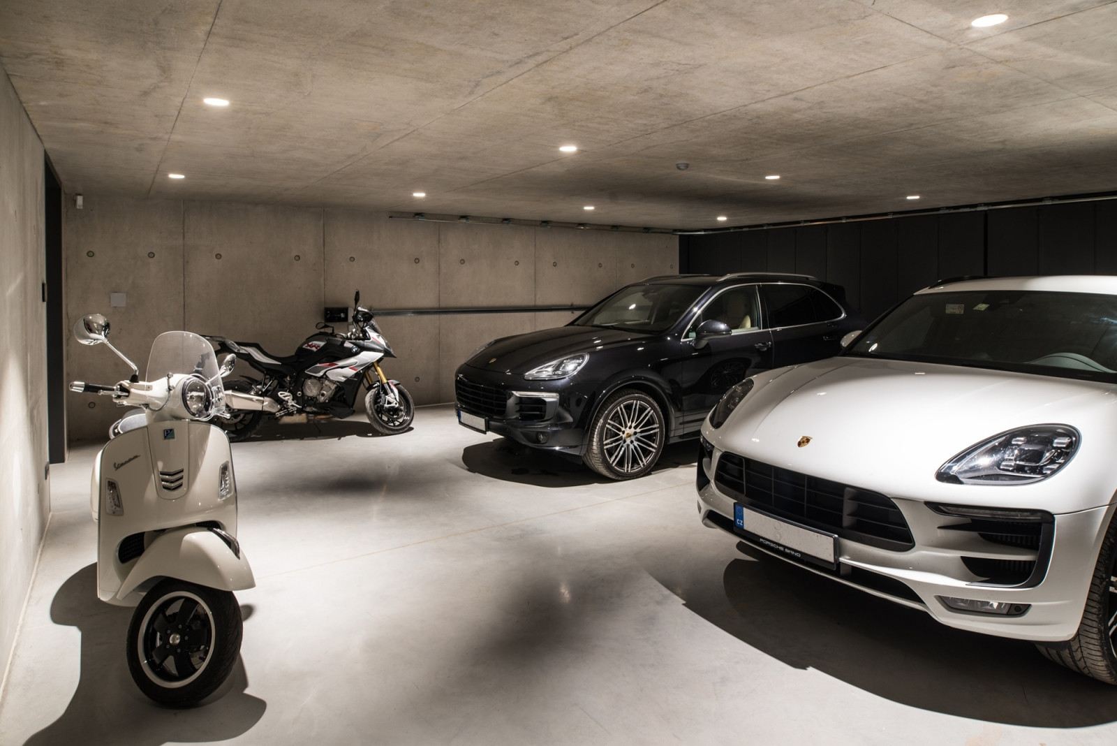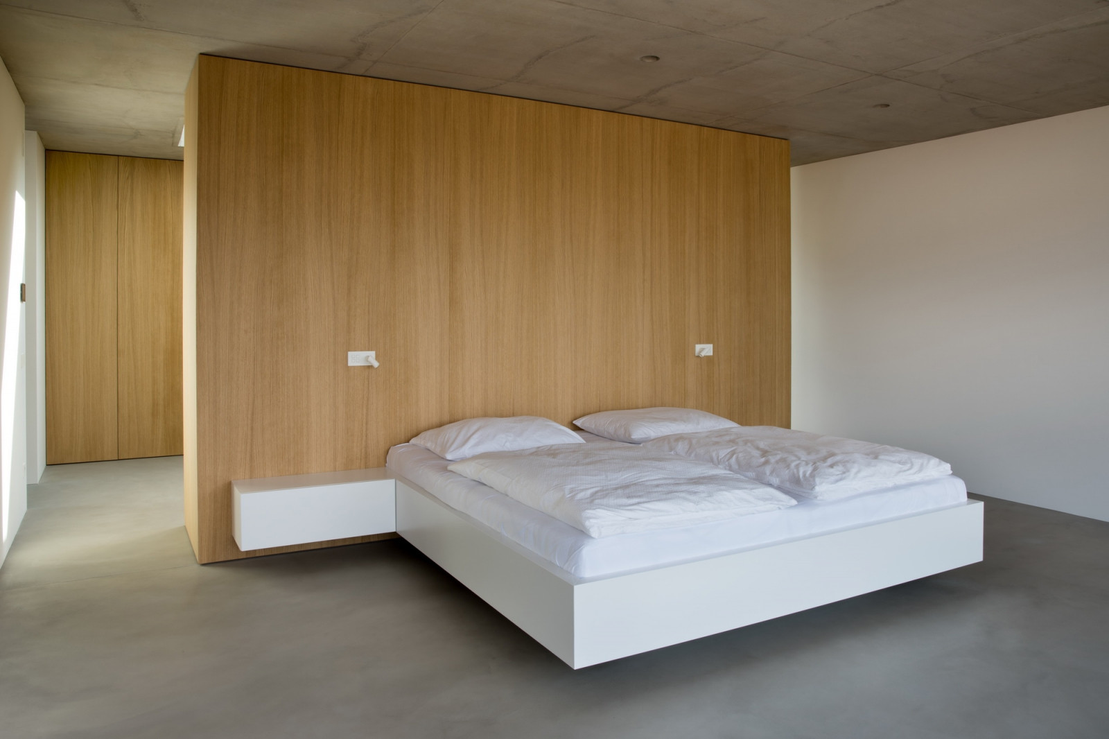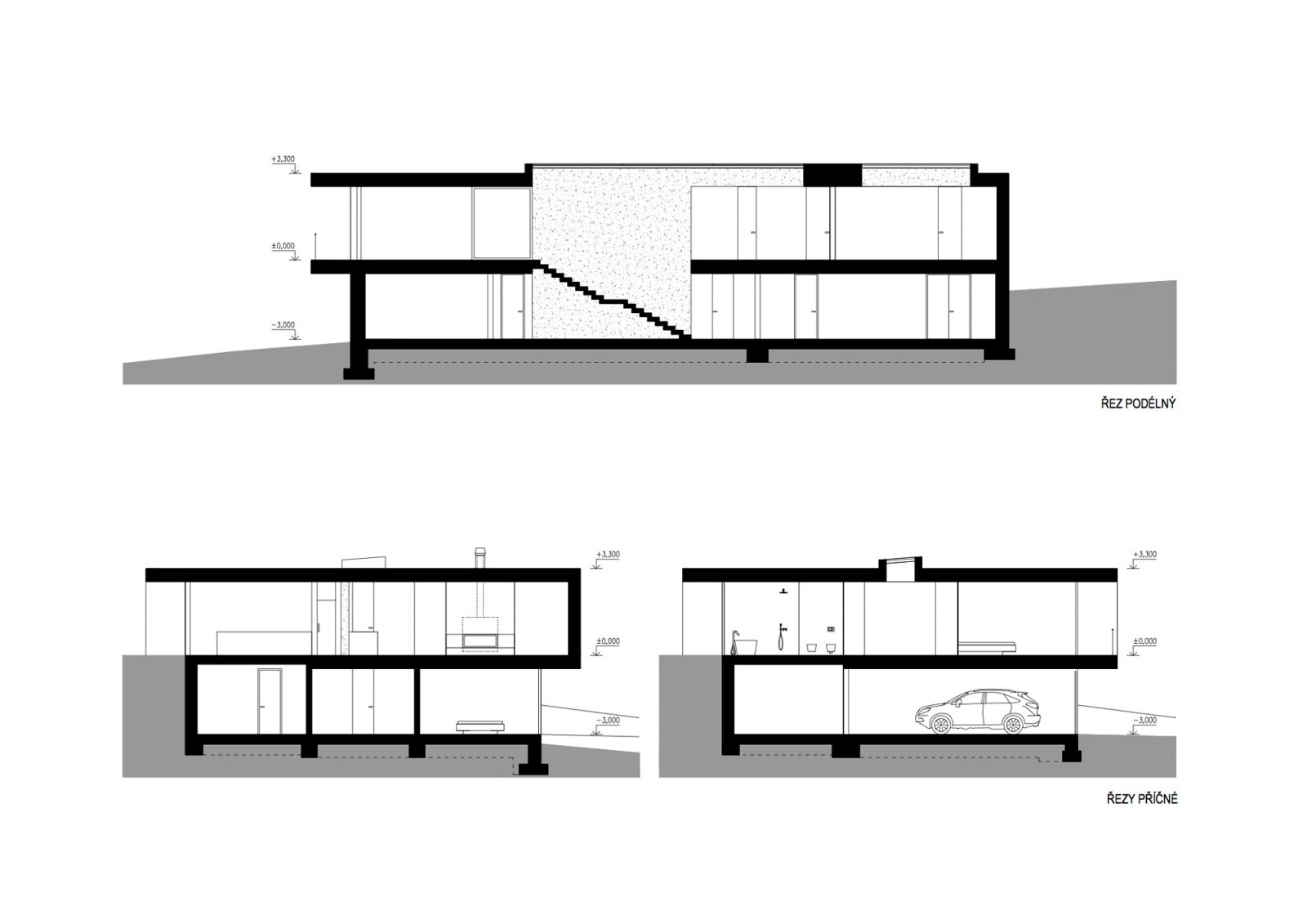 Aby se mohlo hlavní obytné patro otevřít do zahrady, nechal architekt veškeré zázemí domu včetně garáže a apartmá pro hosty umístit do suterénu s vazbou na ulici. Odtud pak stoupá schodiště a výtah do přízemí, které je v celé své horizontální rovině věnováno hlavnímu bytu majitelů. Prosvětlený interiér domu je řešen velmi jednoduše – bílé stěny doplňuje pohledový beton stropu a schodiště. Hlavní roli zde totiž hrají výhledy do okolí.