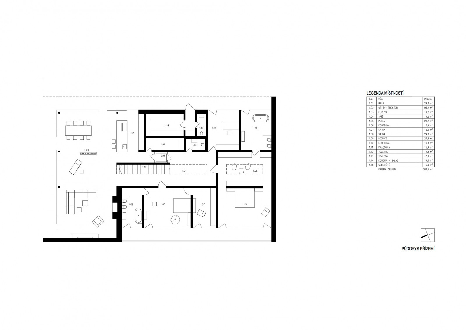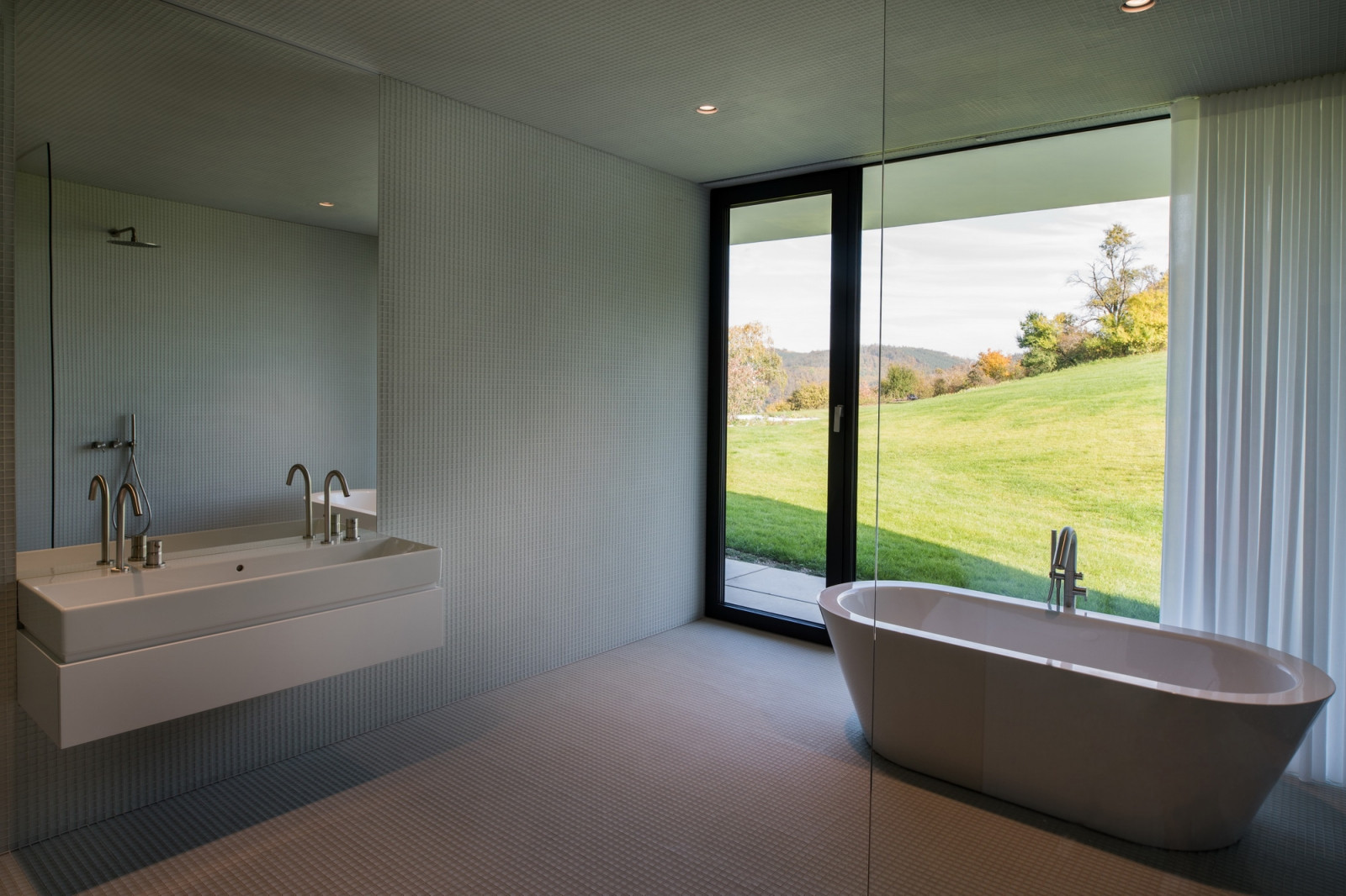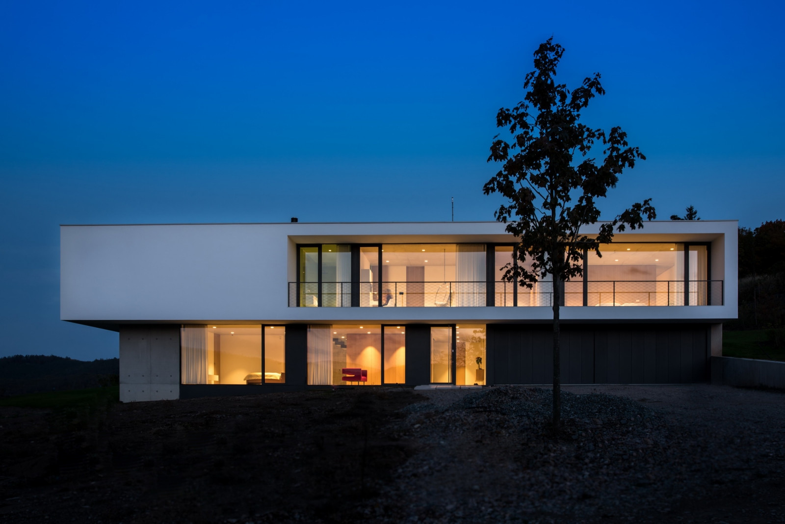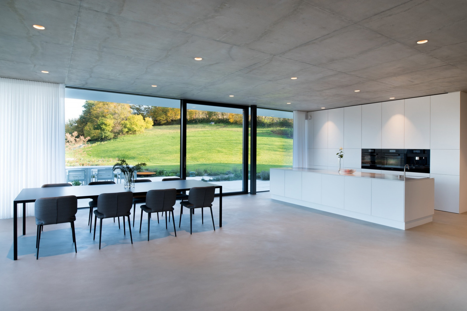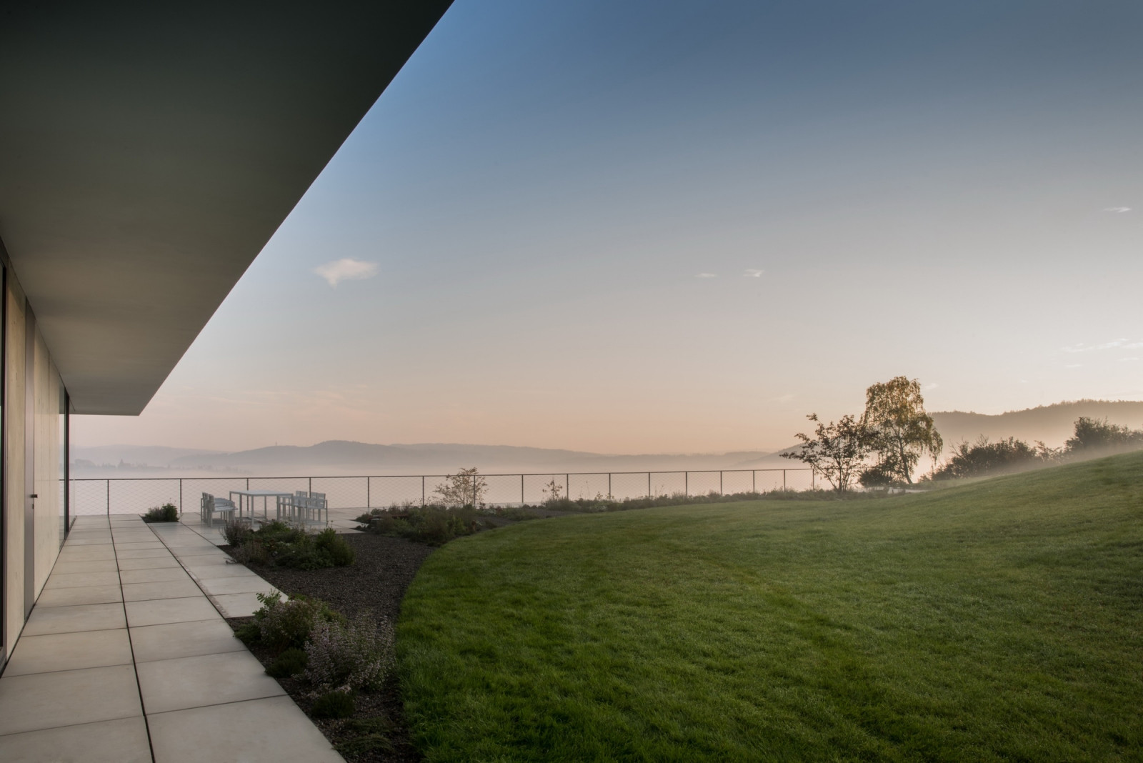 Přízemí je vizuálně propojeno se zahradou díky celoproskleným stěnám od podlahy ke stropu, které umožňují také pohodlný přímý vstup na krytou terasu ze všech obytných místností domu. Pro rozměrná fixní a otvíravo-sklopná okna využil architekt systém Schüco AWS 75-SI. „Pro každou místnost je proto komponován jedinečný výhled, který architektura pouze rámuje. Nikdy nekončící, dynamická proměna přírody dům naplňuje,“ komentuje svůj návrh architekt.