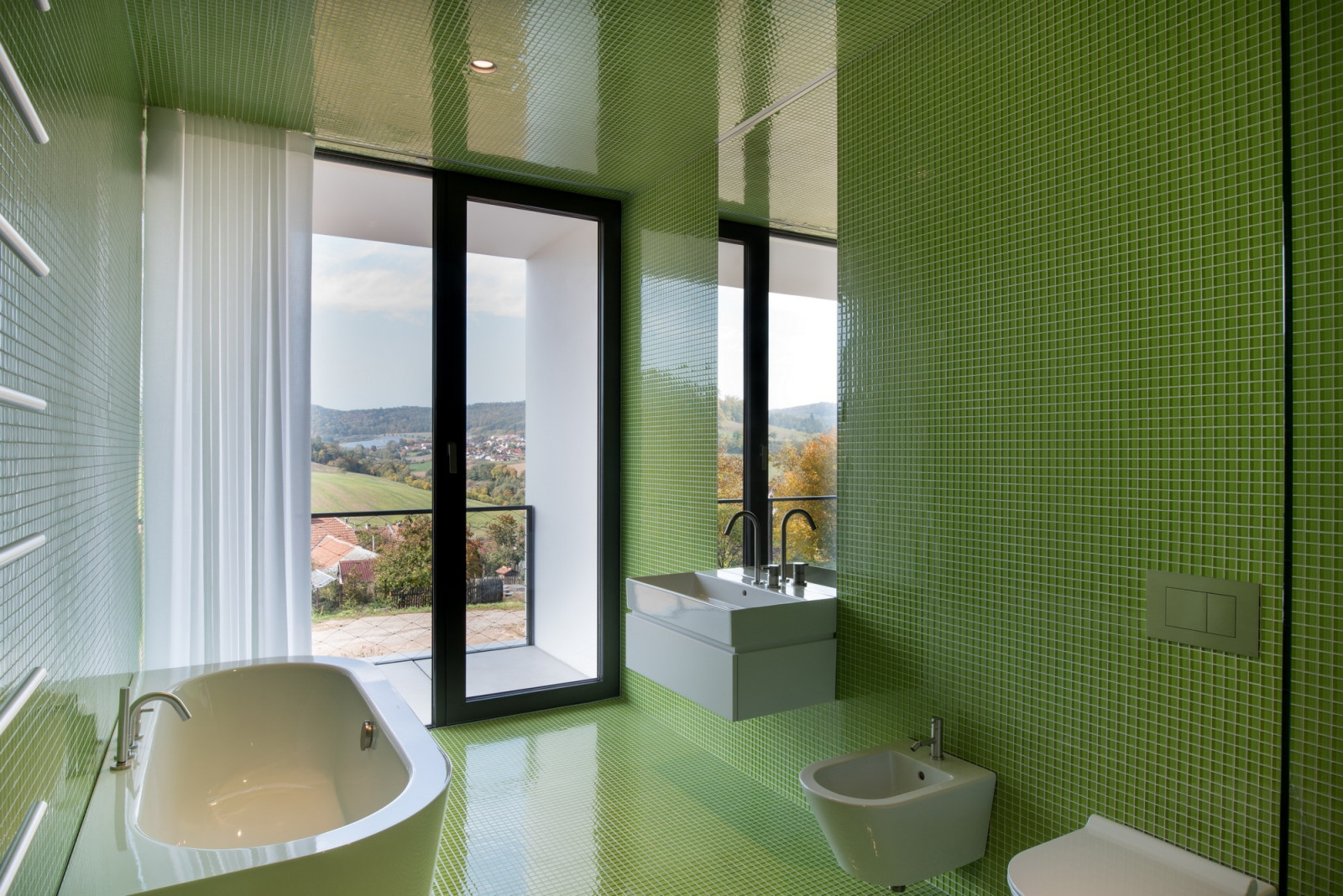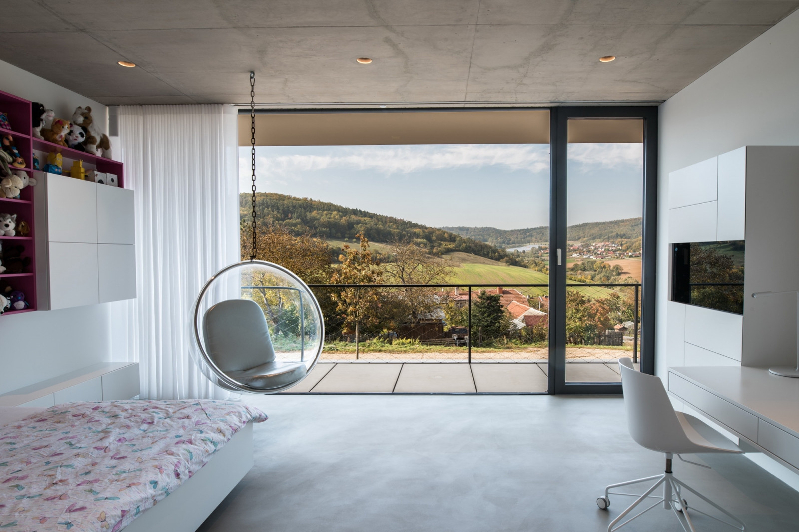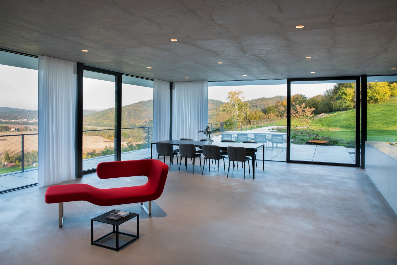 Cíl architekta Martina Klimeckého byl jasný – vizuálně i fyzicky maximálně propojit interiér rodinného domu s jeho přírodním okolím. Dům totiž stojí na svažitém pozemku, odkud se otevírají daleké výhledy do krajiny. Díky proskleným stěnám od podlahy ke stropu si mohou majitelé tyto scenérie užívat z pohodlí svého domova.