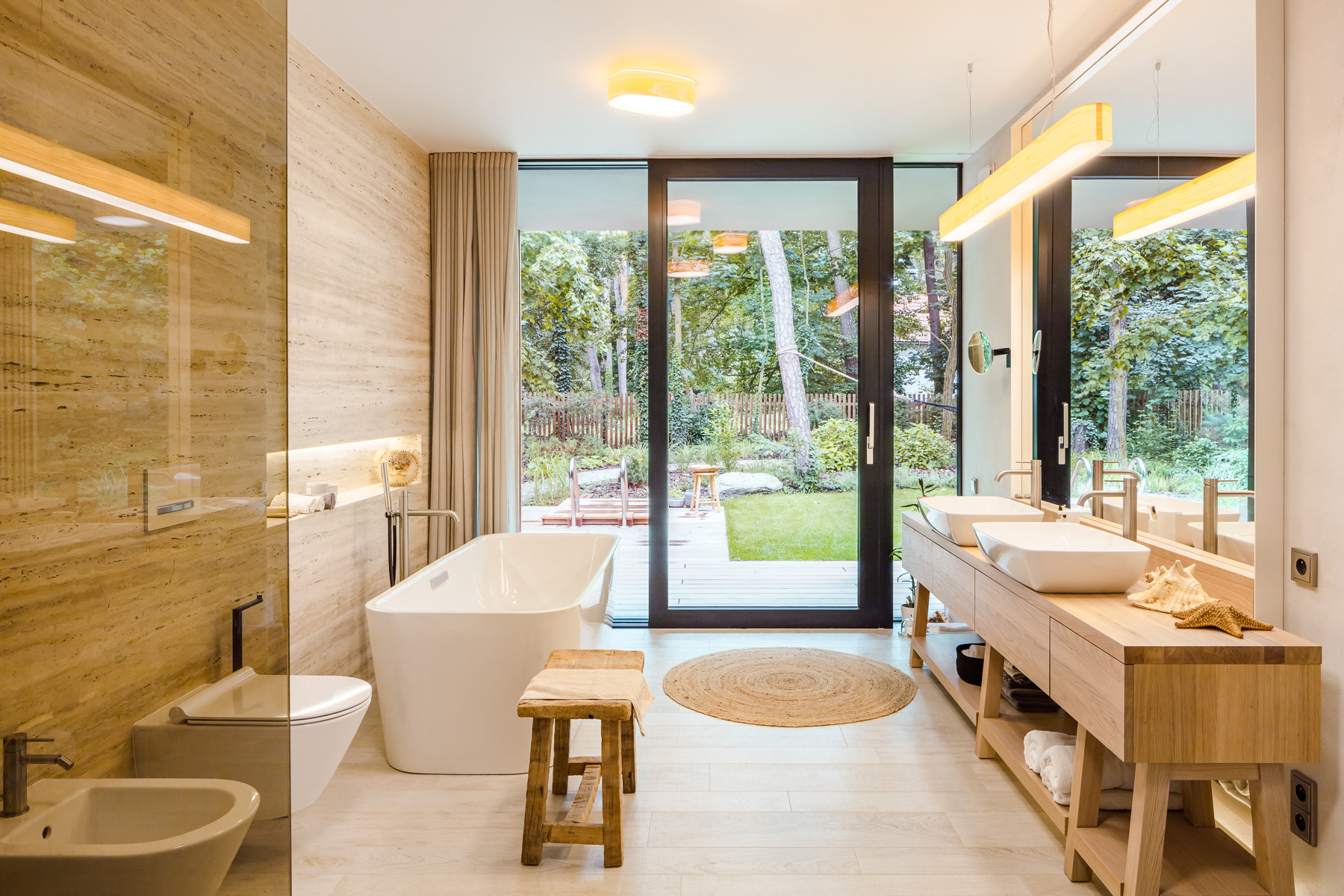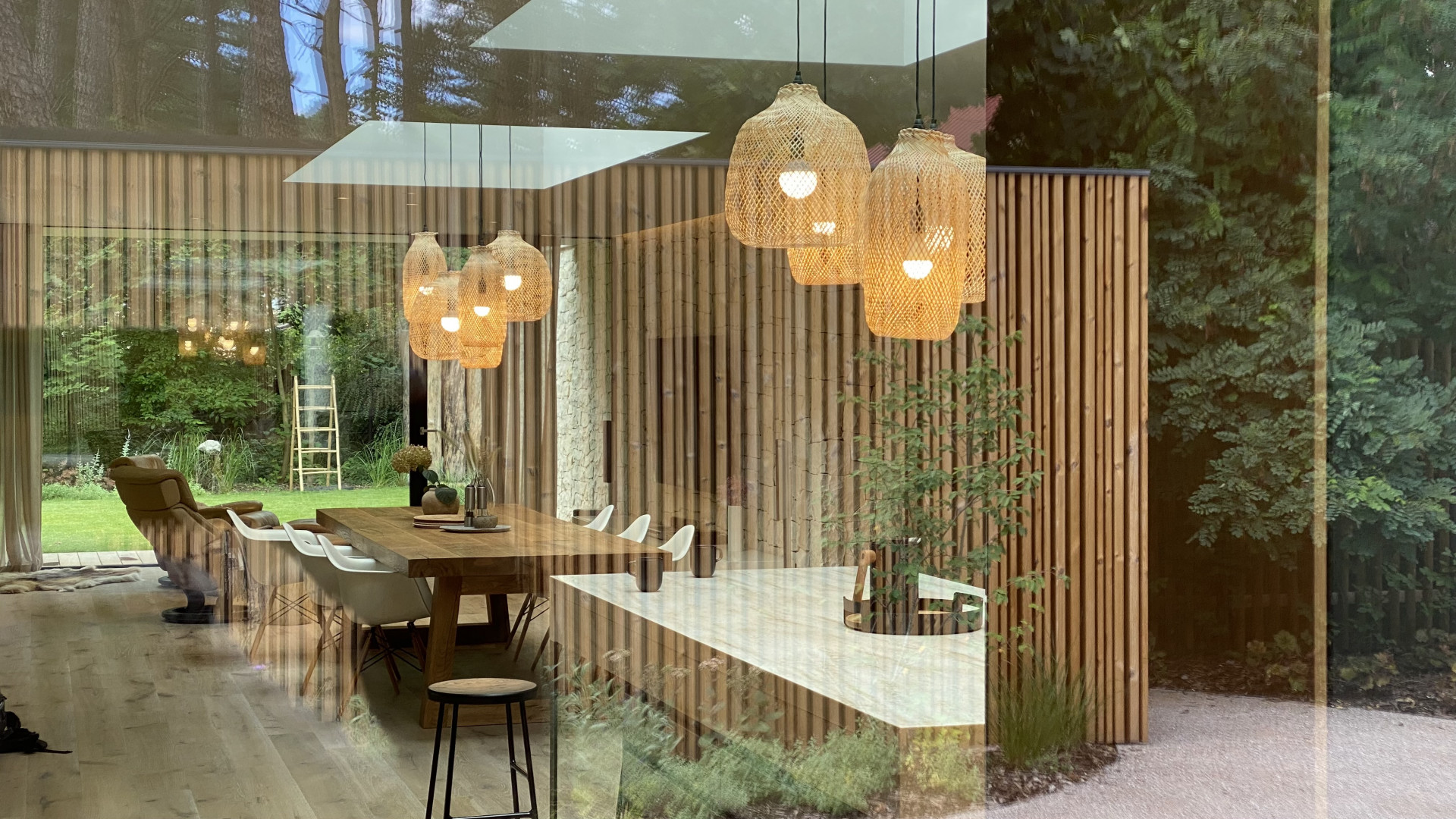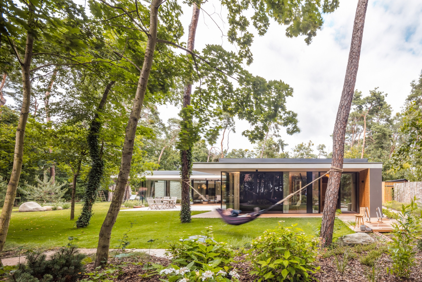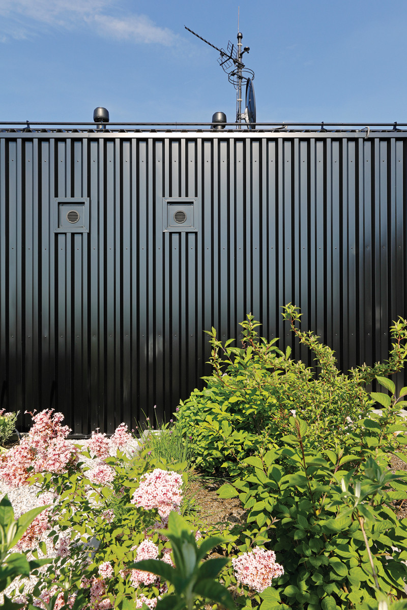 Zcela klíčový aspekt pro celý architektonický koncept domu nicméně představuje propojení bydlení se zahradou. Toho architekti dosáhli pomocí rozměrných oken od podlahy ke stropu, která doslova stírají hranici mezi interiérem a exteriérem. „Z našeho pohledu architektů se nám tímto domem podařilo zatím nejlépe zhmotnit naši představu o bydlení na zahradě, venku,“ uzavírají architekti.