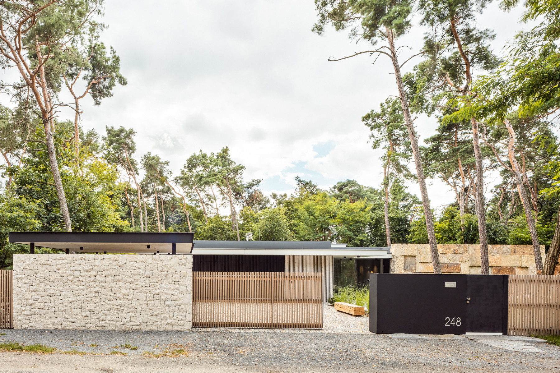 Velkou předností pozemku jsou vysoké borovice rostoucí na pozemku, které místu poskytují jedinečnou, až meditativní atmosféru. Klienti požadovali přízemní a bezbariérový dům, který by plně využil všechny tyto přednosti a architekti jej navrhli právě s ohledem na všechna specifika lokality.