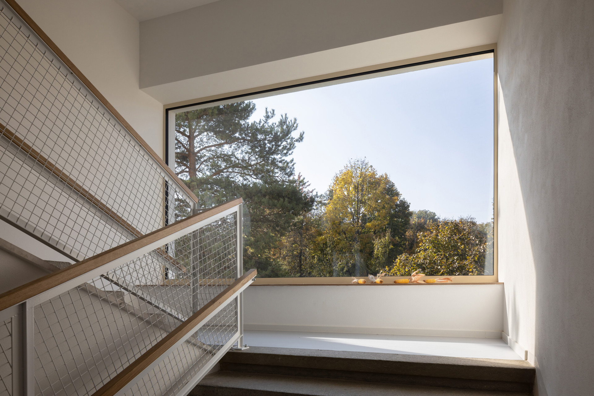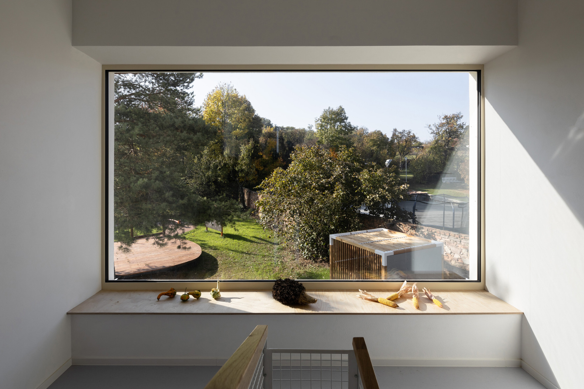 Budova mateřské školy se do ulice obrací jako jednoduše členěný patrový objekt, směrem do zahrady je její silueta členitější. Utváří ji schodišťová věž, jejíž stěnu nechali architekti prolomit velkoformátovým oknem. V interiéru za sklem opět navrhli široký parapet, na který si děti dnes vystavují své výrobky. „Parapet je výborný, děláme si na něm výstavky, škoda jen, že kvůli speciálnímu sklu nemůžeme na okno nic lepit,“ dodávají učitelky.